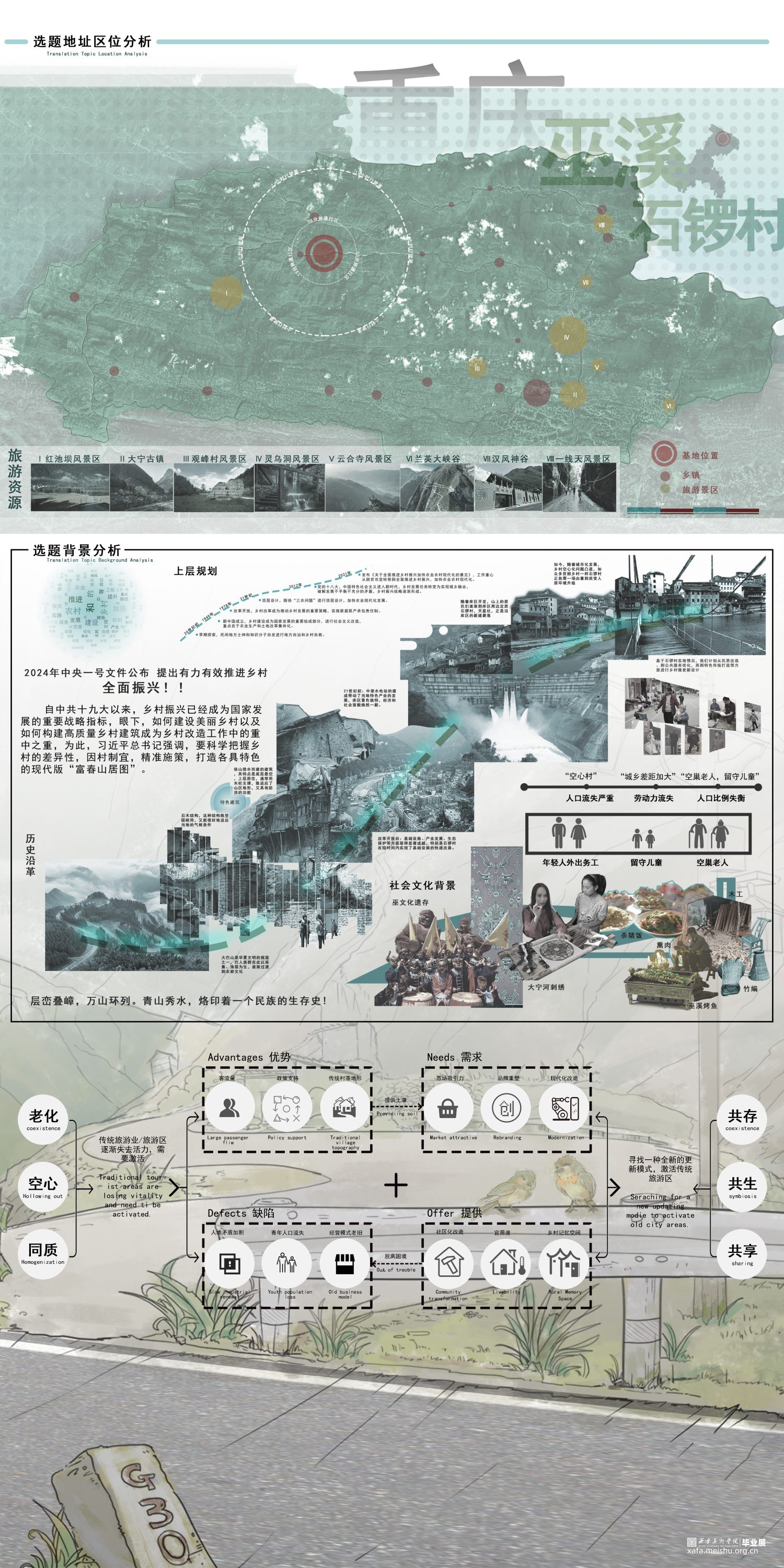 随着我国城镇化进程的加速,城市化已成为推动社会进步的关键因素。然而,农村地区的发展步伐却显得相对缓慢。农村地区,作为我国人口的重要组成部分,面临着居住环境不佳、基础设施建设滞后、公共服务水平不足以及文化建设相对落后等问题。这些问题导致许多农村居民选择离开家乡,前往城市寻求更好的生活机会,使得许多传统农村地区面临人口流失和文化衰退的双重困境。本研究的目的是提出一套微更新设计策略,这些策略旨在为石锣村量身定制,以促进文化遗产的保护和社区的可持续发展。