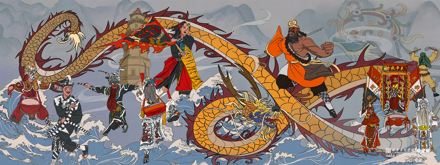插画在制作过程中遵循了一定的队列出场结构,以《水浒》为背景,说的是梁山军攻破大名府救卢俊义的事。主要是描绘双方队伍互相打斗,攻破大名府救卢俊义的故事。在风格上与其他作品有所区分,跟现场的视频一起起到一个世界观背景的作用。希望能让大家在现场感受到传统与现代的相互碰撞。
