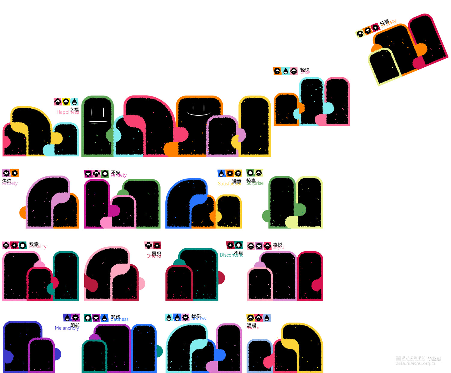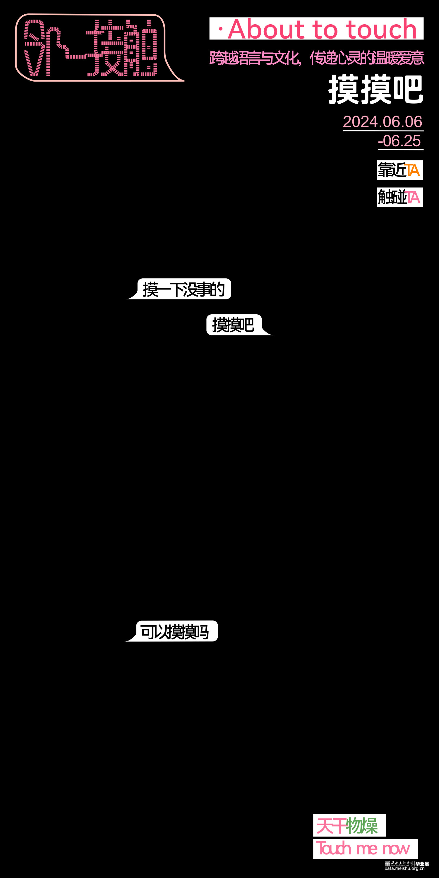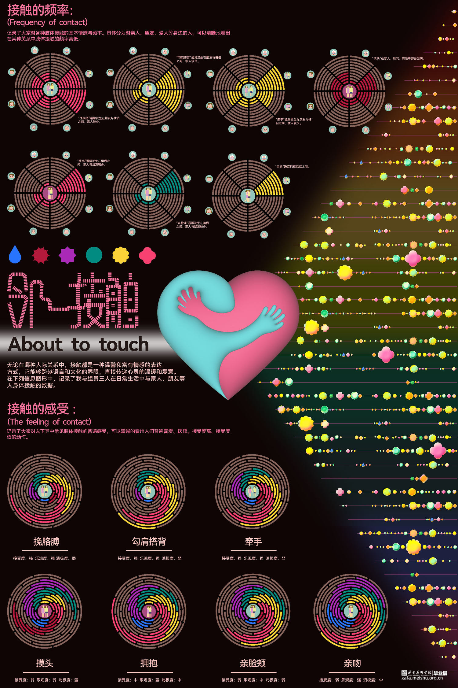 在数字化时代背景下,z时代青年普遍出现羞于表达、无法保持和促进良好的人际交流等情绪问题。通过“系统脱敏法”这一治疗方法得出的数据进行设计,提取出接触与情感之间的图形关系并进行视觉设计处理,更加直观体现爱与接触的重要性。通过我们的设计有助于提醒公众,让人们勇于通过身体接触表达爱,切身体会人与人之间的真实情感,保持真实的人际互动对个人和社会凝聚力具有重要意义。