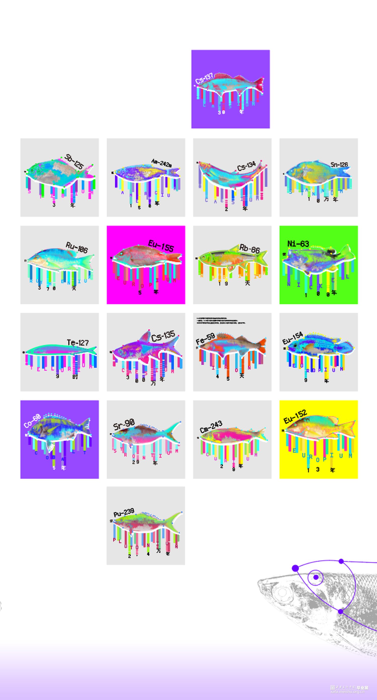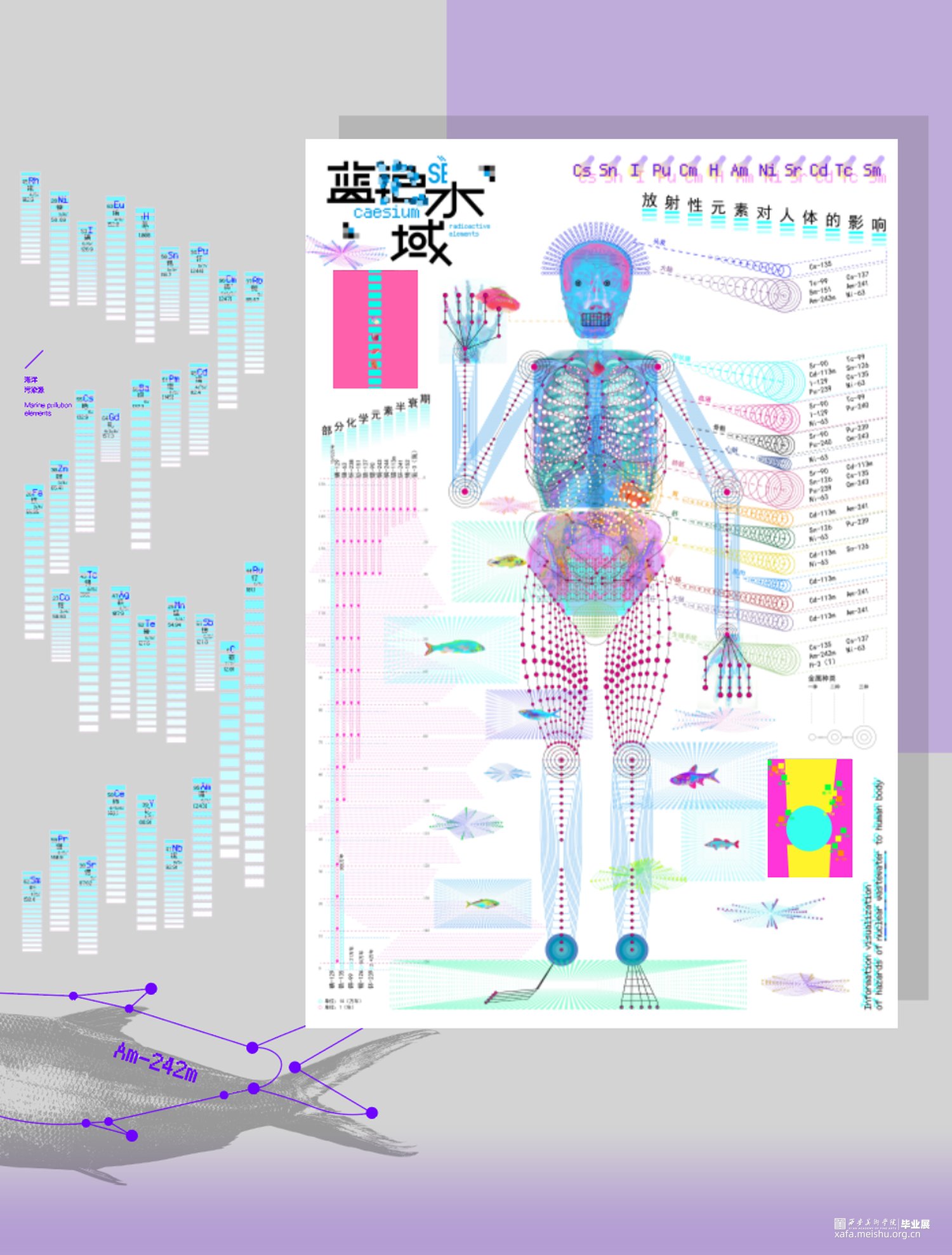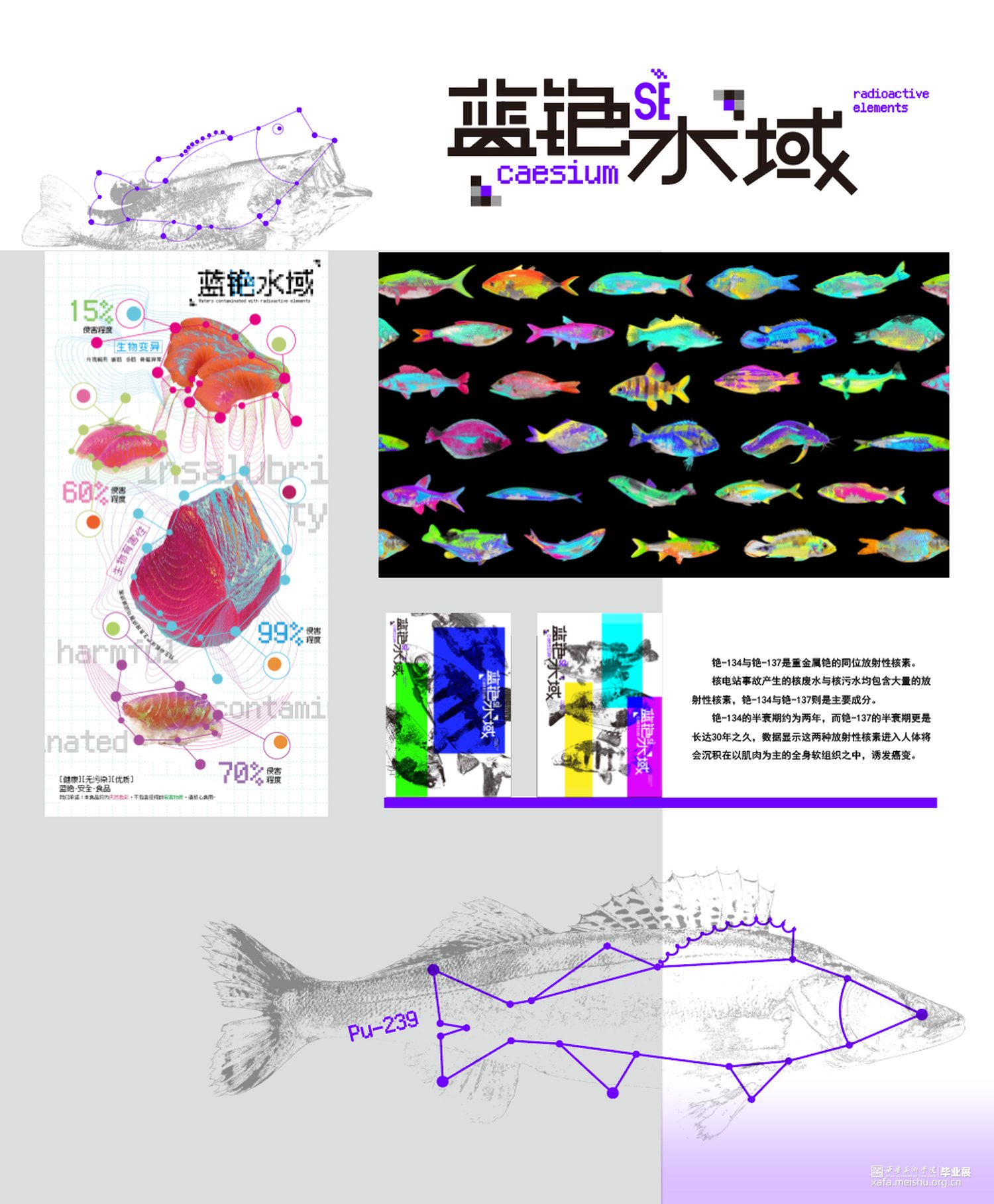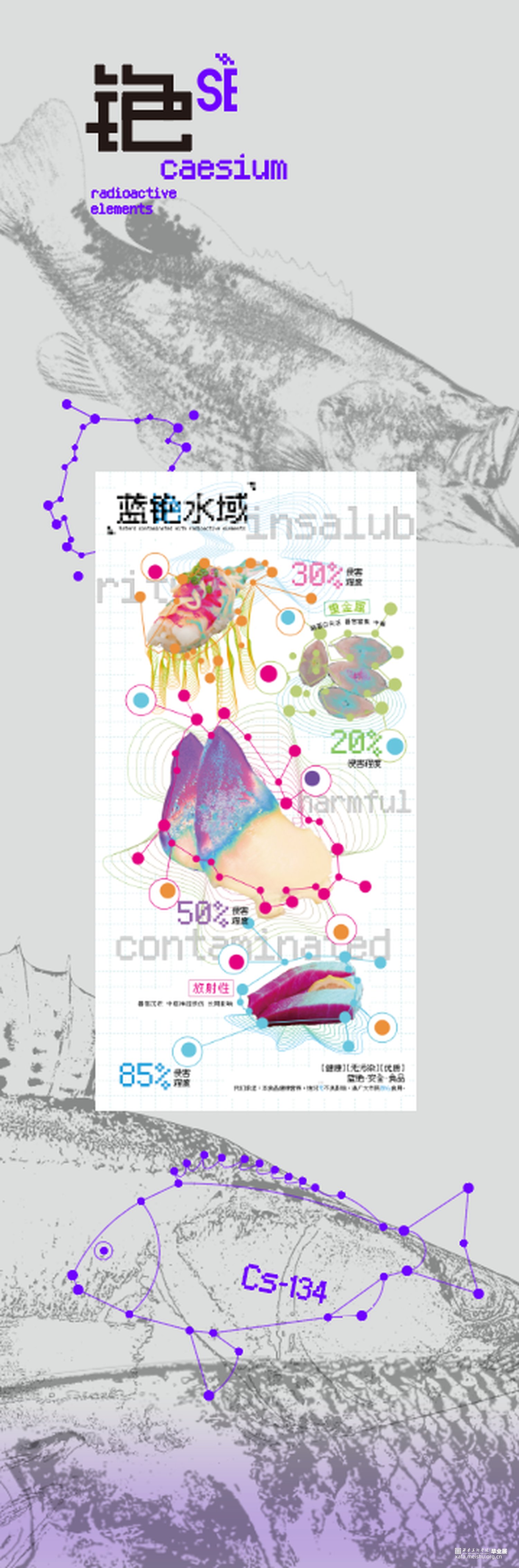 铯-134与铯-137是重金属铯的同位放射性核素,核电站事故产生的核废水与核污水均包含大量的放射性核素,铯-134与铯-137则是主要成分。铯-134的半衰期约为两年,而铯-137的半衰期更是长达30年之久,数据显示这两种放射性核素进入人体将会沉积在以肌肉为主的全身软组织之中,诱发癌变。而在去年的福岛地区有渔民捕捞到的鱼类,其体内铯的含量已超出了食用标准的180倍。题目“蓝铯水域”则是和“蓝色水域”相谐音,体现原本蔚蓝的海洋水域环境慢慢被“铯”元素充斥。
