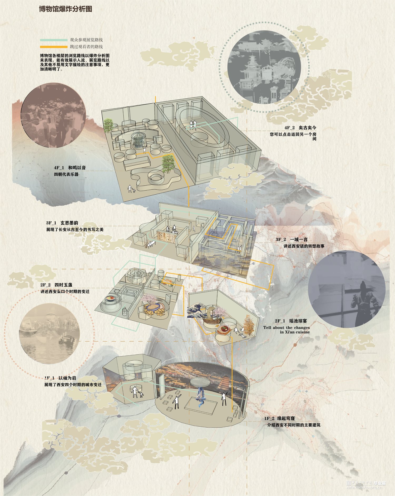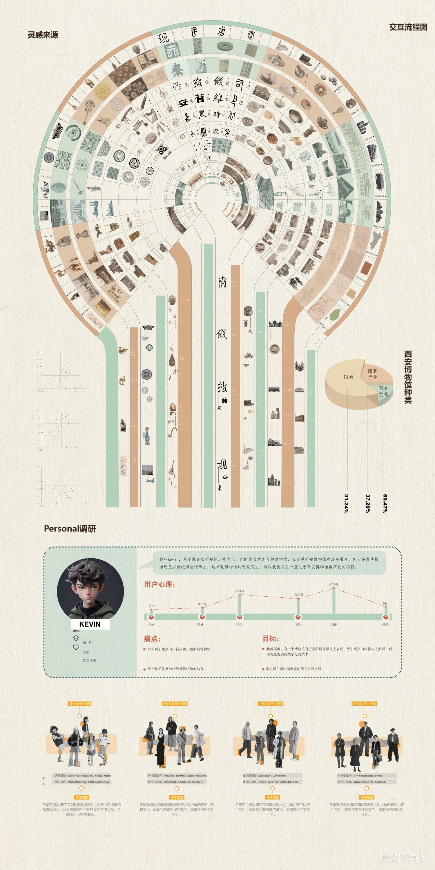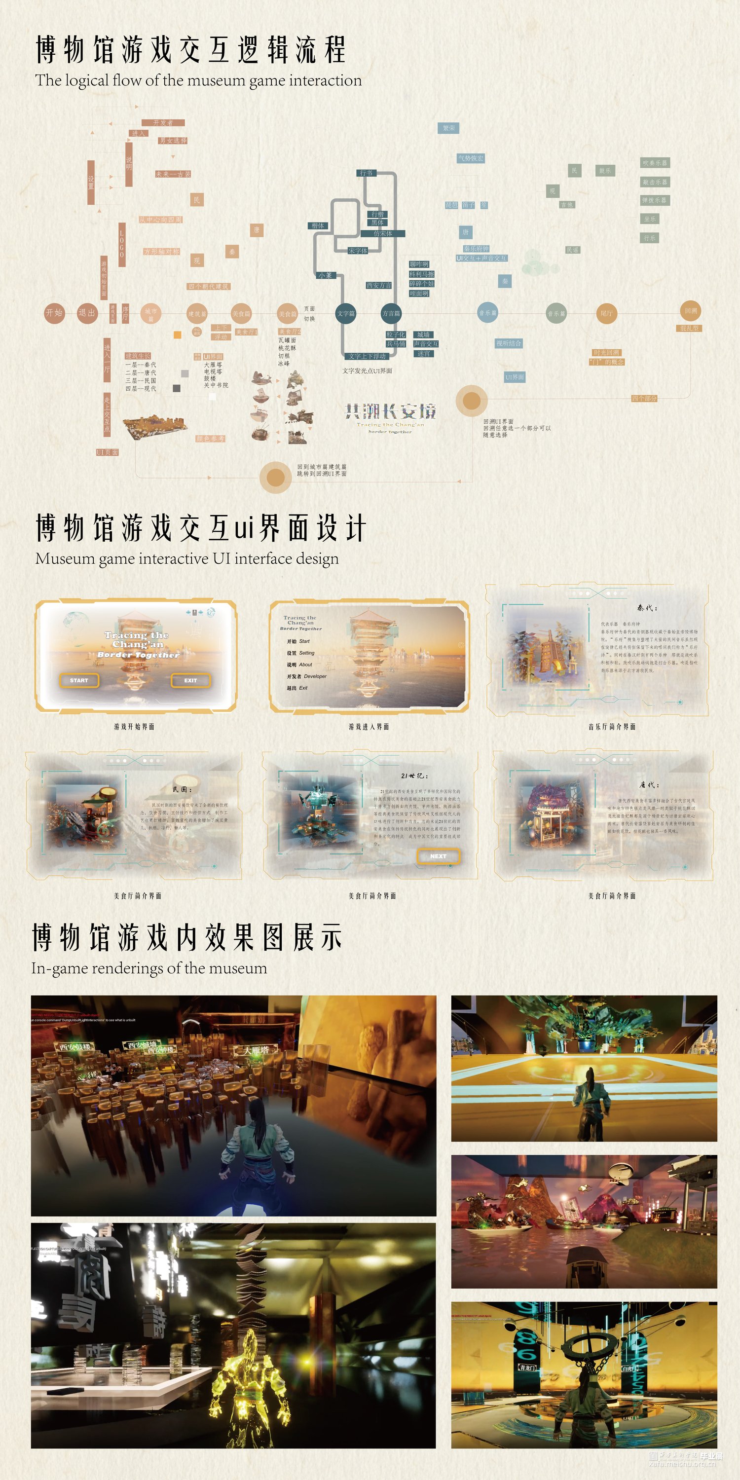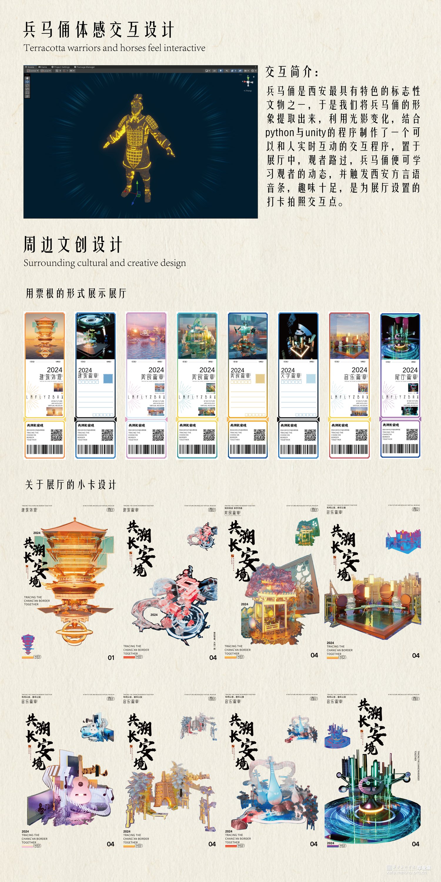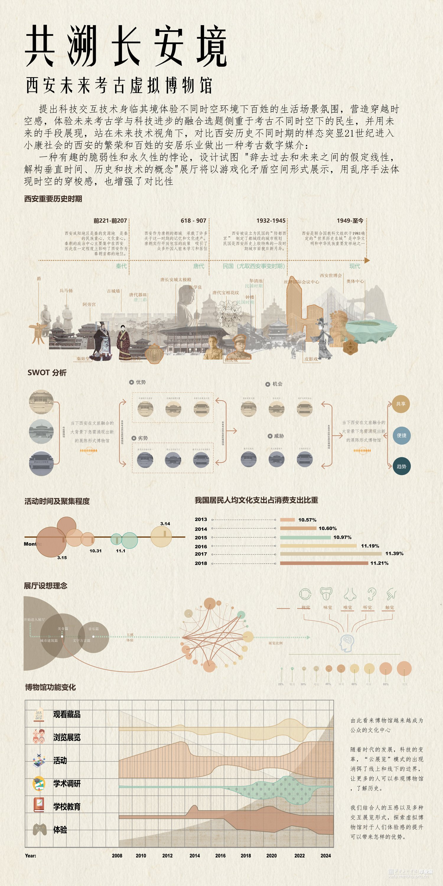 意图探索展示21世纪政策重要转折下小康社会的到来与样貌,科技交互技术身临其境体验不同时空环境下百姓的生活场景氛围,营造穿越时空感,体验未来考古学与科技进步的融合。侧重于考古不同时空下的民生,并用未来的手段展现,站在未来技术视角下,对比西安历史不同时期的样态突显21世纪进入小康社会的西安的繁荣和百姓的安居乐业。提出并应用概念时空穿梭交互手段探寻西安在秦朝、唐朝、民国时期与21世纪西安城市民生的变化走向,数字化全效赋能于探索古今对比,并不局限于某个点,而是块面儿化处理逻辑面积,范围性比对,代入感更强。
