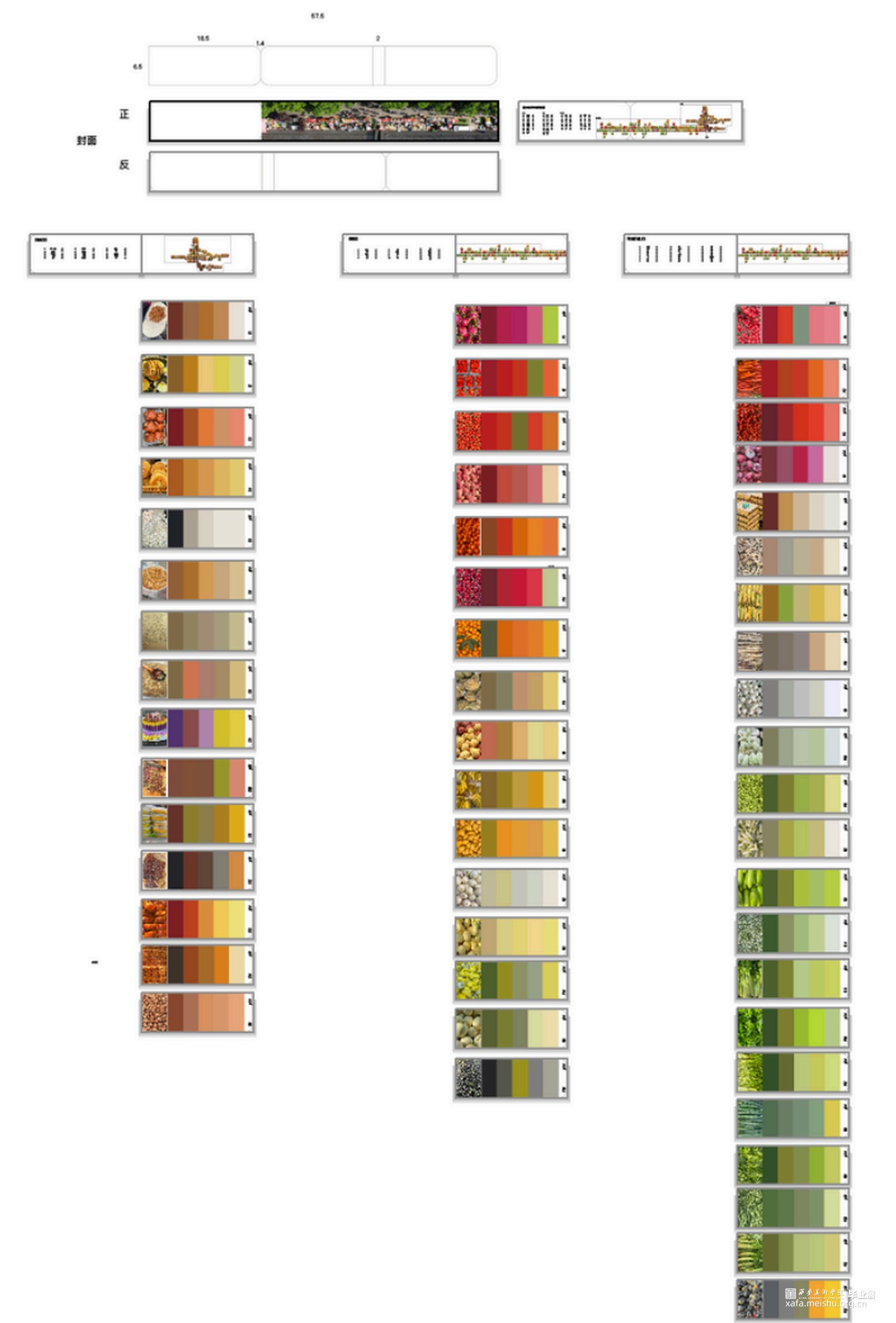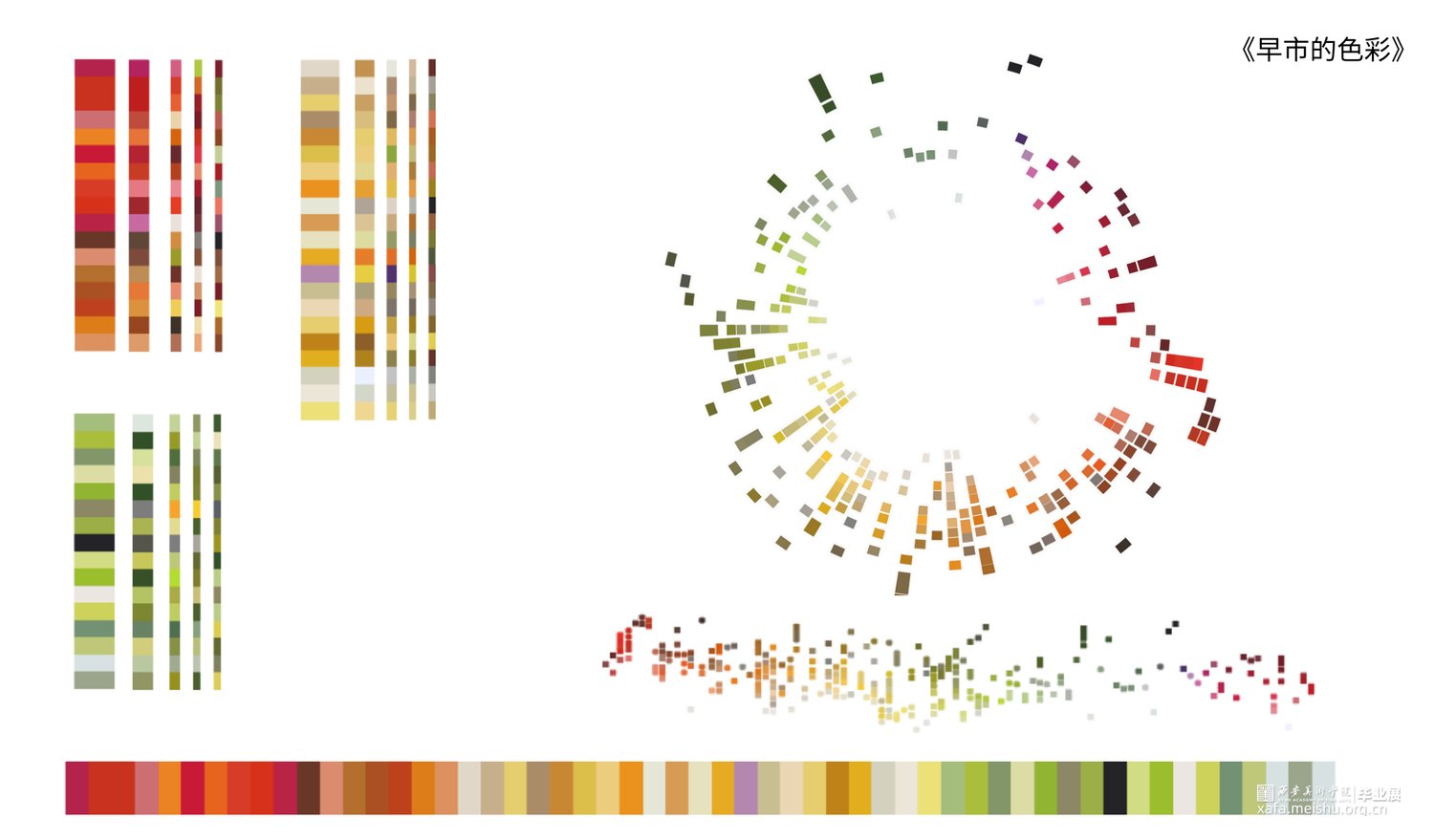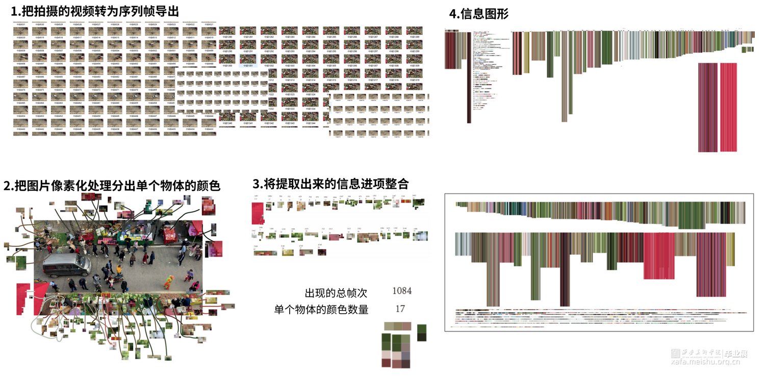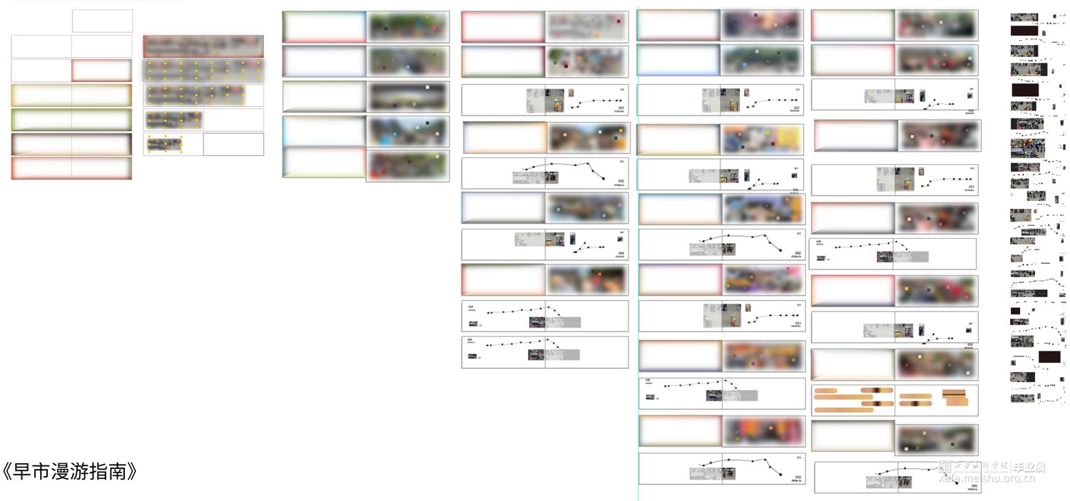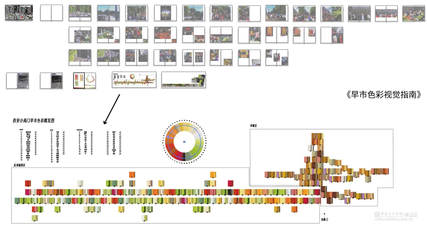 置身于早市里,扑面而来的喧嚣沸腾。各具特色的摊位,来来往往的人群,将人浸泡在平和的生命力中。在庞杂的时空中,摘取想要停留住的片刻。作品以陕西西安小南门早市为切入点,设计来源于对早市色彩的捕捉,从早市中挖掘出颜色,绘制出独属于小南门早市的色彩地图,整理成早市的色卡。通过色彩的运用和变化制造出自己对早市的美好记忆。