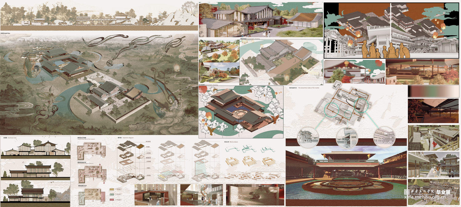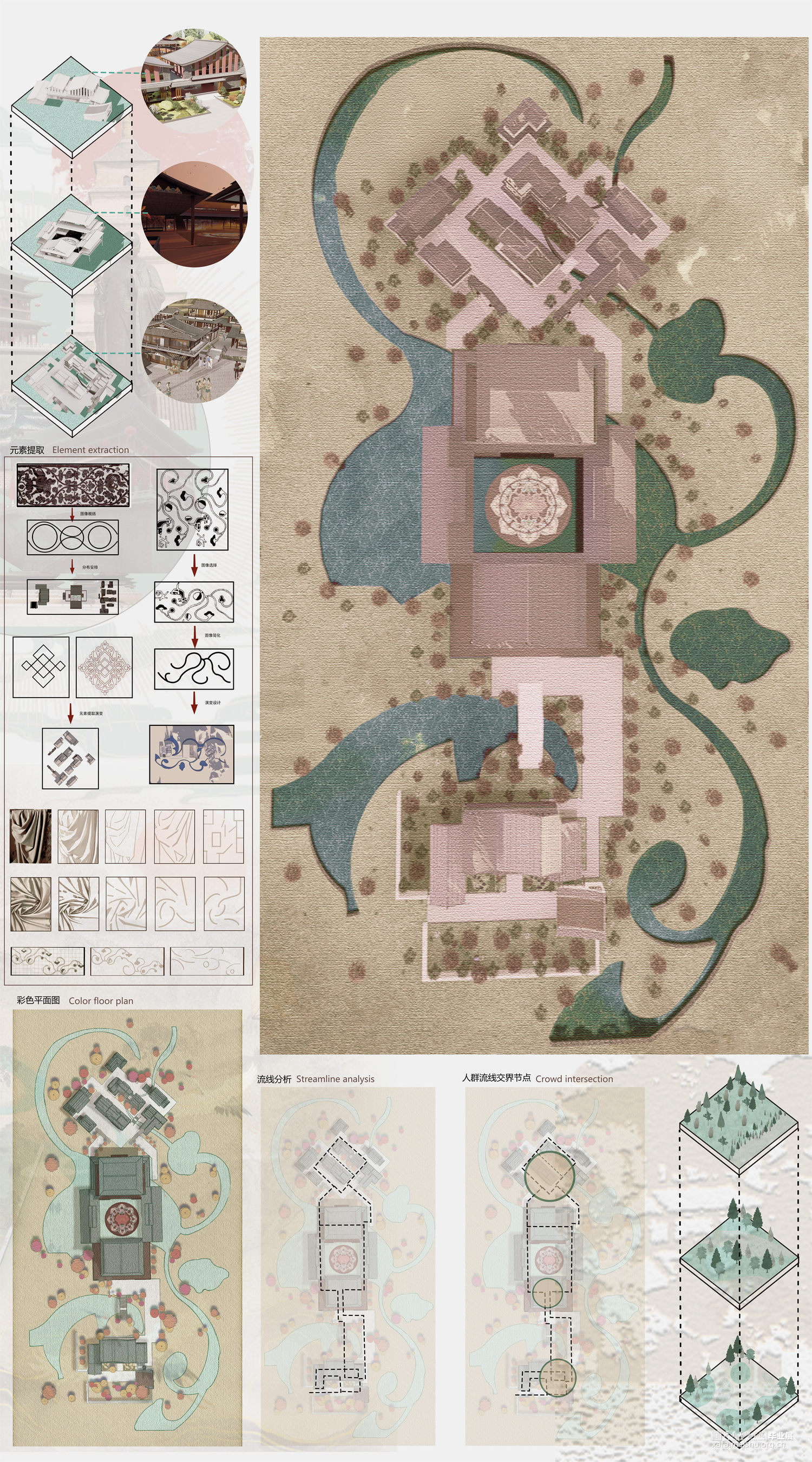 近年来,穿汉服已然成为一种风潮。在大街小巷、公园景区,或是书店博物馆,总能看到束发盘髻、衣袂飘飘的汉服爱好者。本设计内含汉服博物馆与体验馆,展示中国服饰文化和历史的平台,通过实物展示、图文解说、互动体验等方式,教育公众了解汉服的起源、发展、工艺和文化内涵。希望通过此次设计带动相关产业链的发展,促进旅游业的发展的同时,使传统文化融入到现代生活中,丰富人们的精神文化生活。