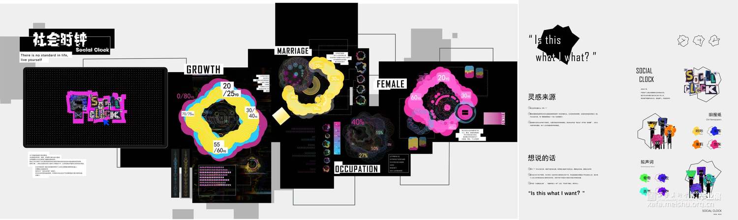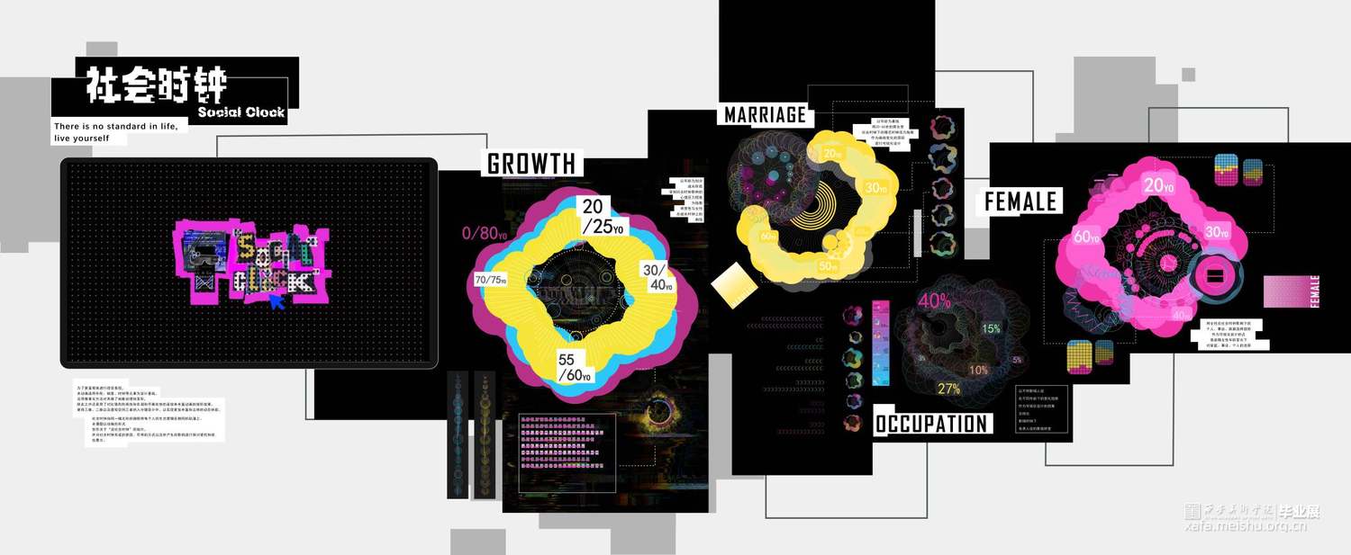 社会时钟是一个普遍存在的社会现象,它规定了人们在不同年龄阶段应该达到的生活里程碑,如求学、就业、结婚、生子等。它试图将我们的生活都固定在相同的轨道上,影响着我们的生活。这种社会期望往往会对个体产生束缚,限制他们的自由发展和选择,我们想通过视觉设计去表现社会时钟对我们的束缚,并揭示其背后的社会心理和文化因素,同时又阐述传达“逆社会时钟”这一观点。通过进一步的研究和实践,推动视觉设计在解决社会问题、促进个体自由发展方面的更多应用。