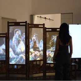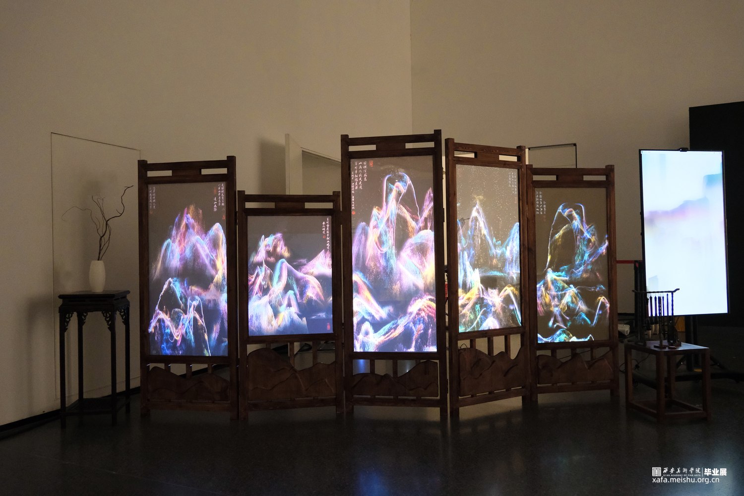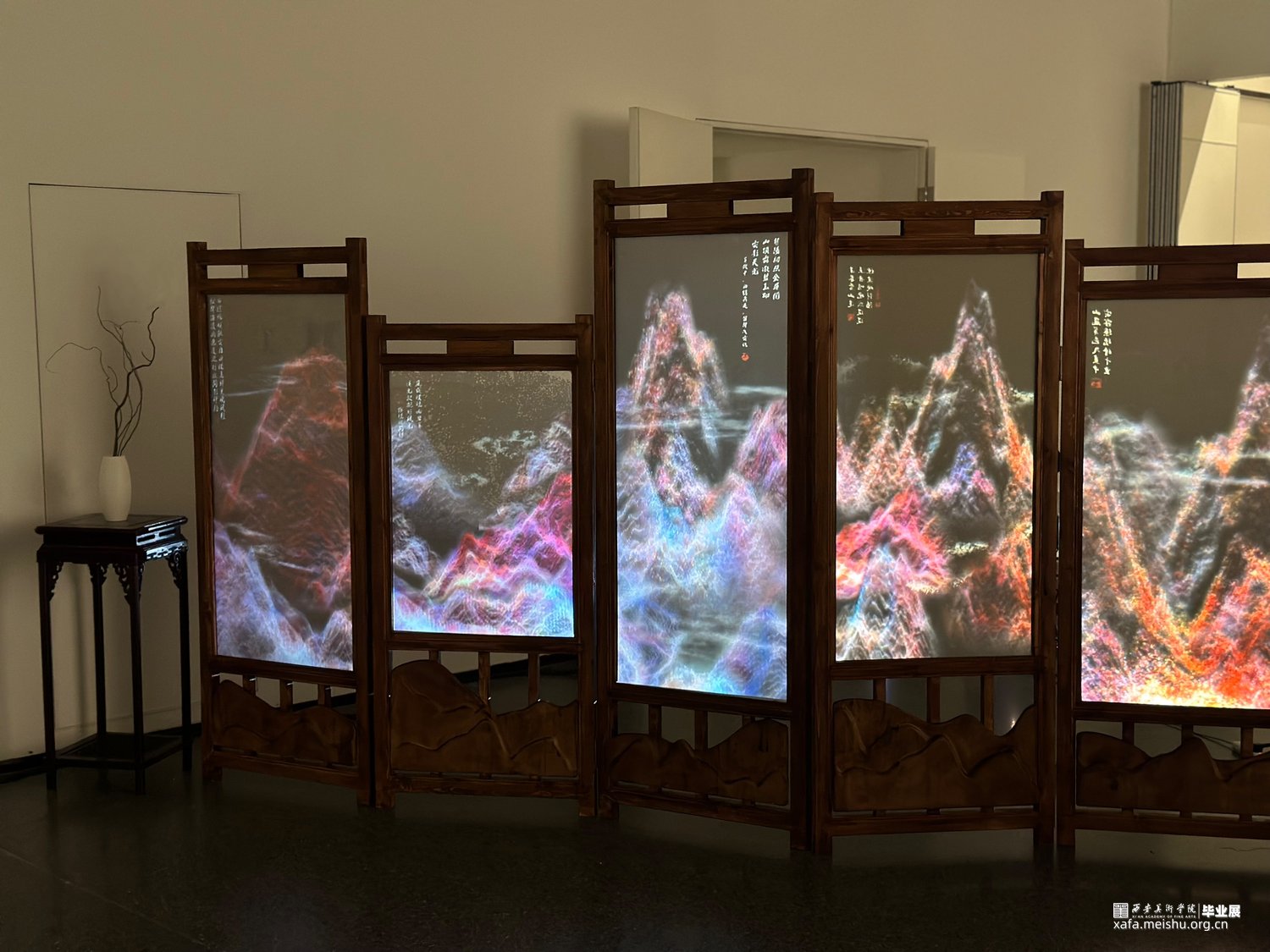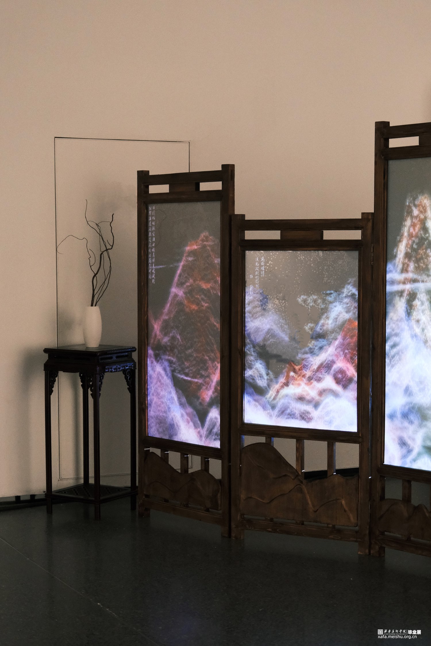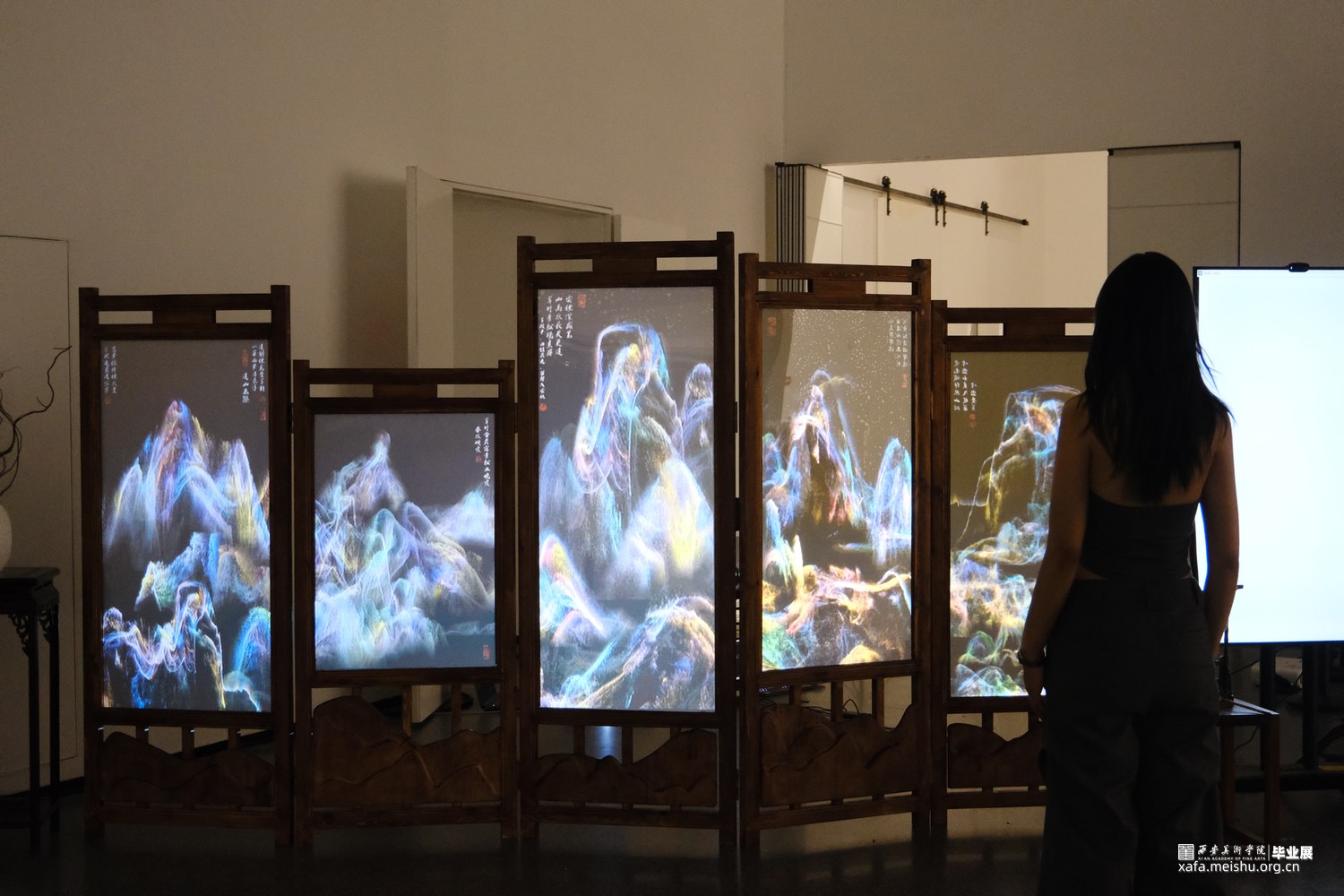 作品通过粒子技术与编程算法,在三维空间中再现了中国山水的色彩意境和恢弘气韵。五连屏风作为画中世界的承载,观众可以沉浸式地感受动态山水之美。作品分为古今上下两卷,将现代城市建筑剪影融入晕染的墨色,描绘传统与现代的碰撞,繁华隐现,时空交融。