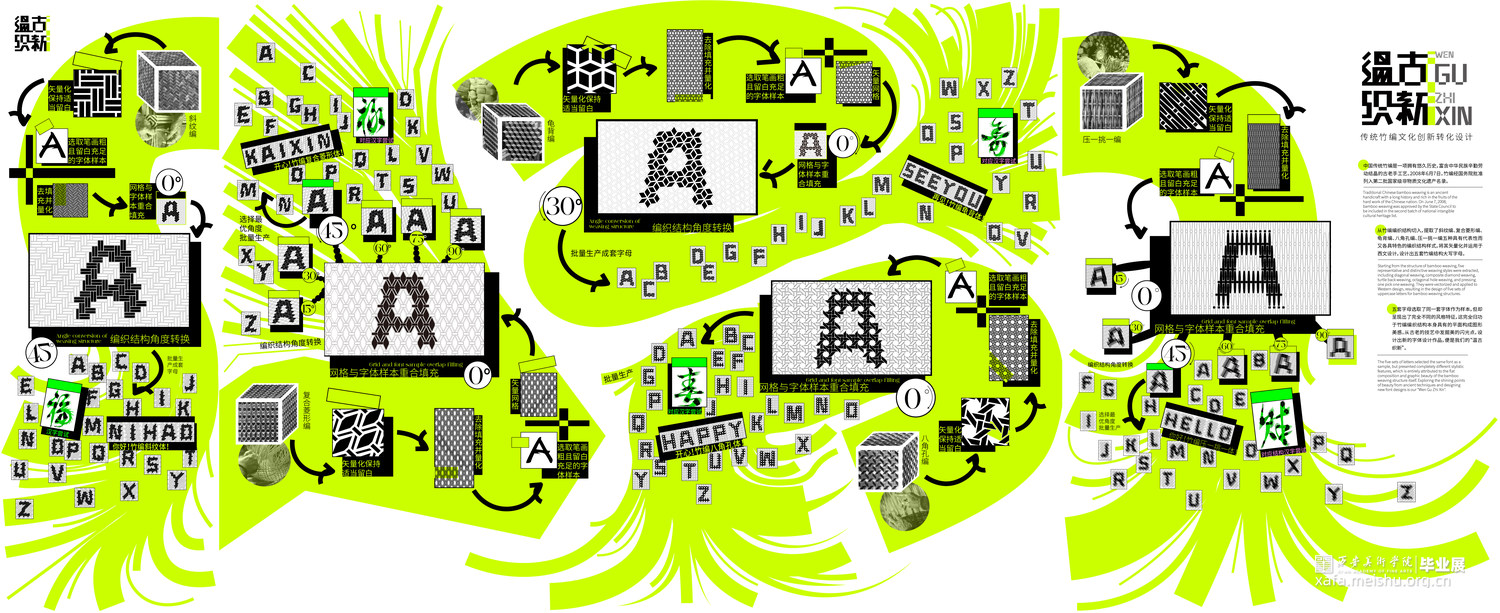 五套字母选取了同一套字体作为样本,但却呈现出了完全不同的风格特征,这完全归功于竹编编织结构本身具有的平面构成图形美感。从古老的技艺中发掘美的闪光点,设计出新的字体设计作品,便是我们的“温古