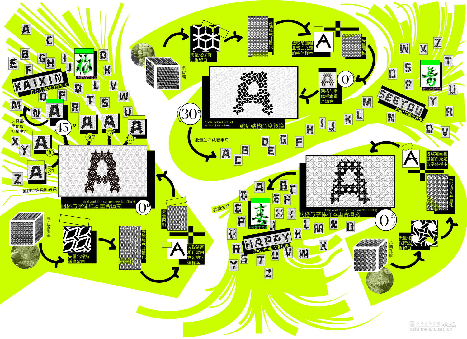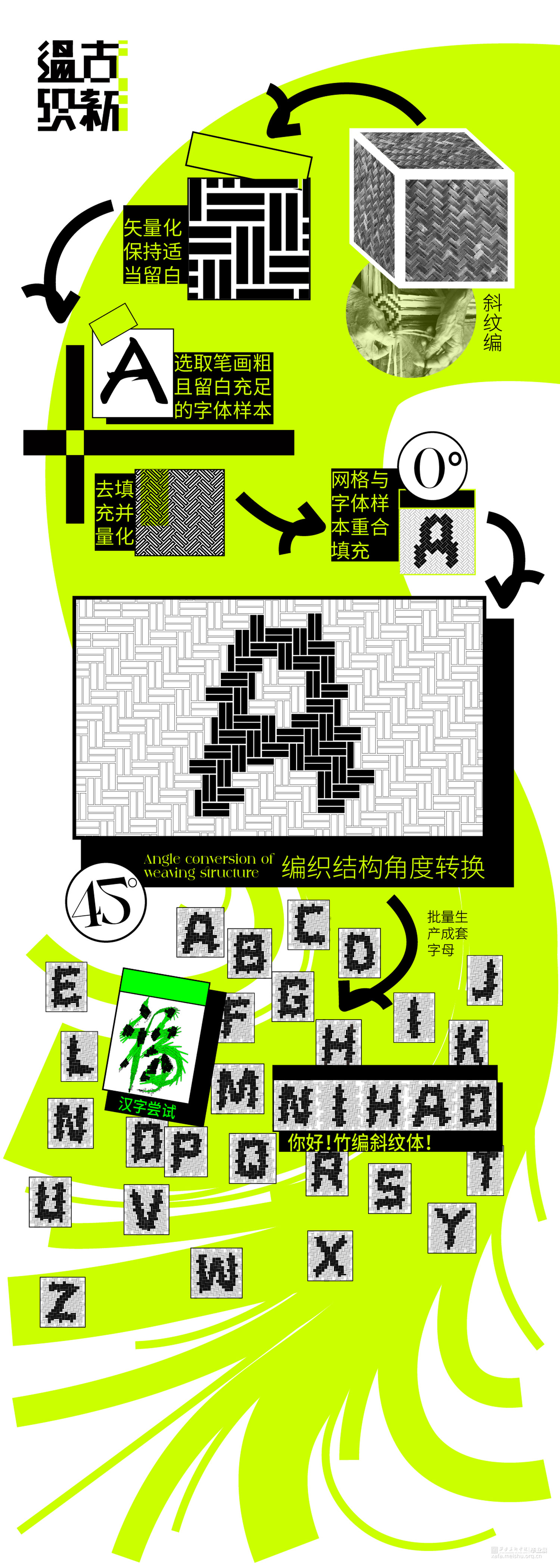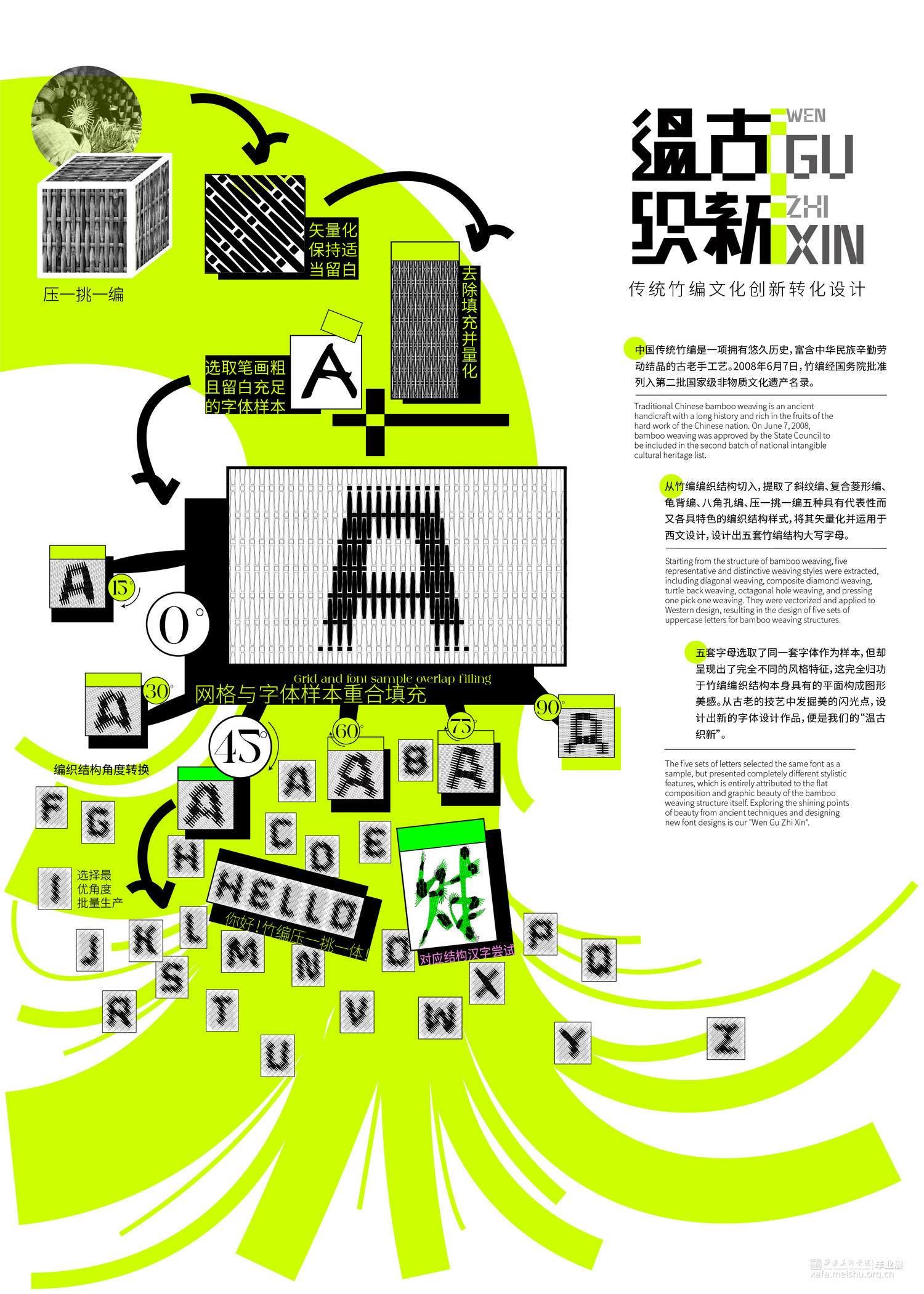 从竹编编织结构切入,提取了斜纹编、复合菱形编、龟背编、八角孔编、压一挑一编五种具有代表性而又各具特色的编织结构样式,将其矢量化并运用于西文设计,设计出五套竹编结构大写字母。