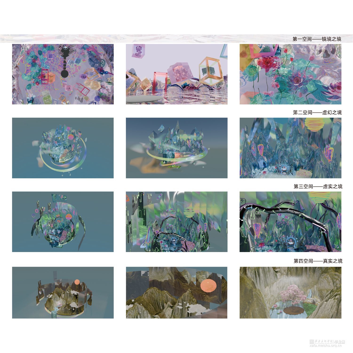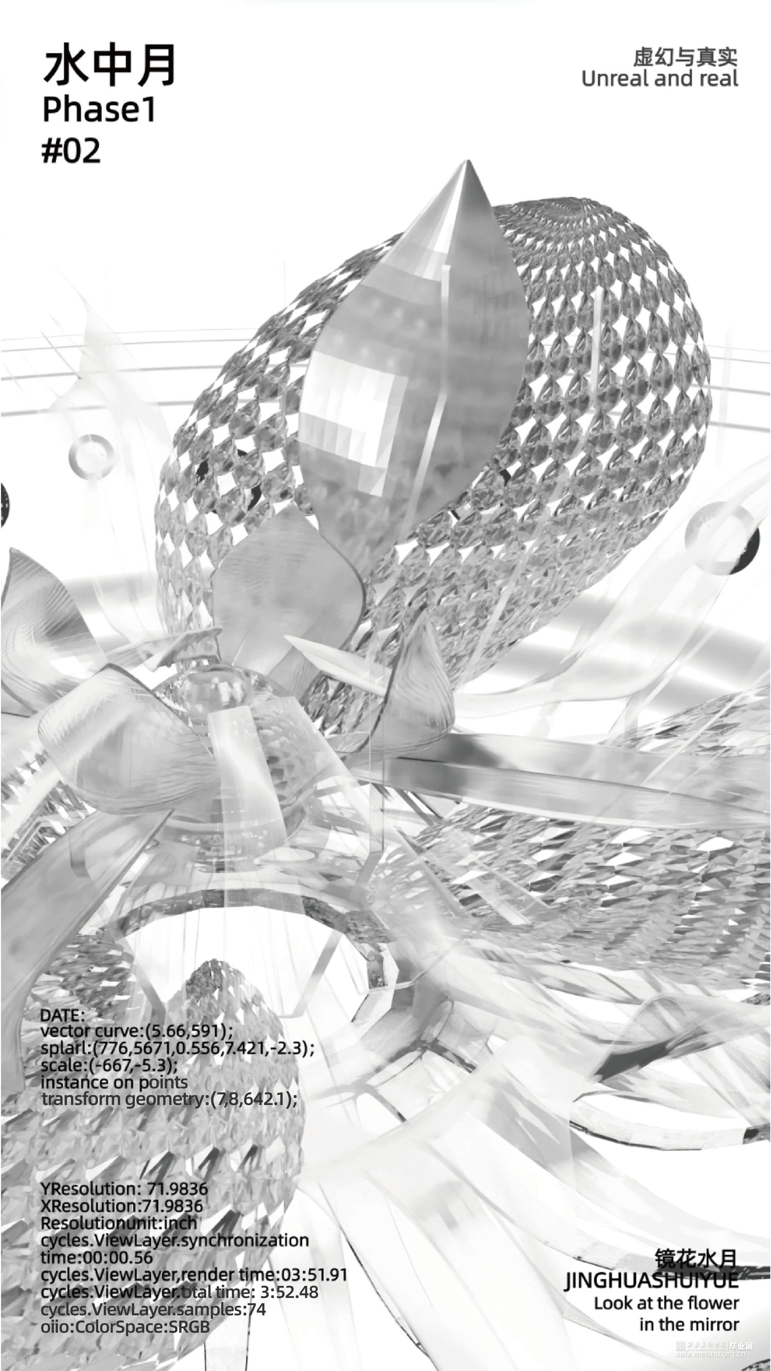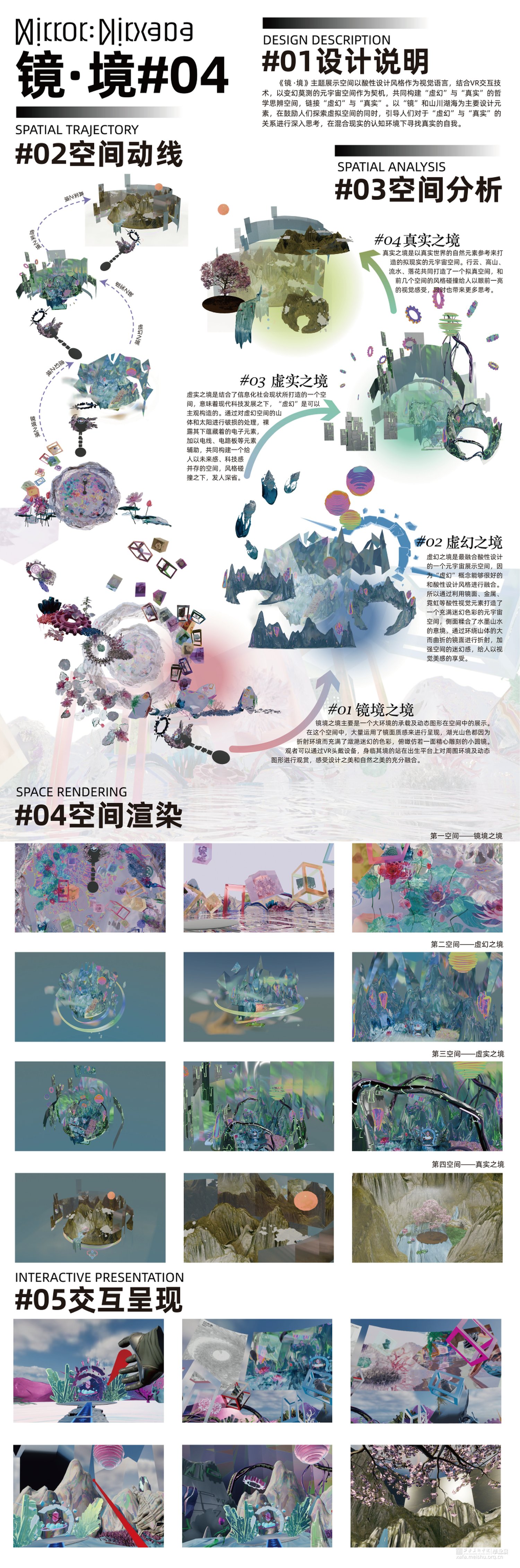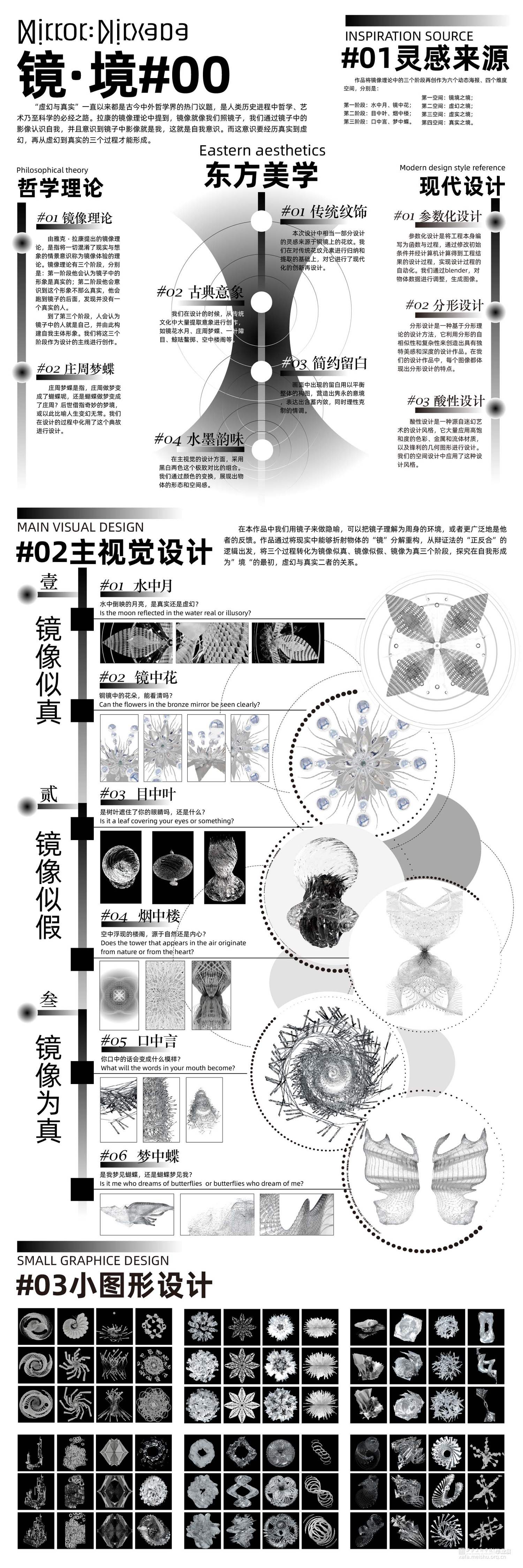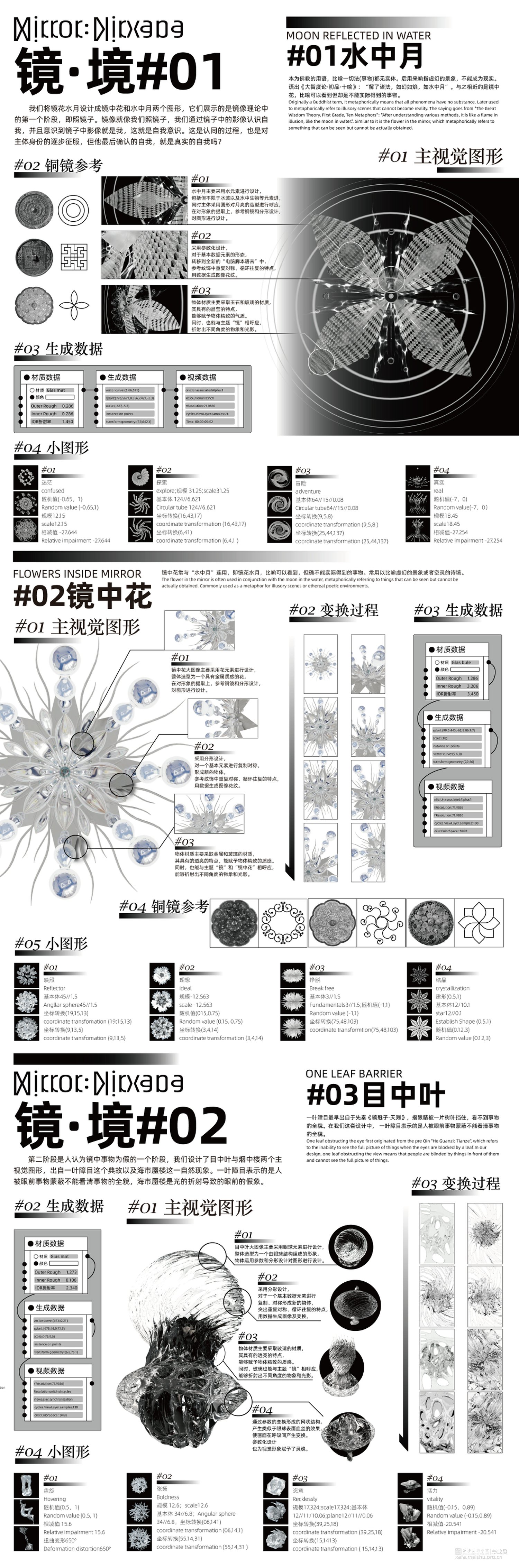 在本作品中我们用镜子做隐喻,可以把镜子理解为周身的环境,或者更广泛地是他者的反馈。结合东方美学通过将现实中能够折射物体的“镜”分解重构。从辩证法的“正反合”的逻辑出发,将三个过程转化为镜像似真、镜像似假、镜像为真三个阶段,探究在自我意识形成为“境”的最初,虚幻与真实二者之间的关系。