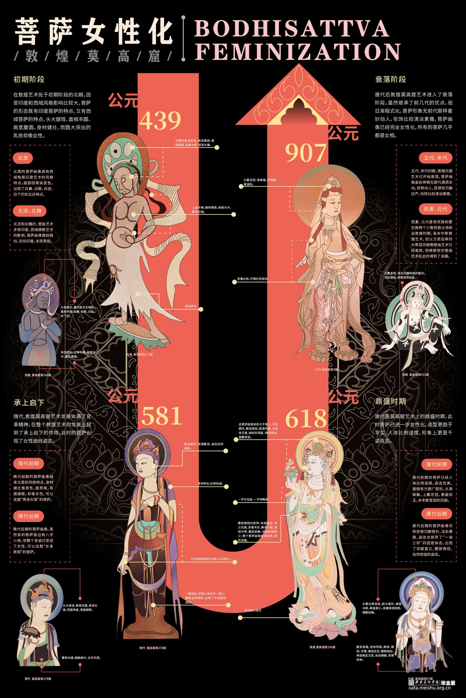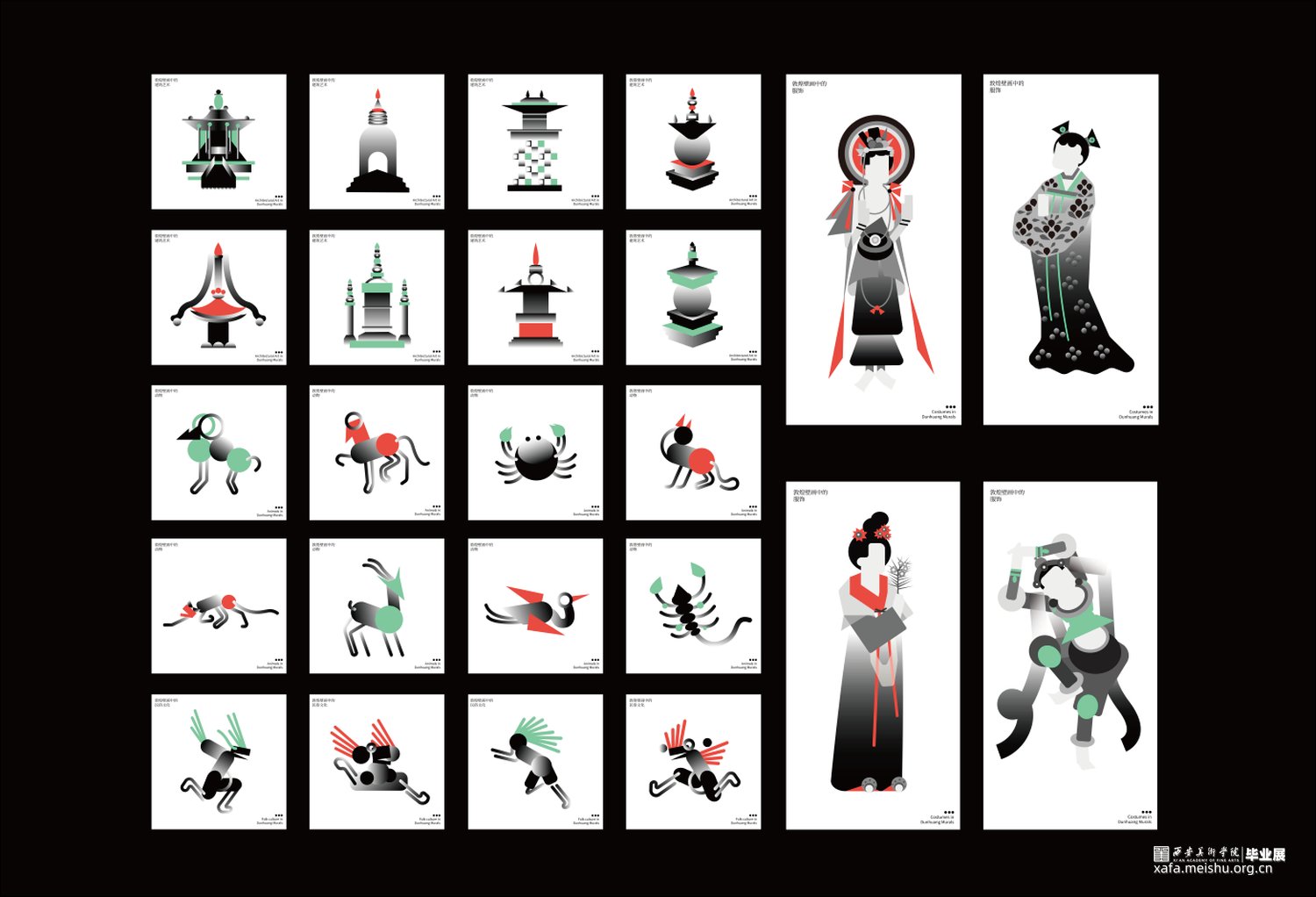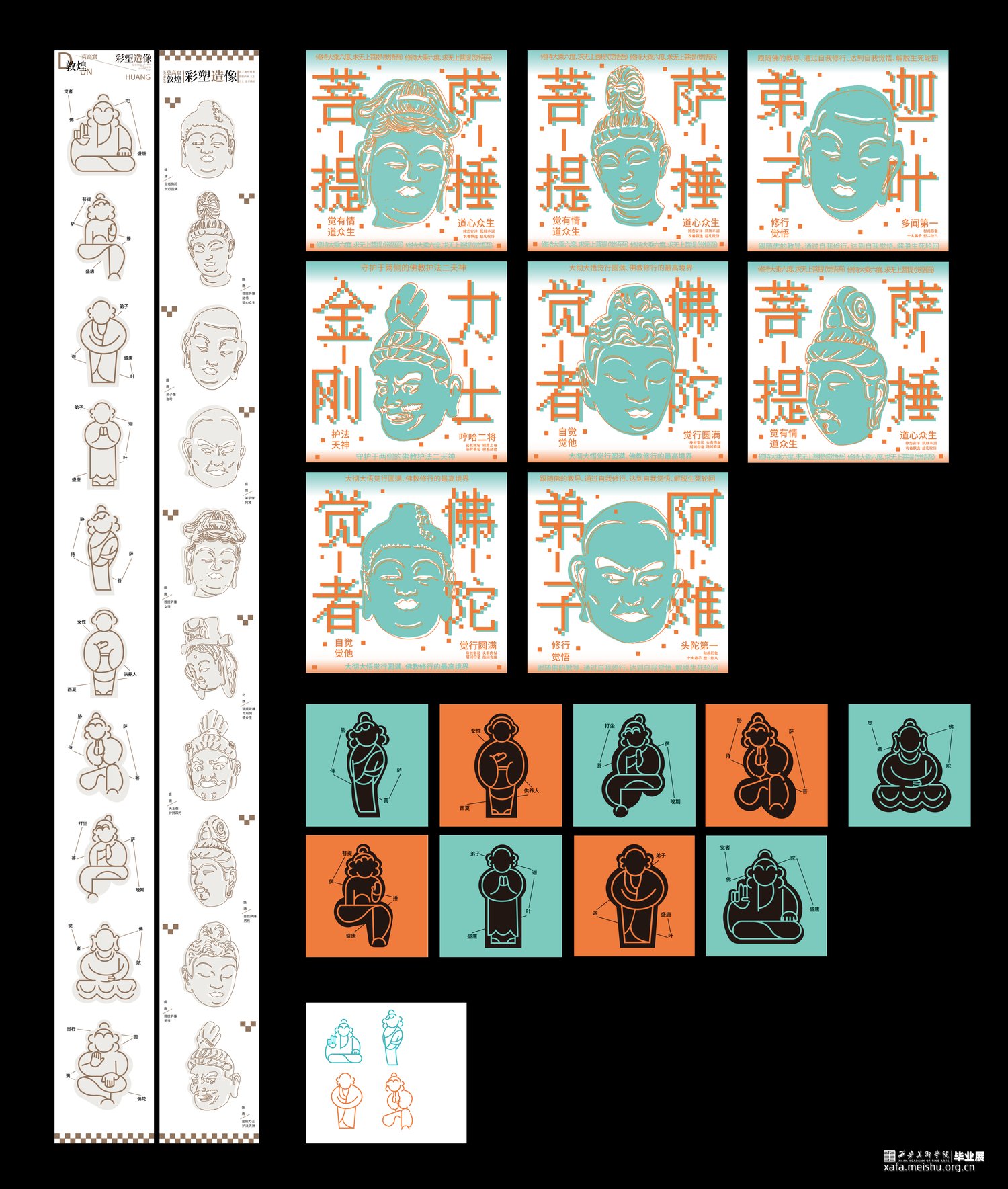 基于前期对敦煌壁画艺术与彩塑艺术的内容研究调研,将信息可视化、图形化,通过设计创作来进行实践研究。通过对作品中的符号、色彩、构图等元素的细致剖析,揭示了敦煌壁画与彩塑视觉语言在现代插画设计中的传承。
