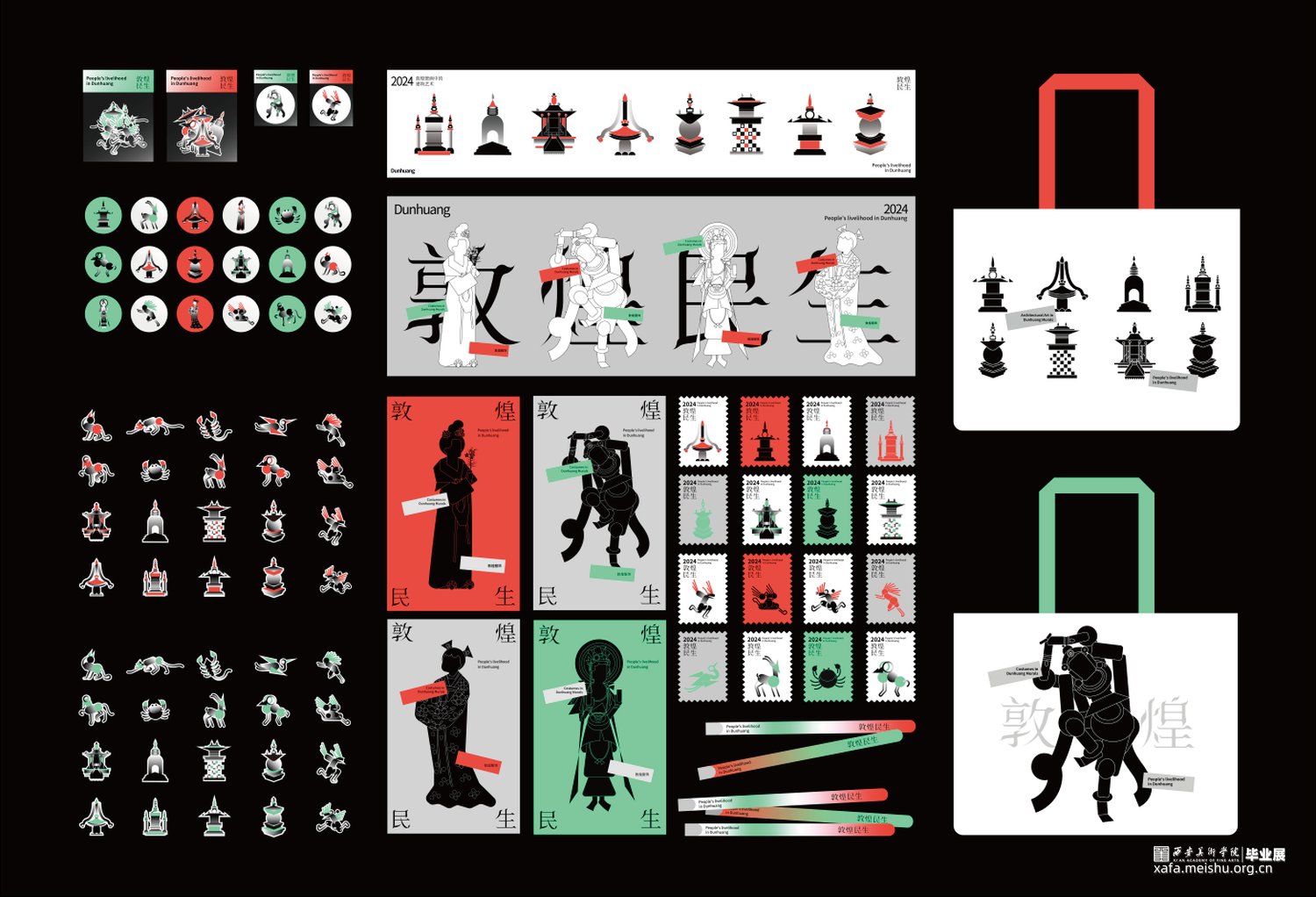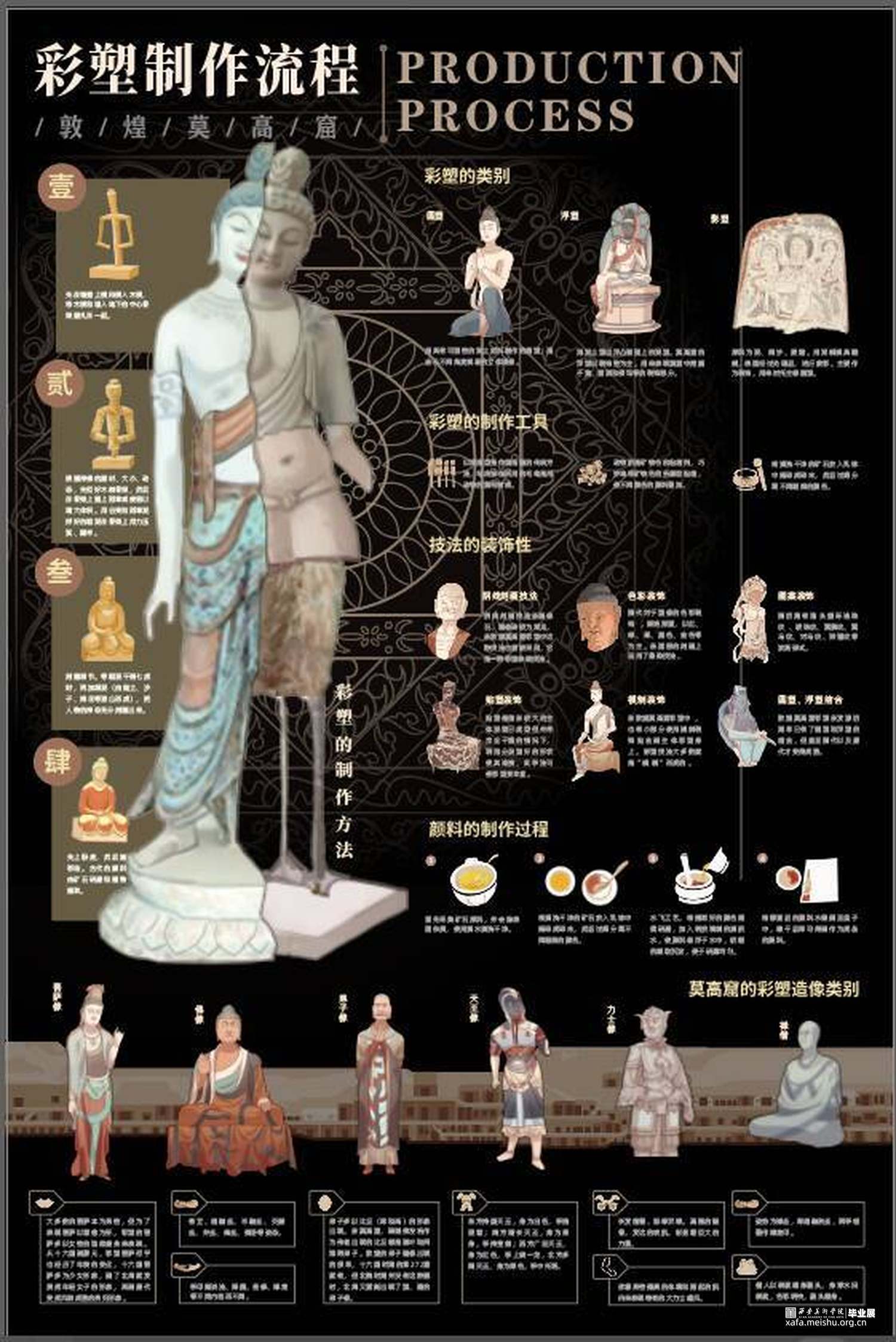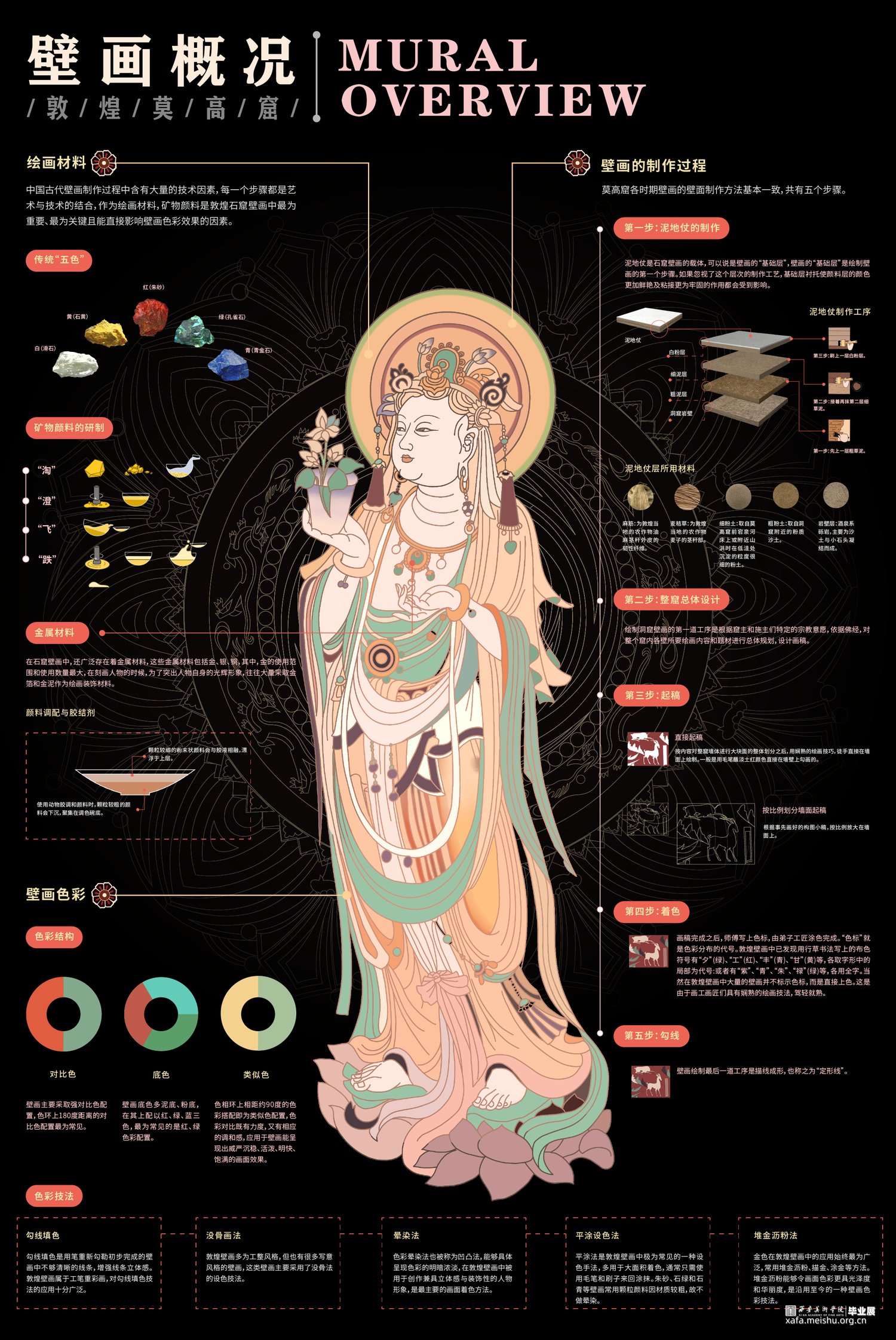 基于前期对敦煌壁画艺术与彩塑艺术的内容研究调研,将信息可视化、图形化,通过设计创作来进行实践研究。通过对作品中的符号、色彩、构图等元素的细致剖析,揭示了敦煌壁画与彩塑视觉语言在现代插画设计中的传承。