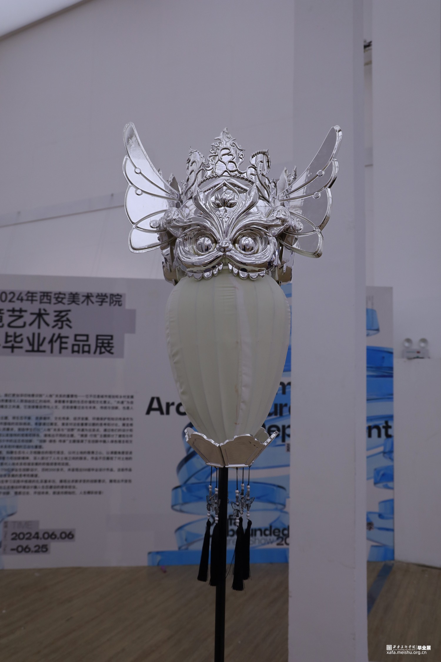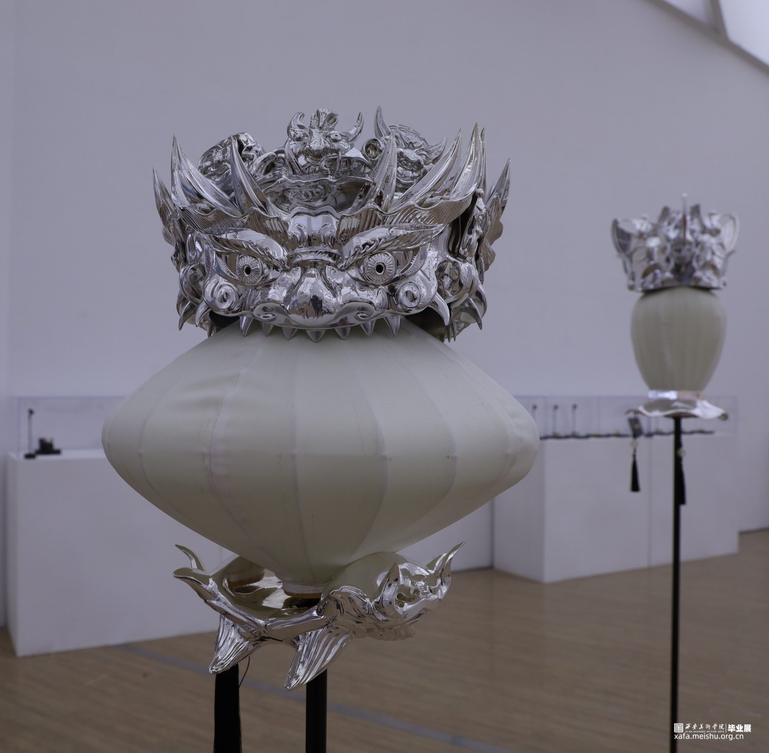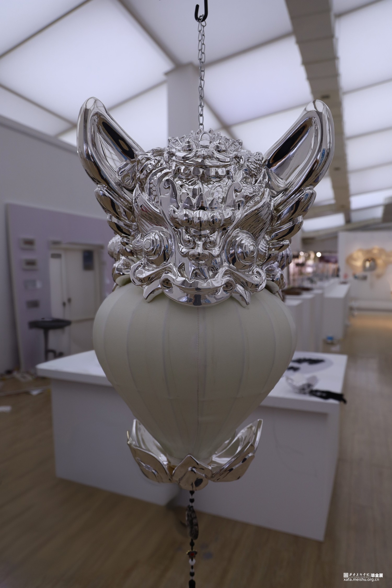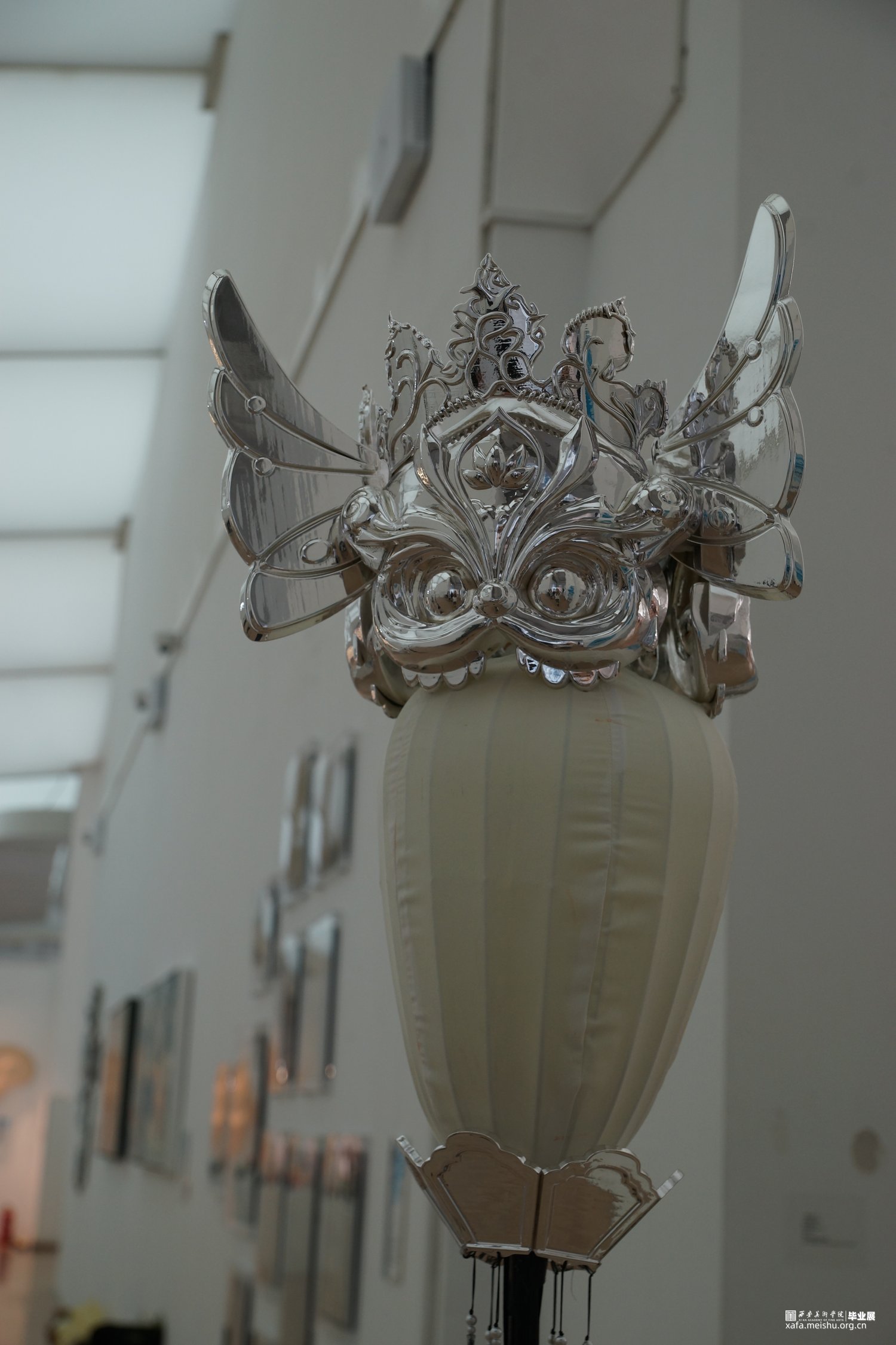 《熹源》以宫灯为题材,选用金属工艺进行创作,以傩面具文化为背景,结合京剧发冠和头饰元素重构创新,意图实现当代艺术与传统非遗的碰撞和结合。 作品的表现手法主要以五官变化来突出不同身份和性格的宫灯形象,分别为温柔贤淑的花旦,威武勇猛的年兽,正直清廉的官兽,滑稽可爱的狮和妍丽自信的蝶,突出“真宫肇高阁,精意感鸿禧。祥烟五色丽,嘉气九华滋”的作品意境。