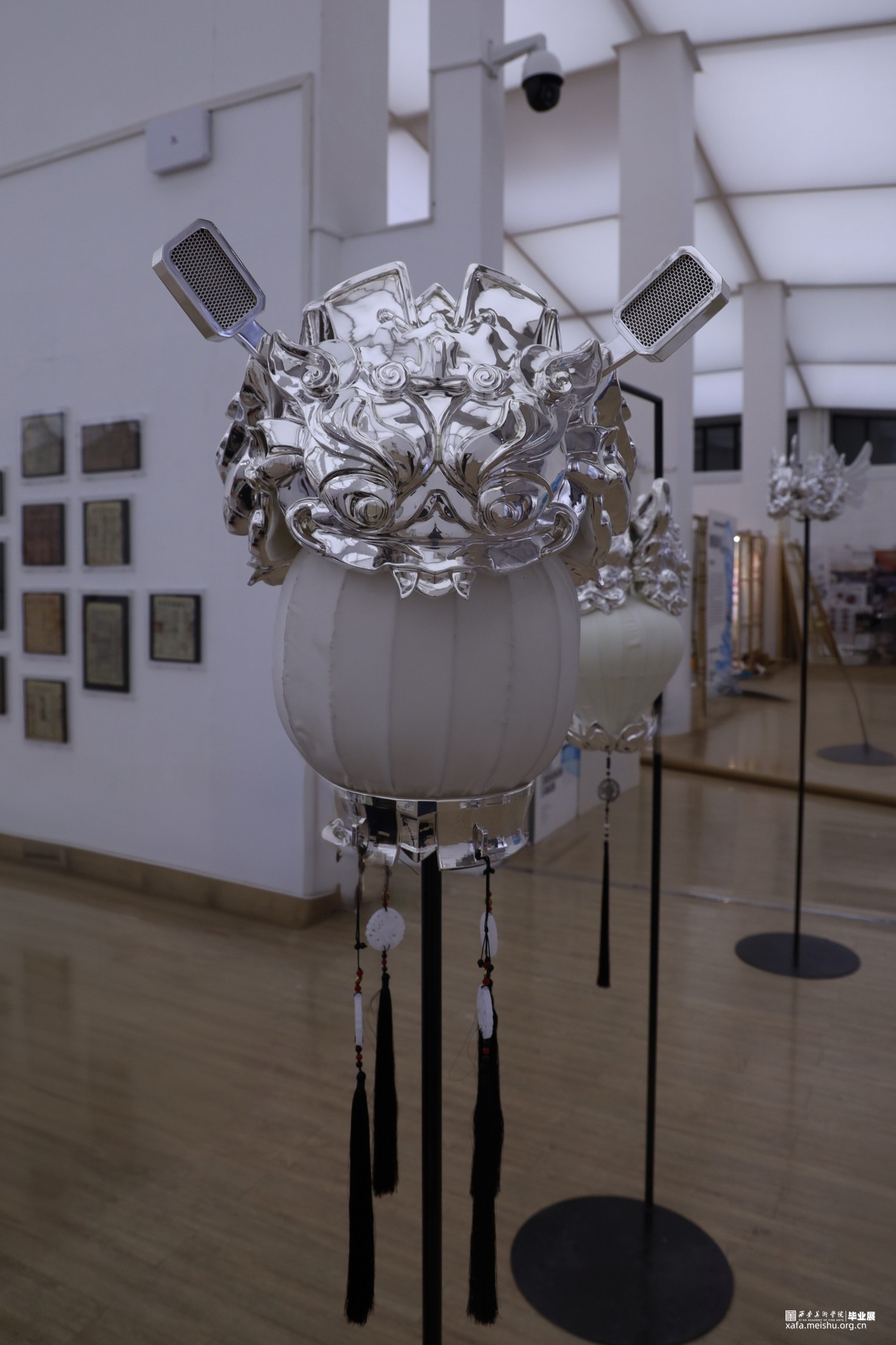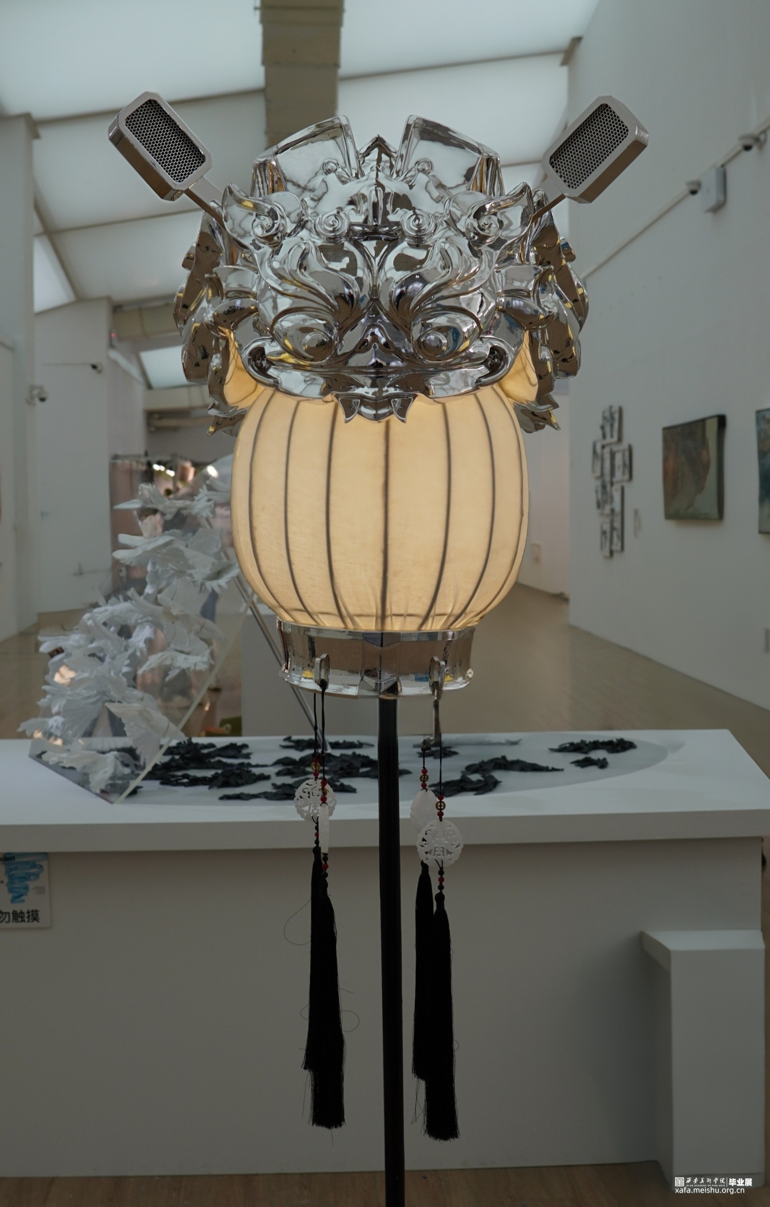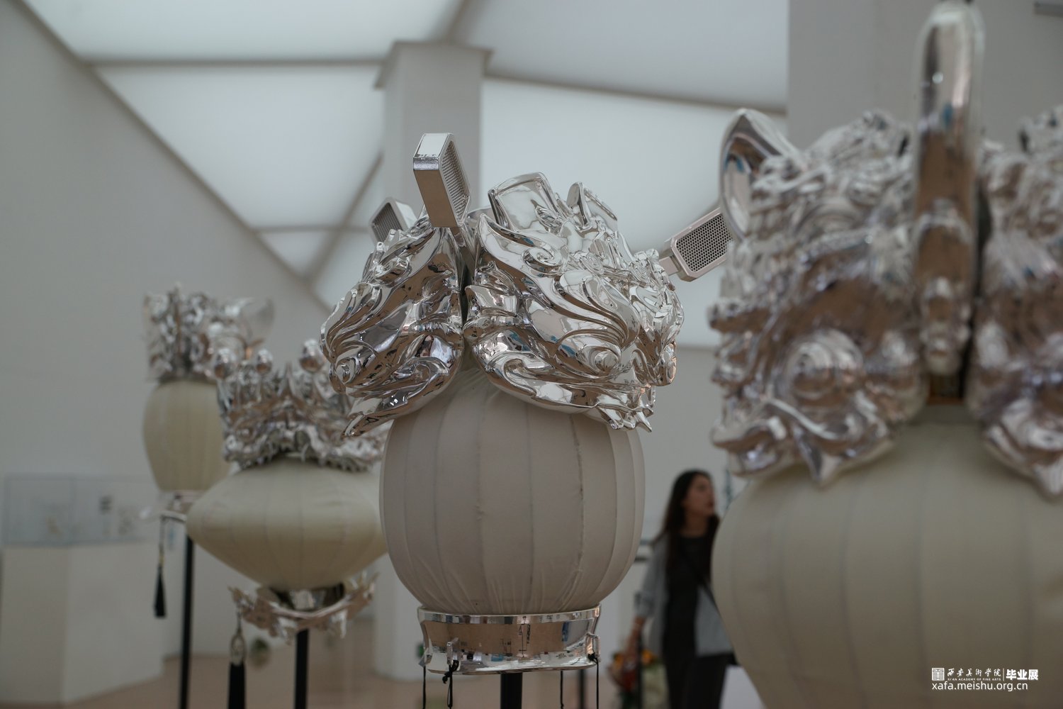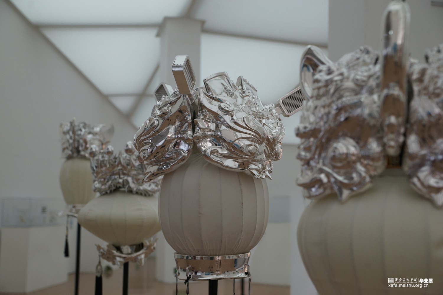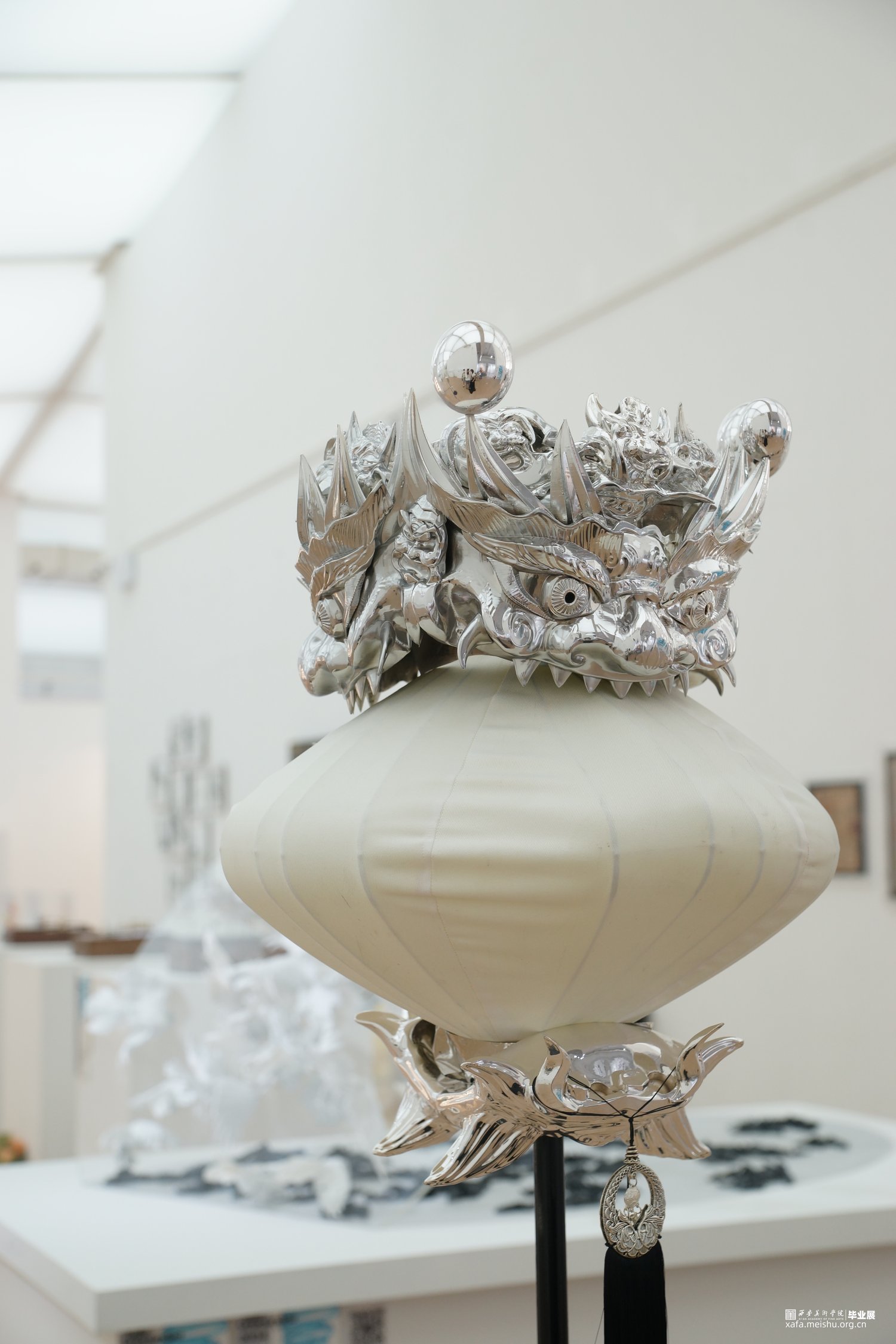 《熹源》以宫灯为题材,选用金属工艺进行创作,以傩面具文化为背景,结合京剧发冠和头饰元素重构创新,意图实现当代艺术与传统非遗的碰撞和结合。 作品的表现手法主要以五官变化来突出不同身份和性格的宫灯形象,分别为温柔贤淑的花旦,威武勇猛的年兽,正直清廉的官兽,滑稽可爱的狮和妍丽自信的蝶,突出“真宫肇高阁,精意感鸿禧。祥烟五色丽,嘉气九华滋”的作品意境。