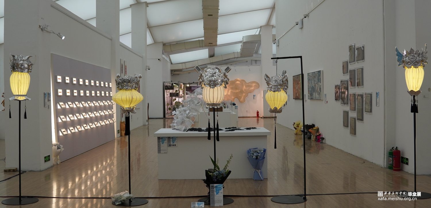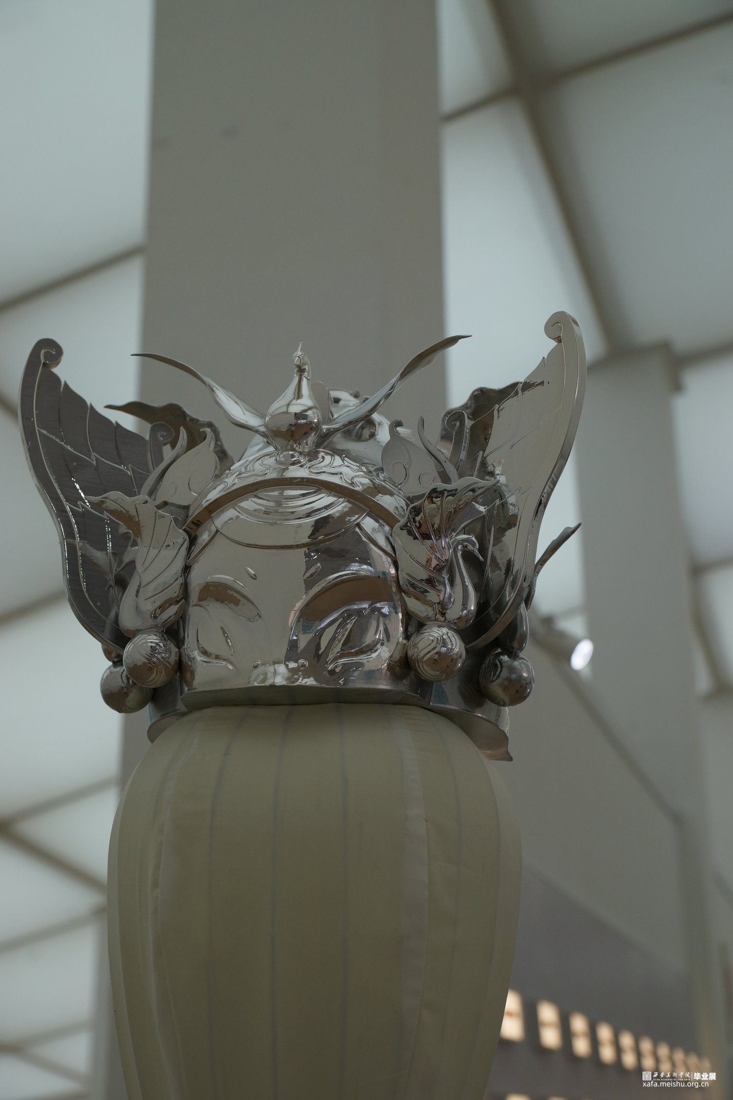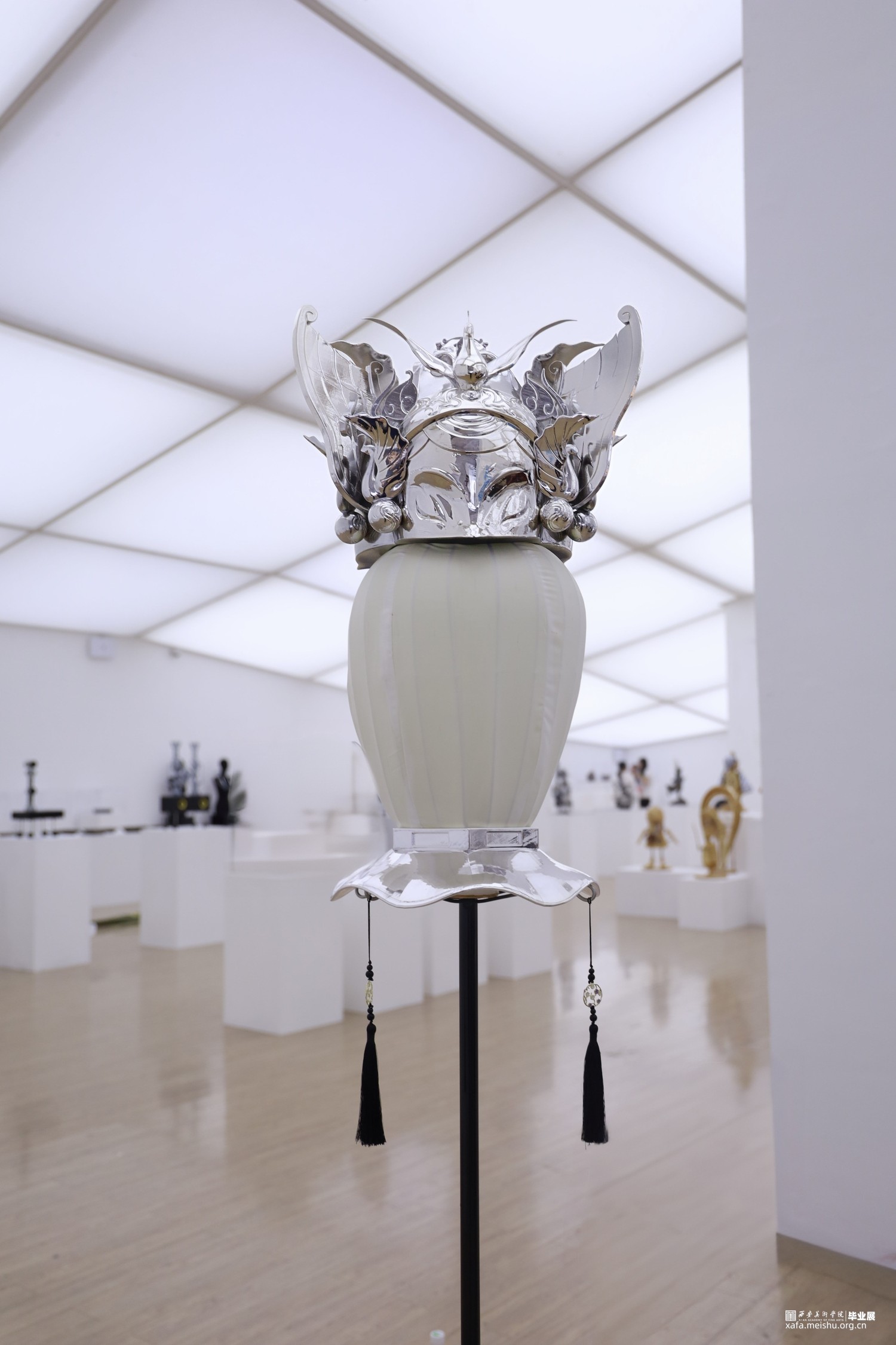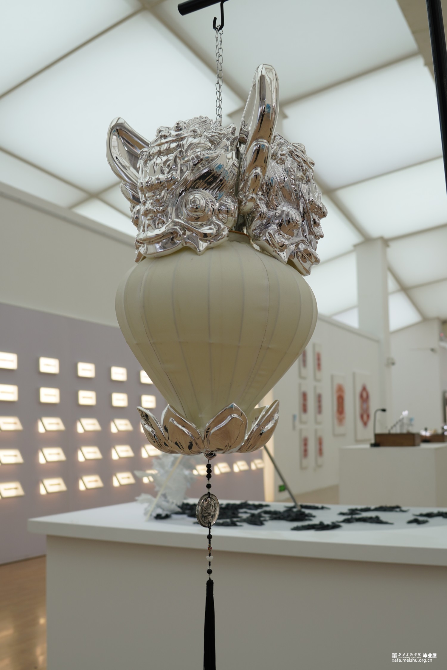 《熹源》以宫灯为题材,选用金属工艺进行创作,以傩面具文化为背景,结合京剧发冠和头饰元素重构创新,意图实现当代艺术与传统非遗的碰撞和结合。 作品的表现手法主要以五官变化来突出不同身份和性格的宫灯形象,分别为温柔贤淑的花旦,威武勇猛的年兽,正直清廉的官兽,滑稽可爱的狮和妍丽自信的蝶,突出“真宫肇高阁,精意感鸿禧。祥烟五色丽,嘉气九华滋”的作品意境。