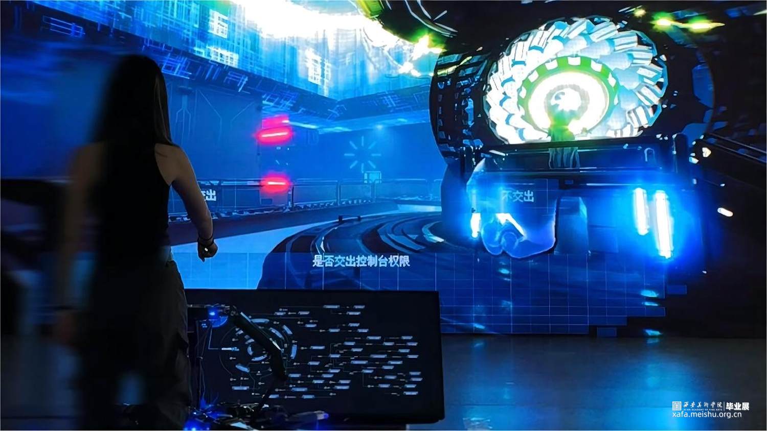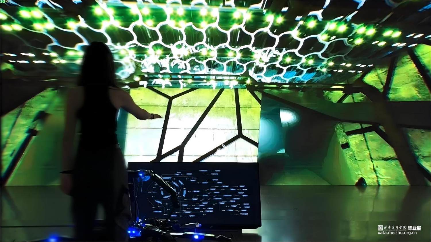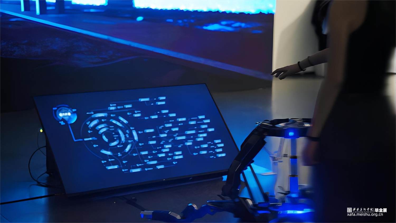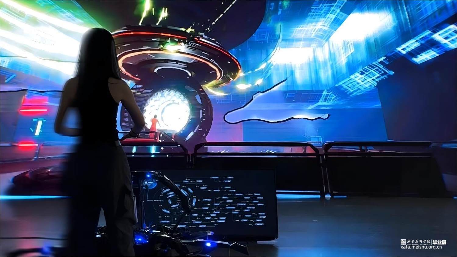在交互技术层面,本作品采用UE5(虚幻引擎)进行场景的搭建渲染,运用动捕设备制作人物动画,并通过OSC和MQTT协议以及TouchDesigner软件,打通装置灯光与传动、实时关卡流程图、游戏界面等多媒介的数据通讯,在交互设备上选用Leap Motion,诣在脱离传统游戏游玩模式,打造全新的沉浸式交互体验空间,总体来说,本作品的技术集成性非常高,并且试图冲破重组传统的游戏方式。