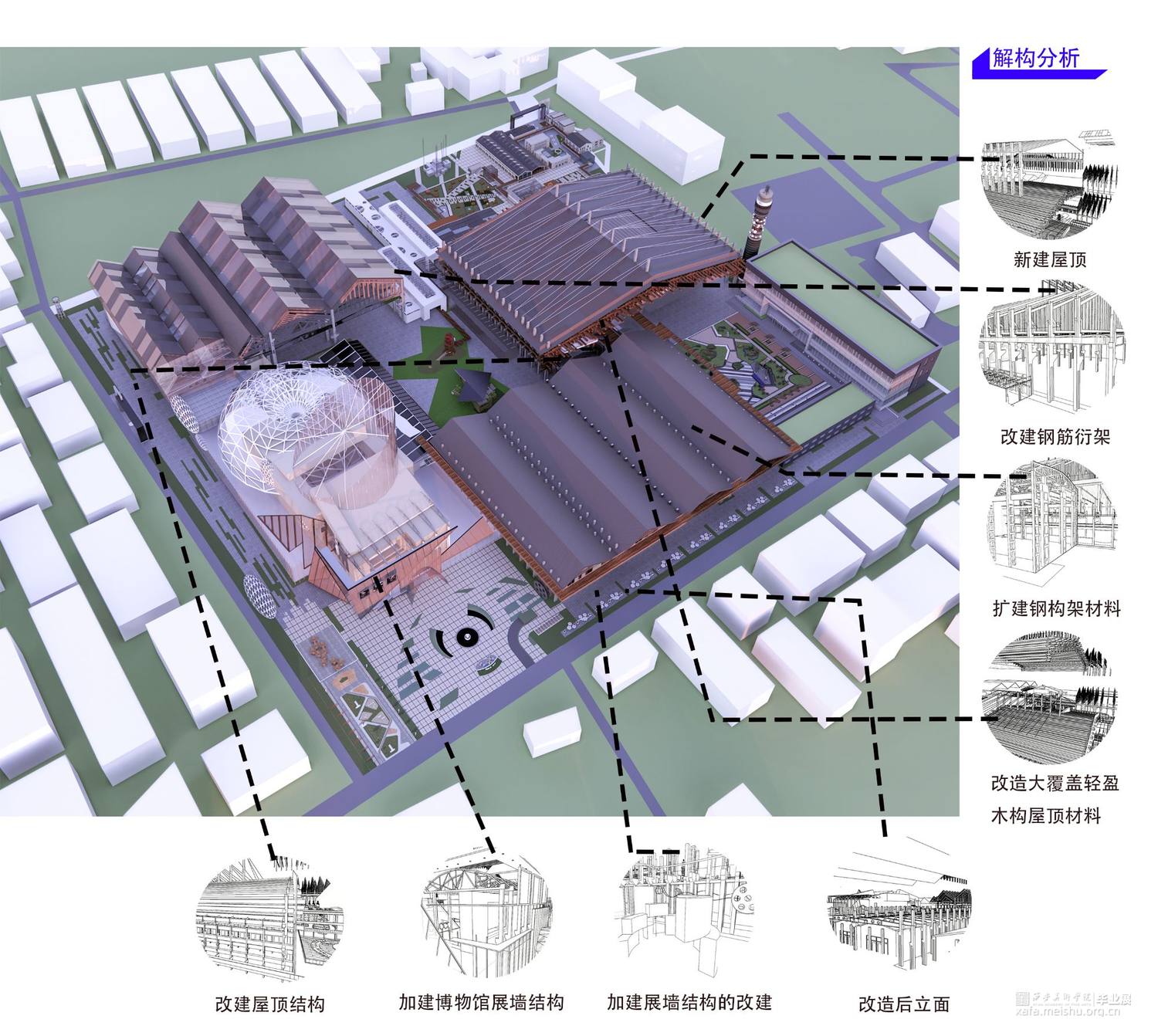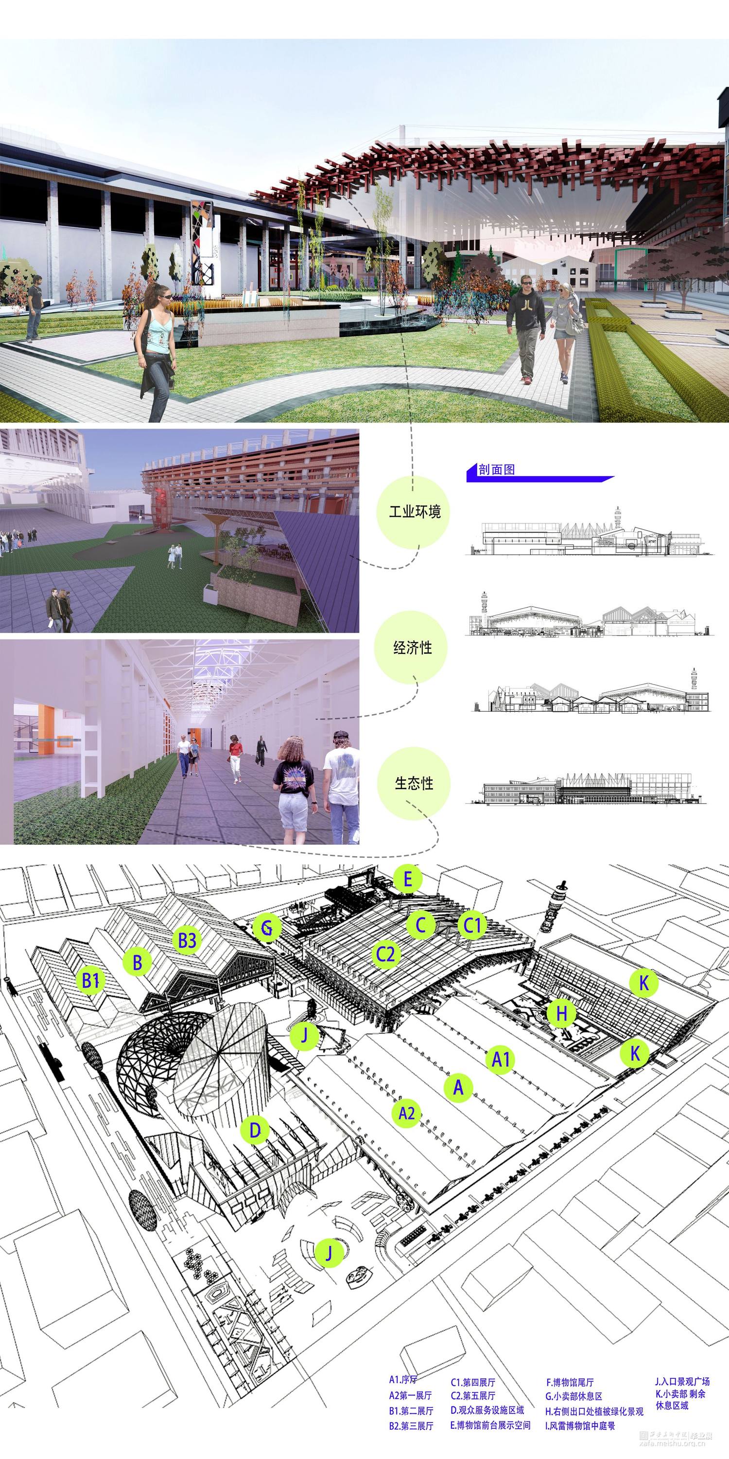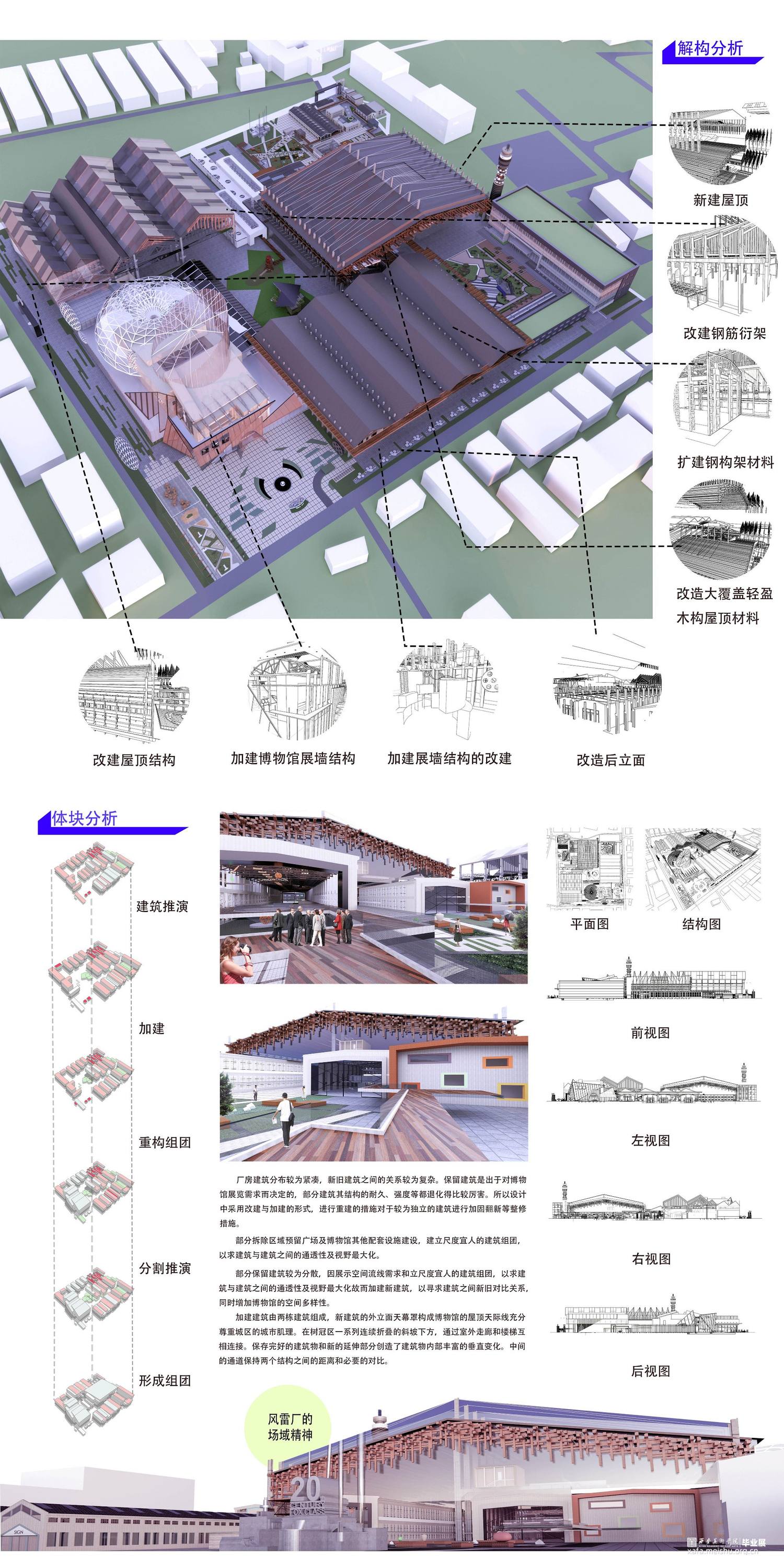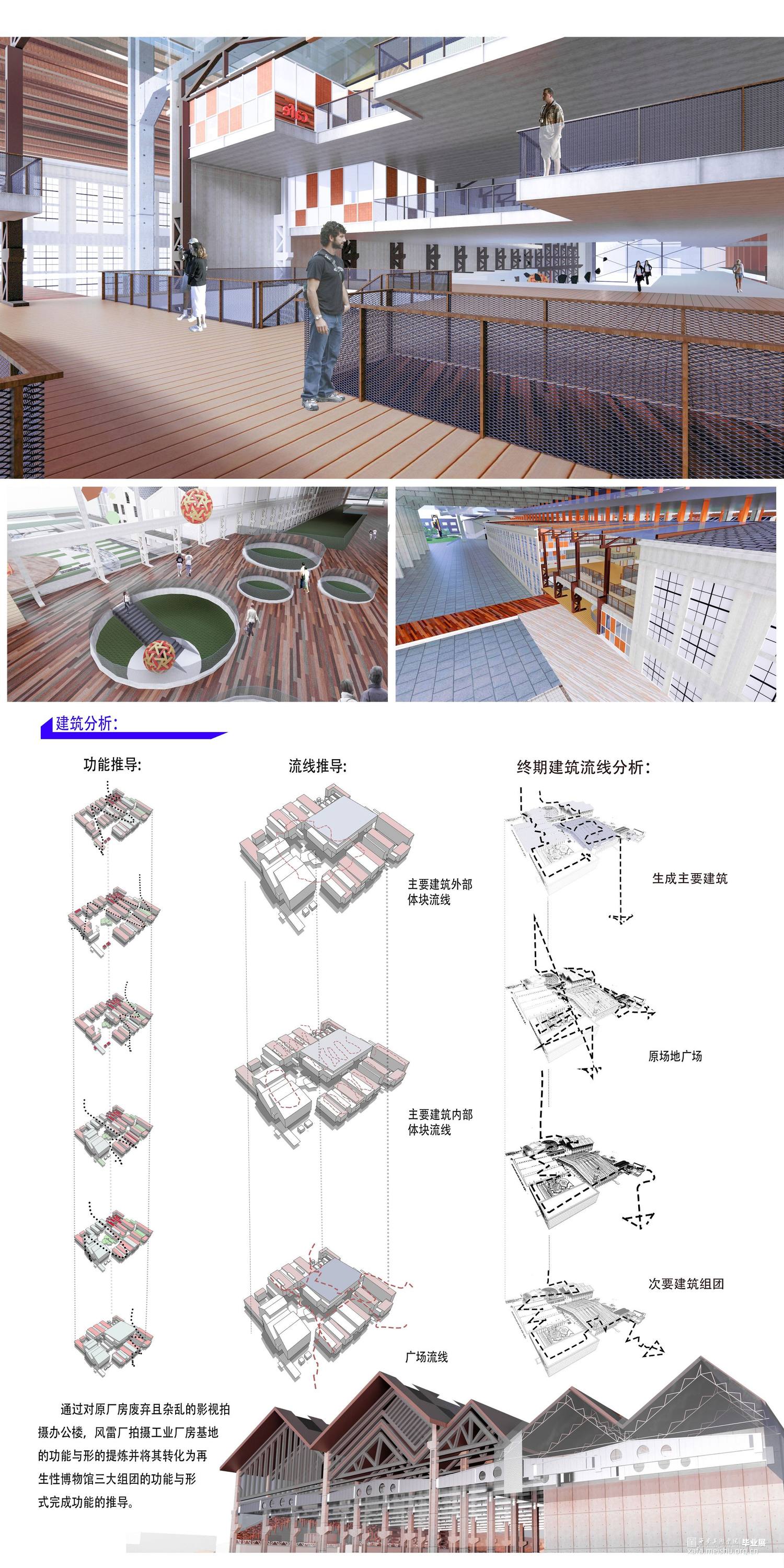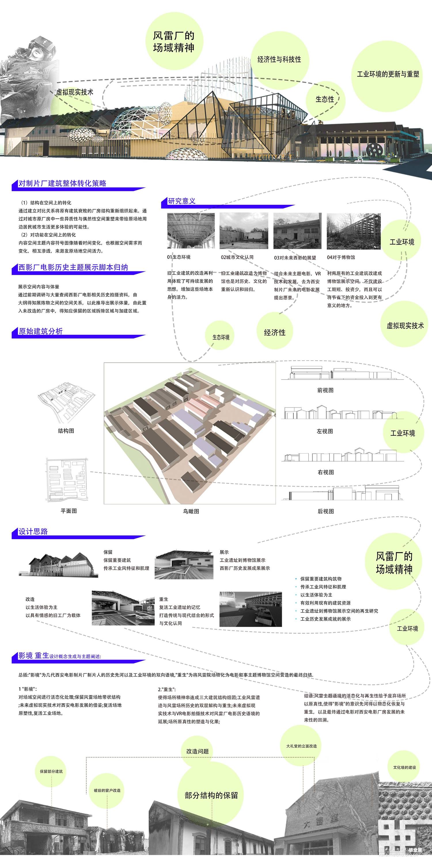 2."重生":使得场所精神串连成三大建筑结构组团;工业风雷遗迹与风雷场所历史的双层解构与重生;未来虚拟现实技术与VR电影拍摄技术对风雷厂电影历史语境的延展;场所原真性的塑造与化果;