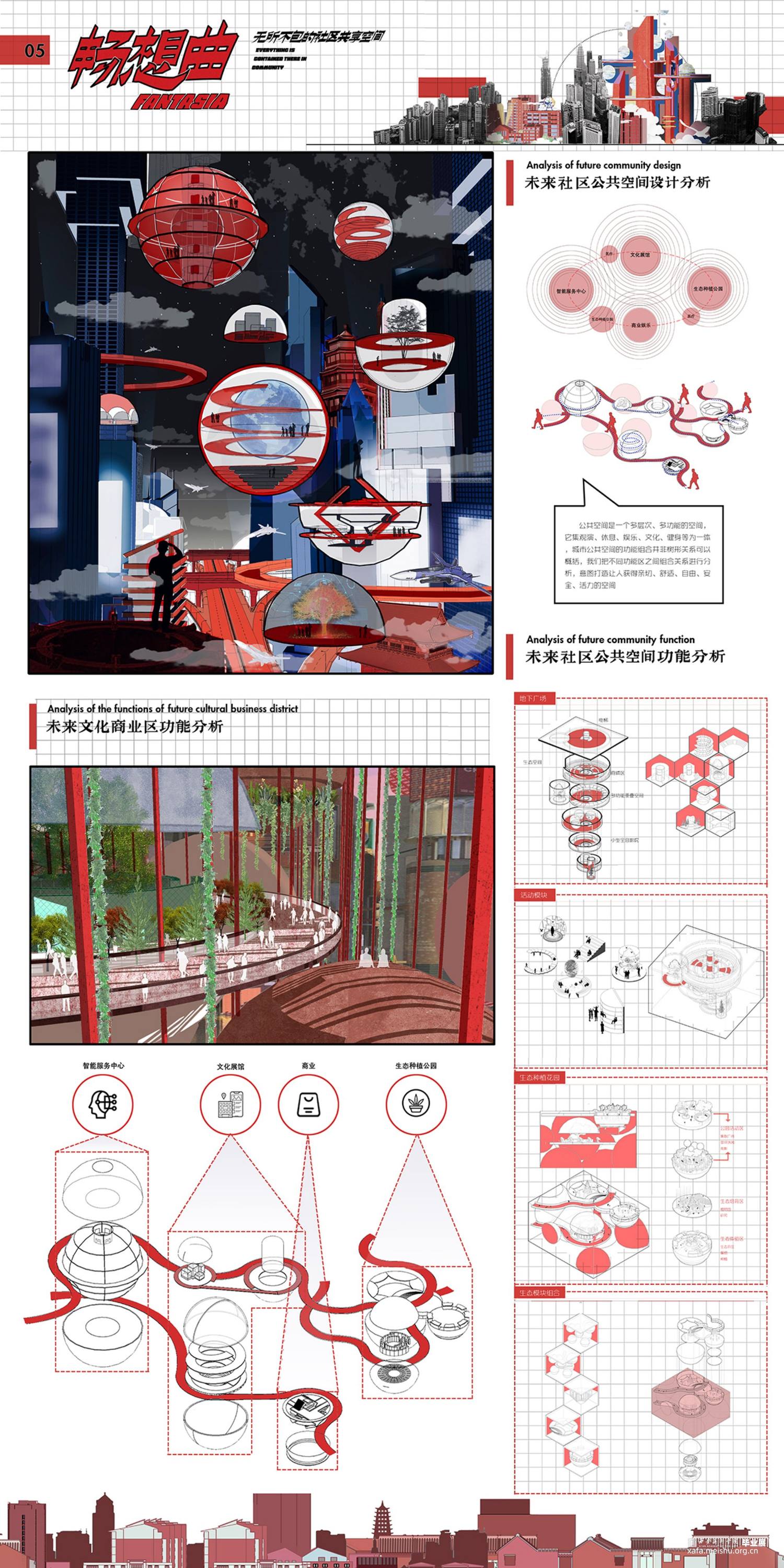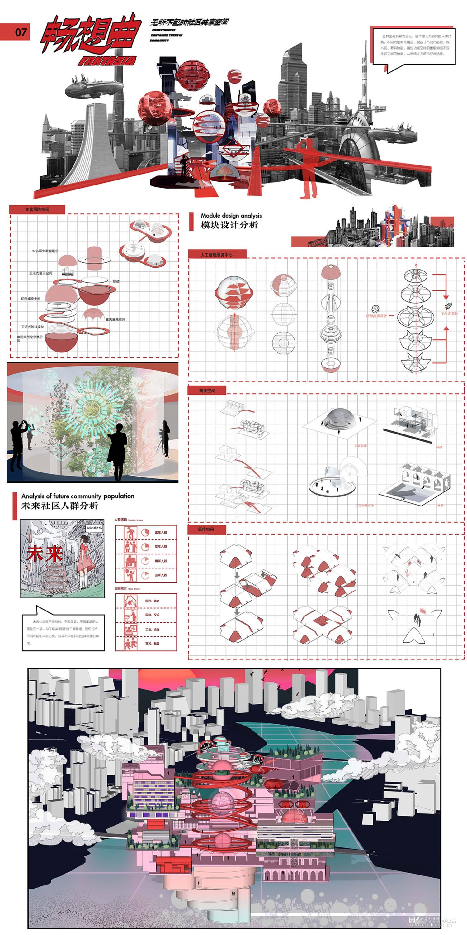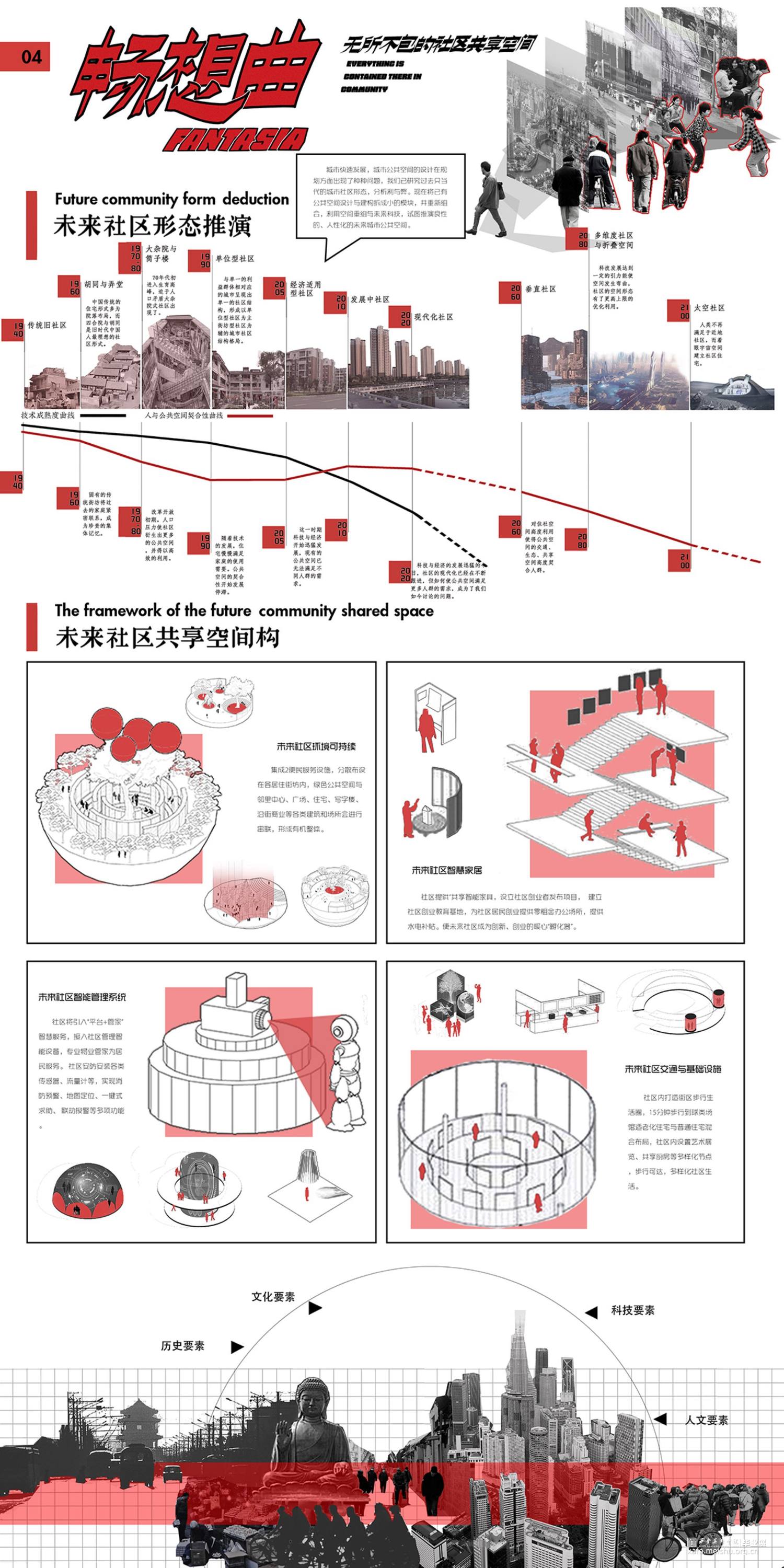 城市快速发展,城市公共空间的设计在规划方面出现了种种问题,我们已研究过去只当代的城市社区形态,分析利与弊。现在将已有公共空间设计与建构拆成小的模块,并重新组合,利用空间重组与未来科技,试图推演良性的、人性化的未来城市公共空间。