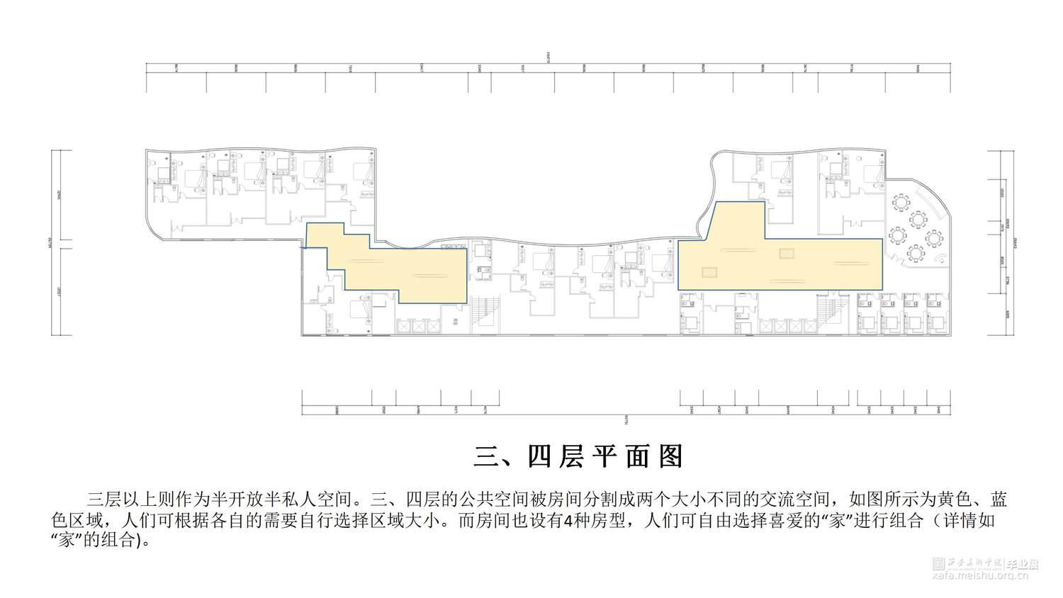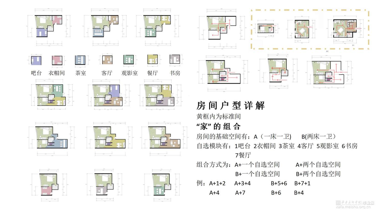 我们设计的酒店主要针对游人,属于度假型酒店。酒店主题有两点:共享和家。旨在人们于酒店中加强交流,延续家的生活方式,提高住宿记忆。在设计中,注重公共空间的布置,私密空间功能上的拓展。酒店共设七层,一层大小分布着各个基础设施,二层至七层则重点凸显主题。