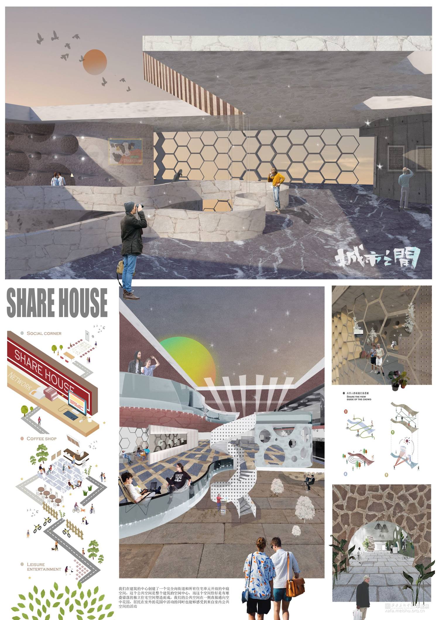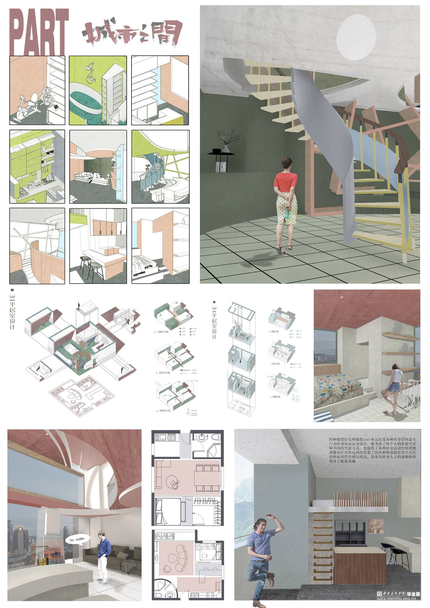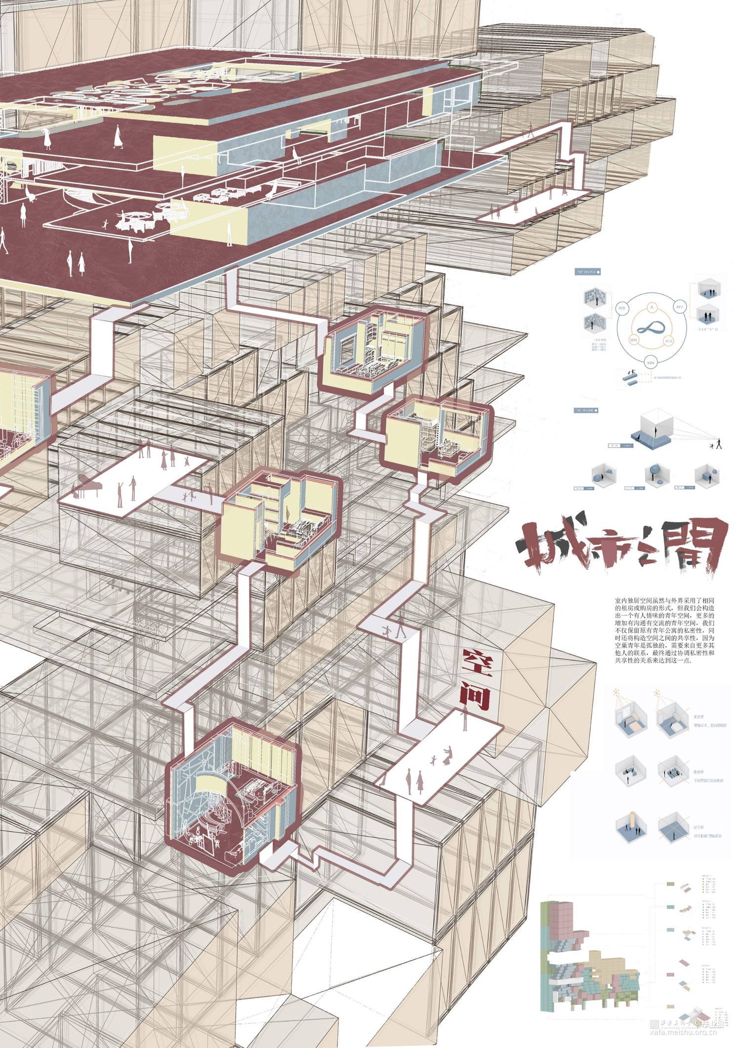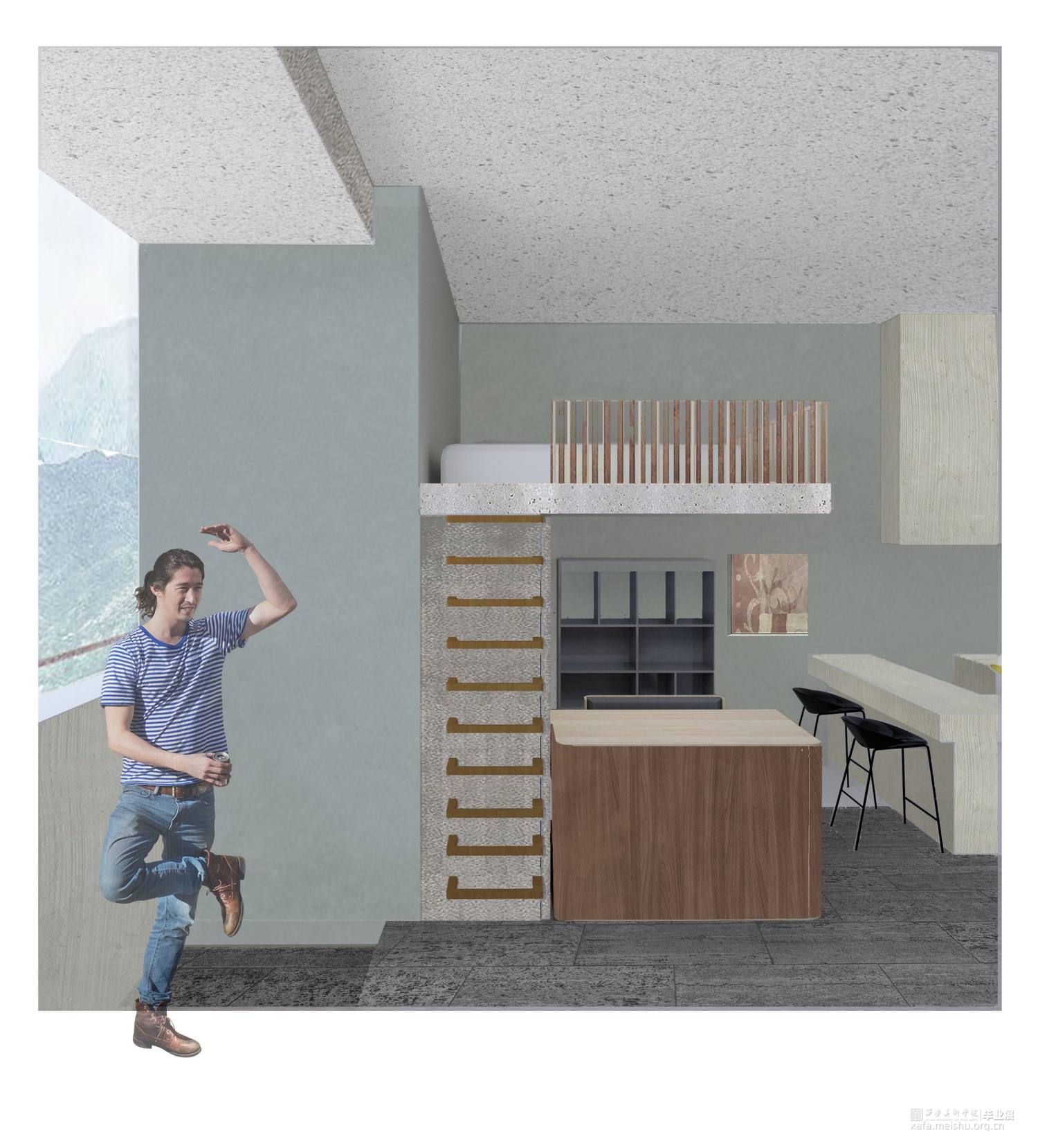 通过对“网”这一概念的解构与重组,并从整体理念中提炼出“间隙、空间、彼此之间”这三个概念,分别在建筑设计、居室设计以及共享空间设计这三个层面进行体现,让这些“空巢青年”在城市的间隙中寻找