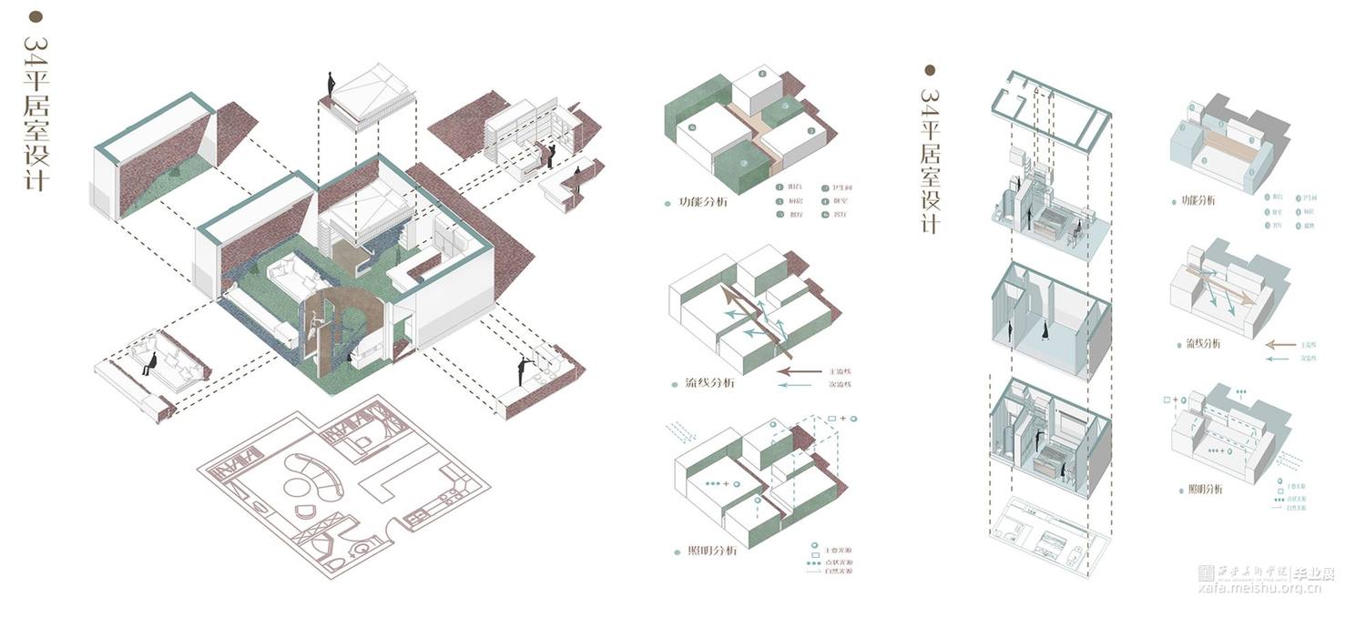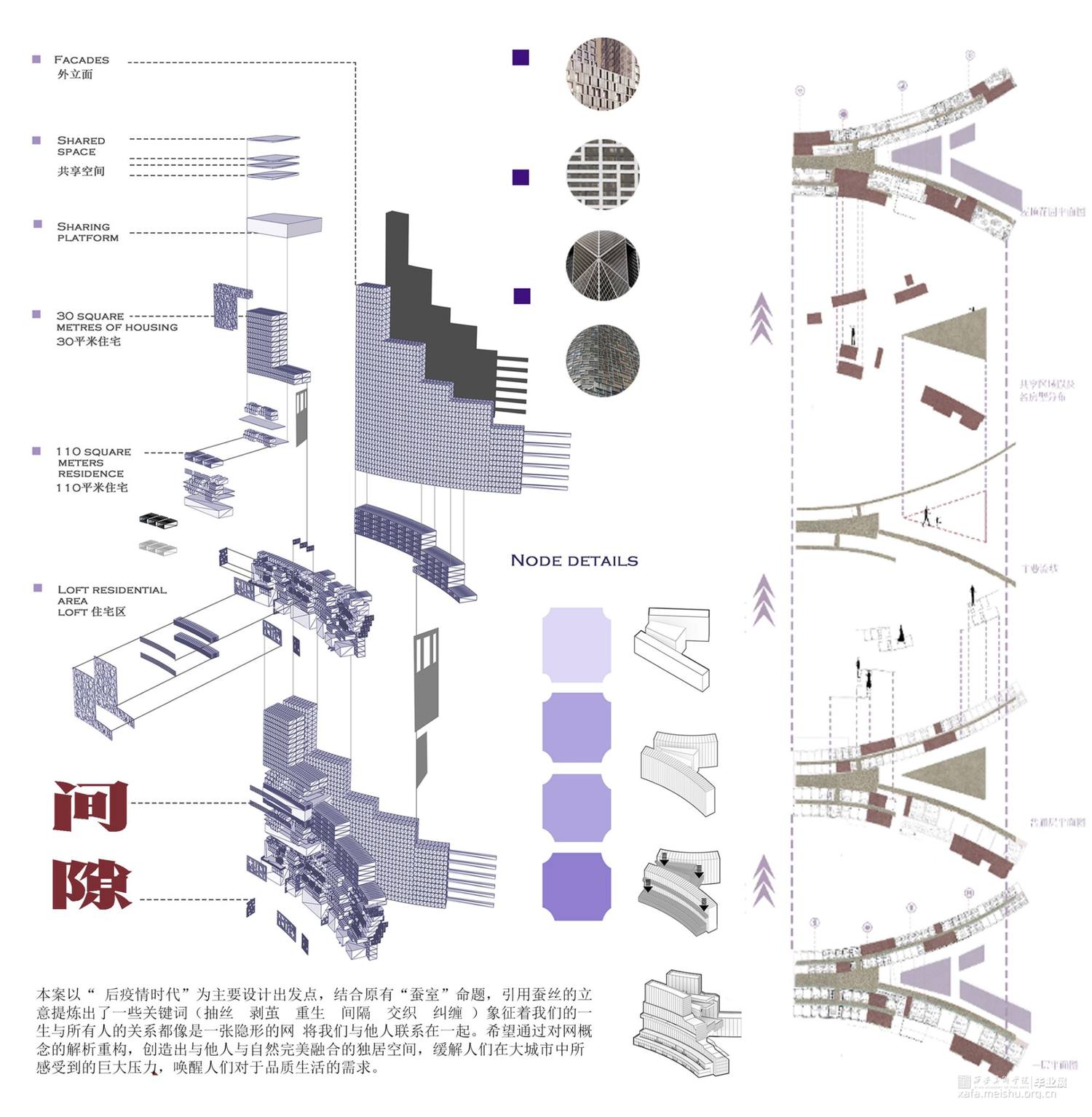 通过对“空巢青年”这一目标人群生活方式的探索与研究,旨在高密度的城市环境中,构建一种共享状态下适合年轻人居住的生活社区。以探索当代青年独立自主且多元健康的居室空间生活为主要研究方向,以蚕为意向,提炼出“抽丝·剥茧·重生·间隔·交织·纠缠“等概念,并以此展开设计,象征着人与他人的关系都像一张隐形的网将彼此分割又联接在一起。