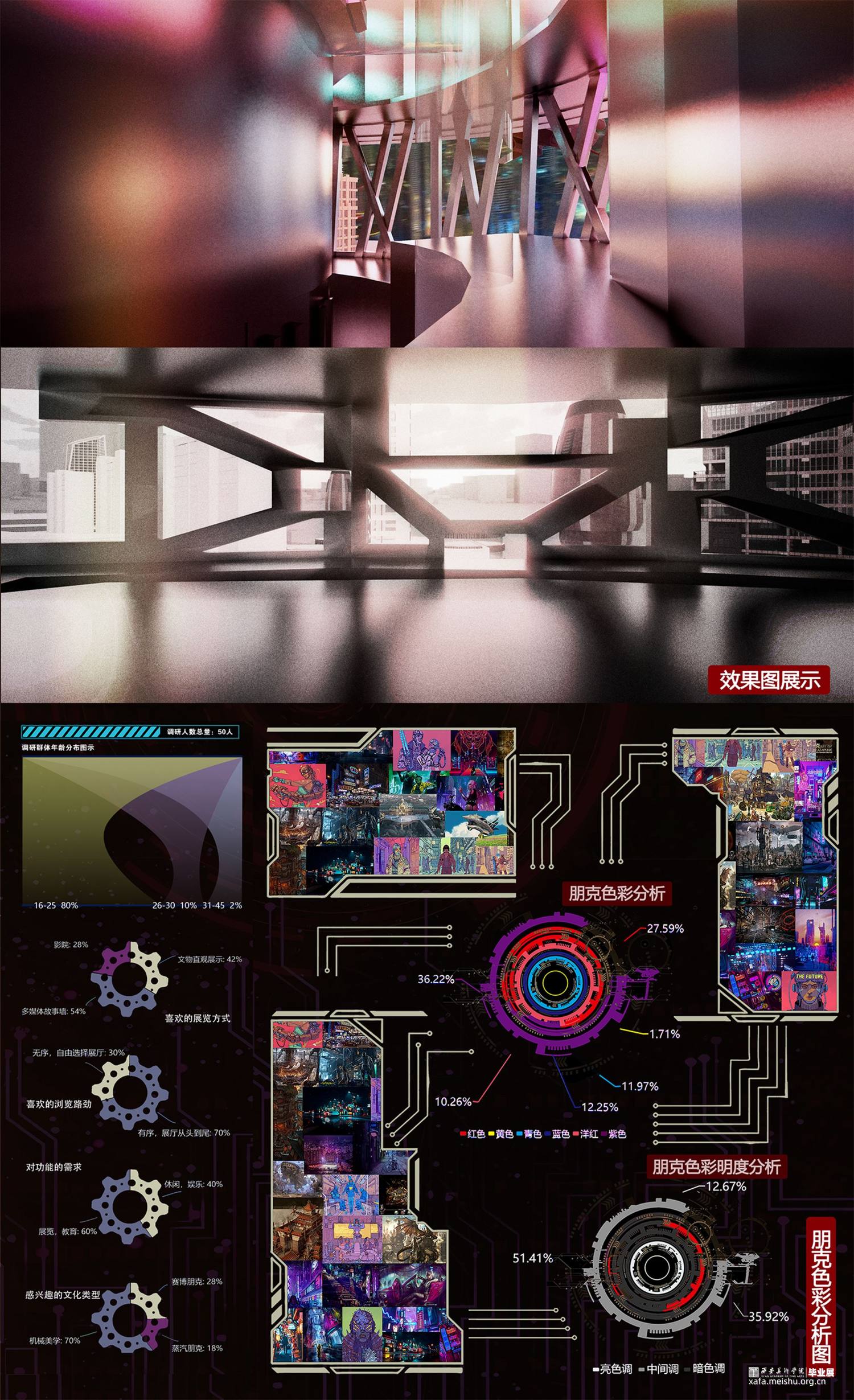 研究聚焦于朋克文化在当代审美语境下对建筑形态的扩展性,以朋克文化为艺术桥梁,进行对空间感受、视觉体验、展示交互手段等多方面的糅合,使得建筑能够呈现更好的朋克艺术效果,以此营造出一种有意义的空间体验而不仅仅是一系列的视觉图像,以便能够更好的进行朋克文化的传播与发展。设计