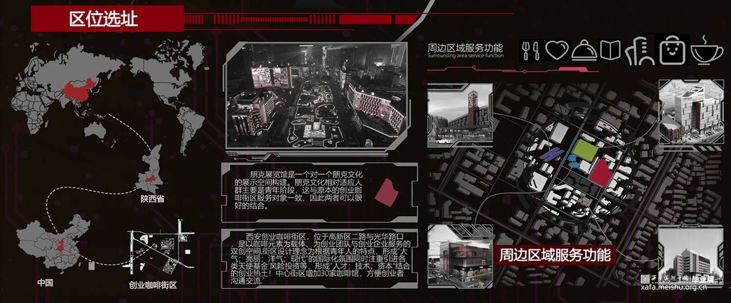 启示录·朋克展览馆是建立在朋克风格研究的基础上构建的展示空间。项目地址是位于西安市高新区创业咖啡街区内,建筑总面积7000㎡左右。设计旨在为传播朋克文化,并且为朋克文化喜爱者提供一个交流空间,同时也为咖啡街区提供一个休闲娱乐场所。