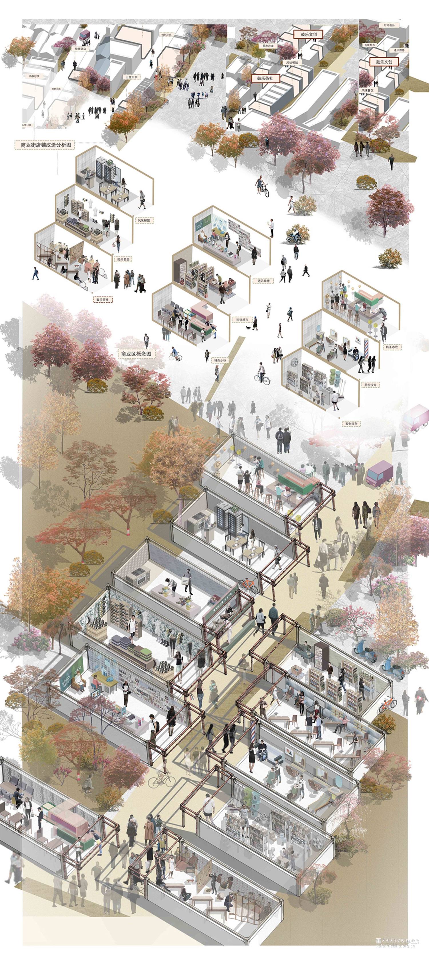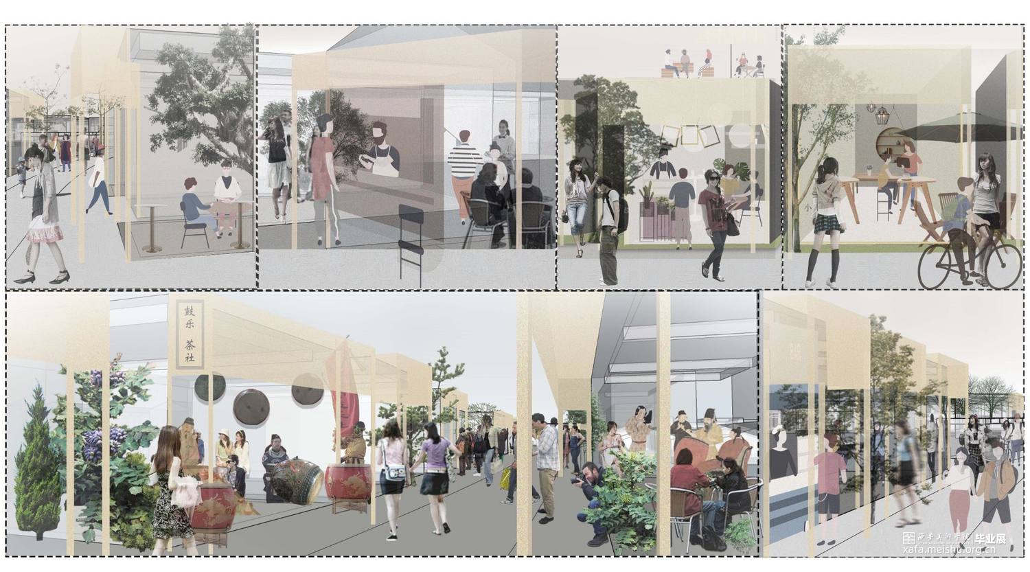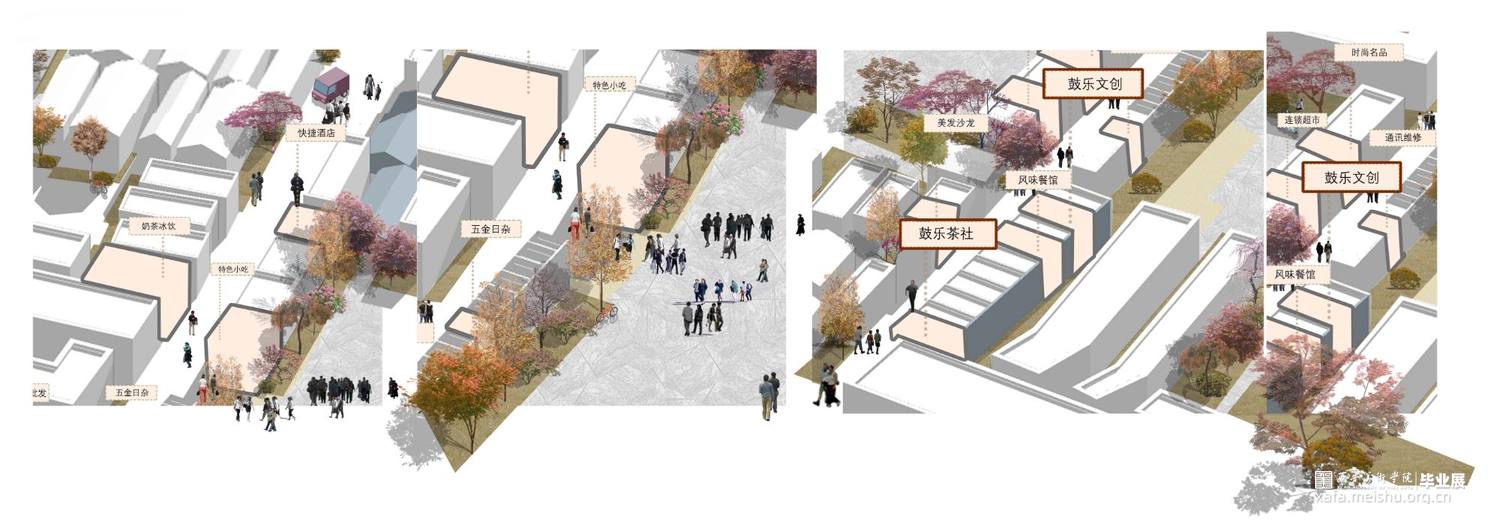 在“古香商业街”改造中增加了以鼓乐文化衍生的鼓乐茶社以及鼓乐文创商店,赋予了商业街“古香”的文化属性,建立了居民的文化认同感与归属感。时尚与传统结合的商业区也为高校学生的休闲娱乐生活增加了色彩。