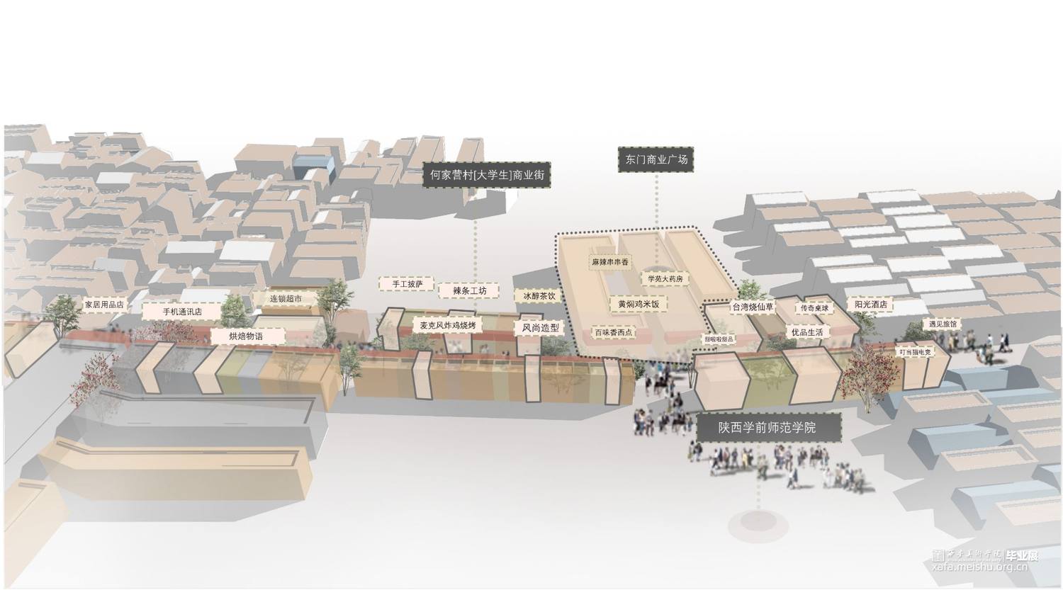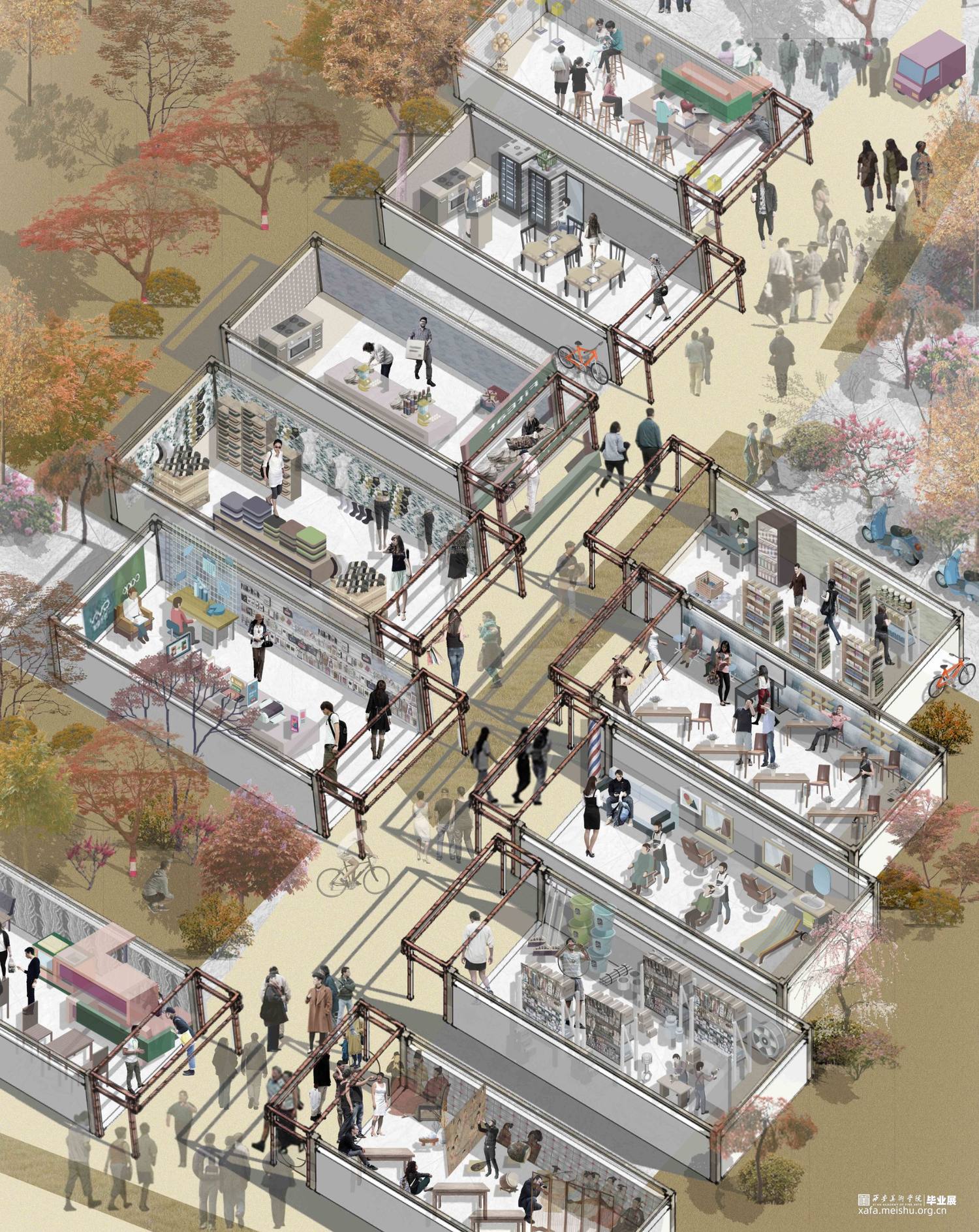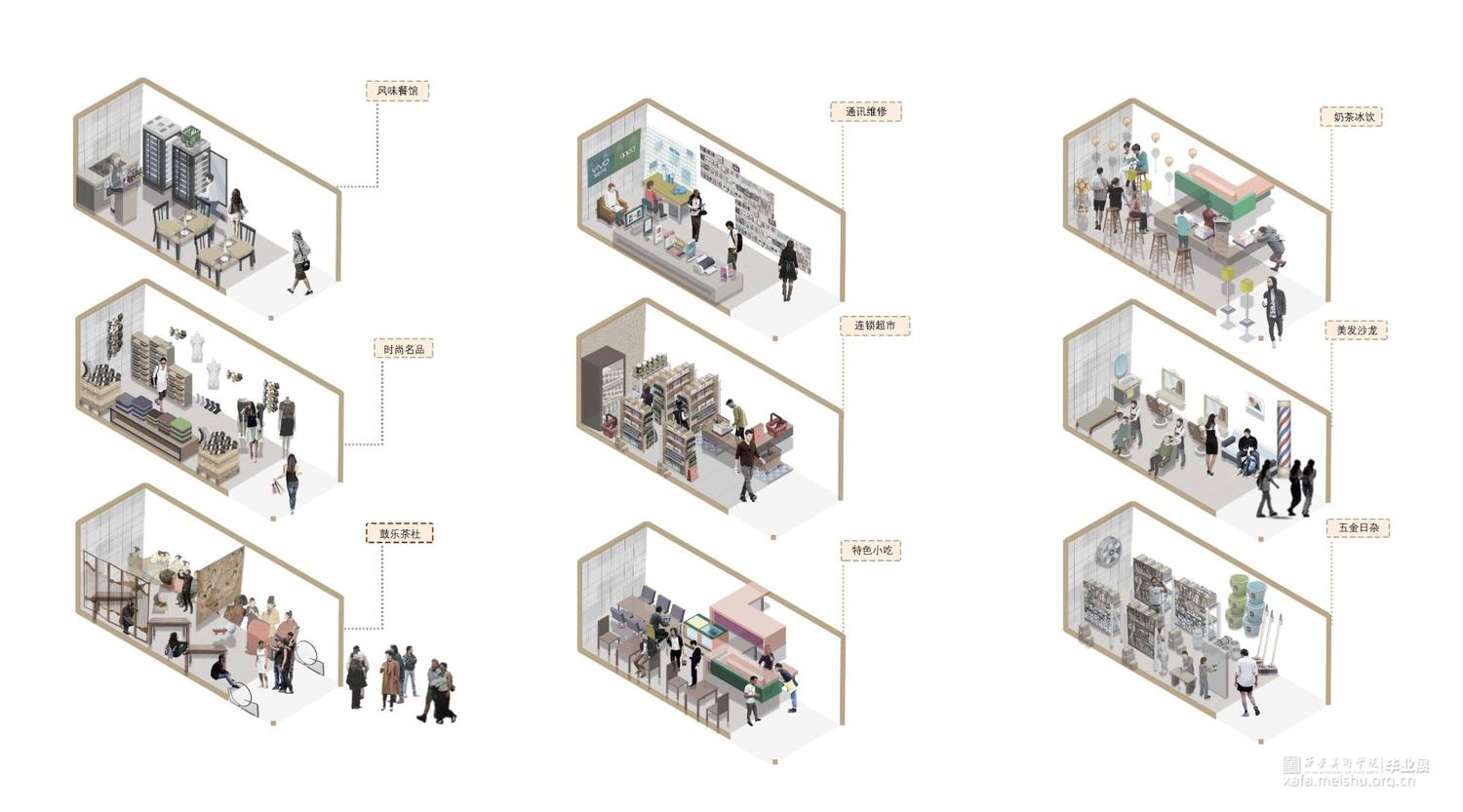 在“古香商业街”改造中增加了以鼓乐文化衍生的鼓乐茶社以及鼓乐文创商店,赋予了商业街“古香”的文化属性,建立了居民的文化认同感与归属感。时尚与传统结合的商业区也为高校学生的休闲娱乐生活增加了色彩。