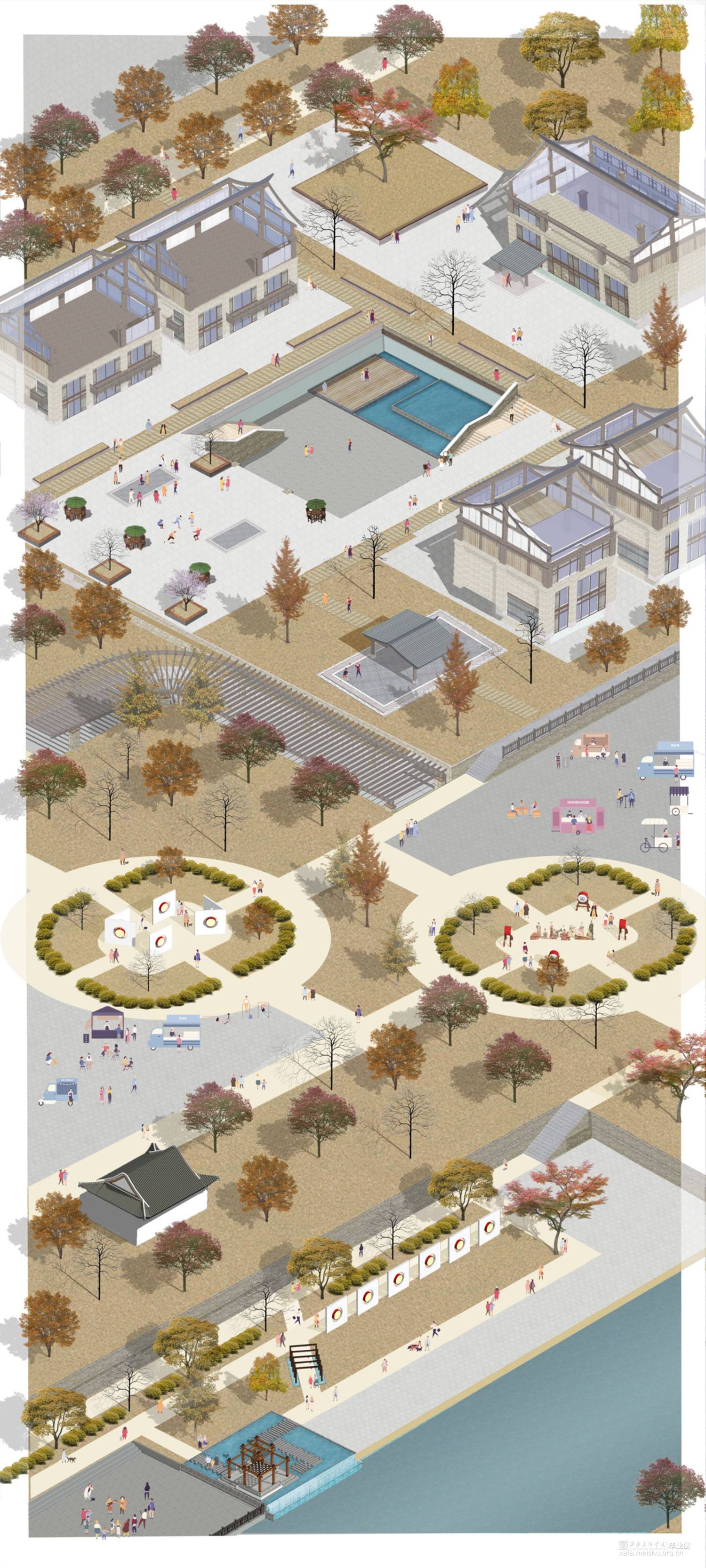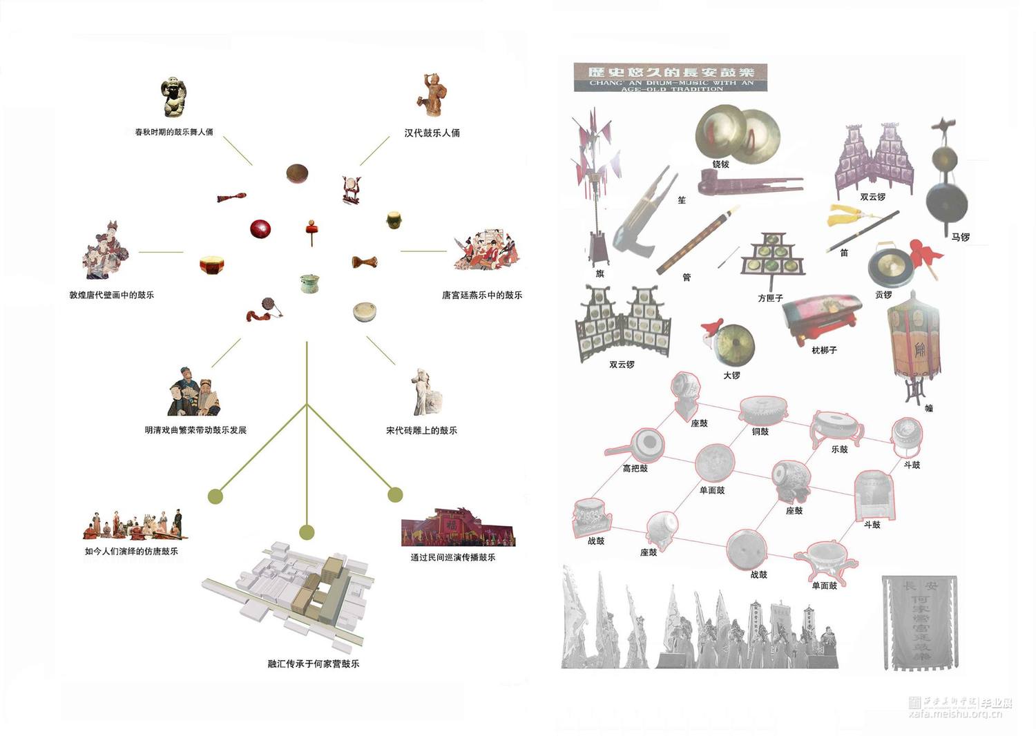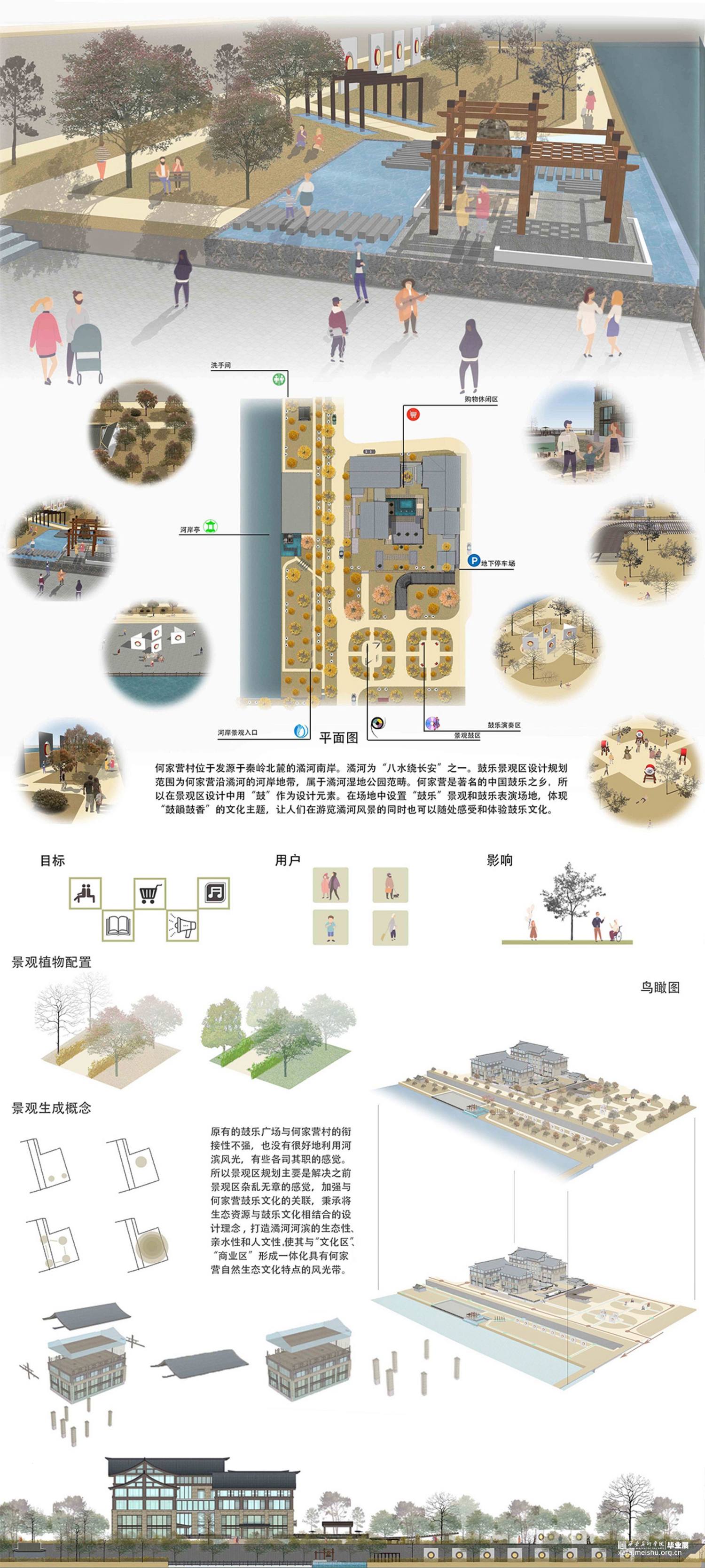 在“鼓乐景观区”规划中以“鼓乐”为设计元素,体现 “鼓韻鼓乡”的设计主题。对何家营村位于潏河河滨的原有景观区增加了鼓乐景观小品和鼓乐文化交流场地。秉承将生态资源与鼓乐文化相结合的设计理念,打造潏河河滨的生态性、亲水性和人文性,对何家营村沿岸的闲置空地利用起到了积极作用;扩展了何家营居民的休闲活动场地,使鼓乐文化传播得到更全面的辐射。