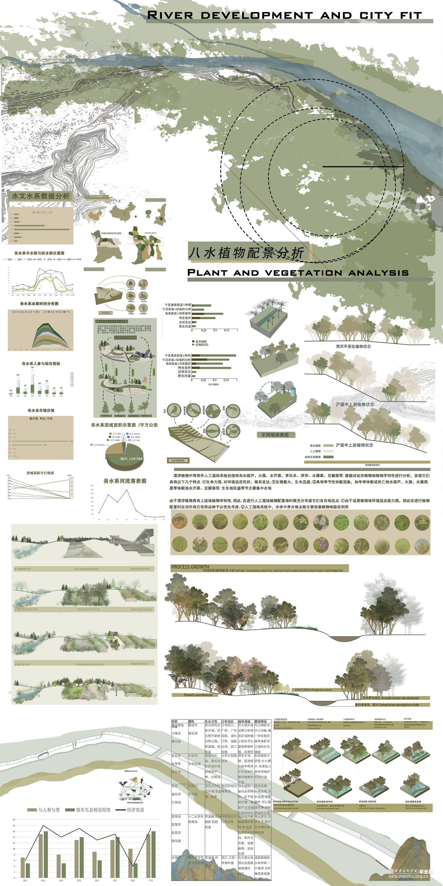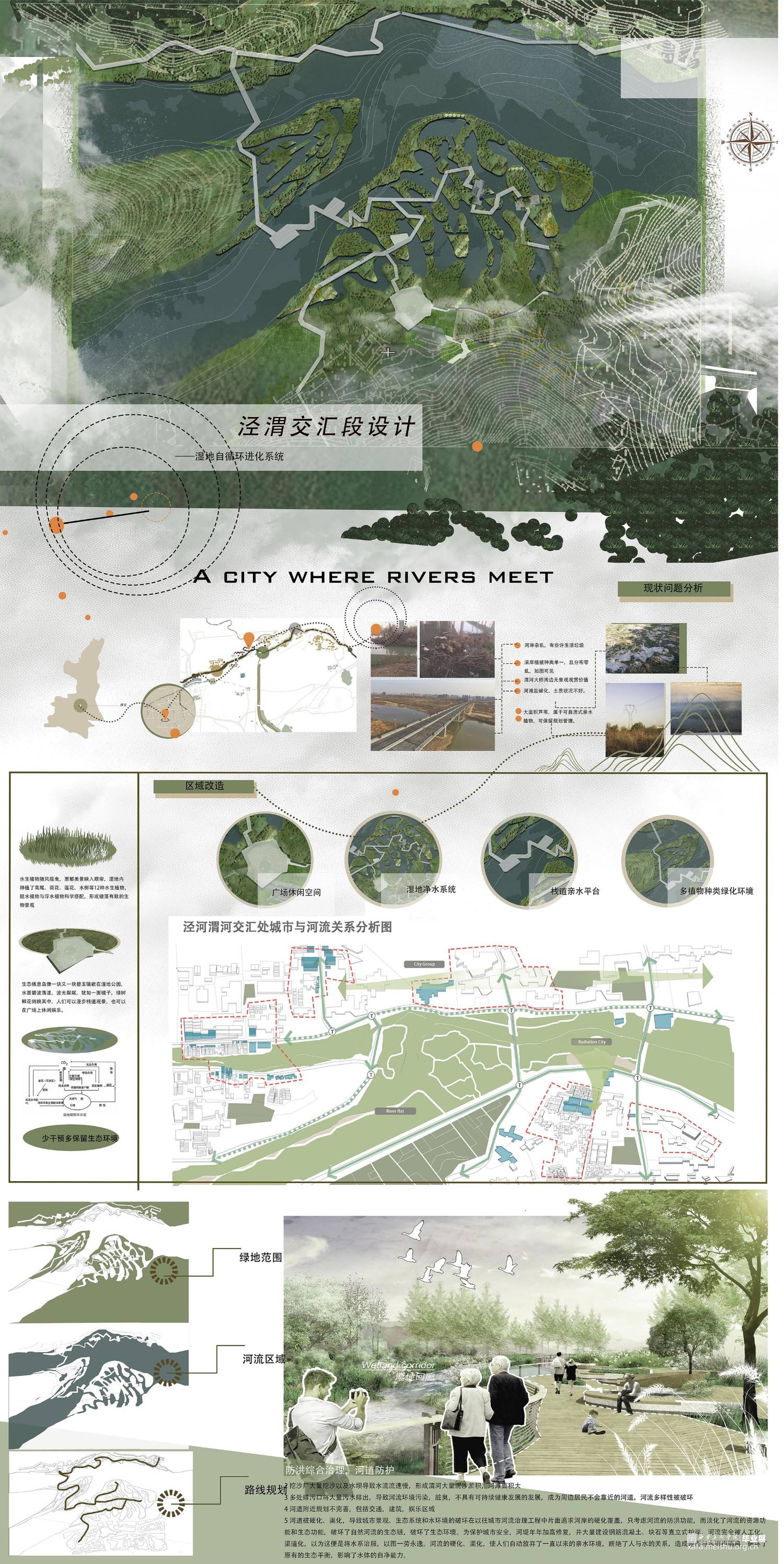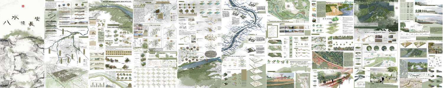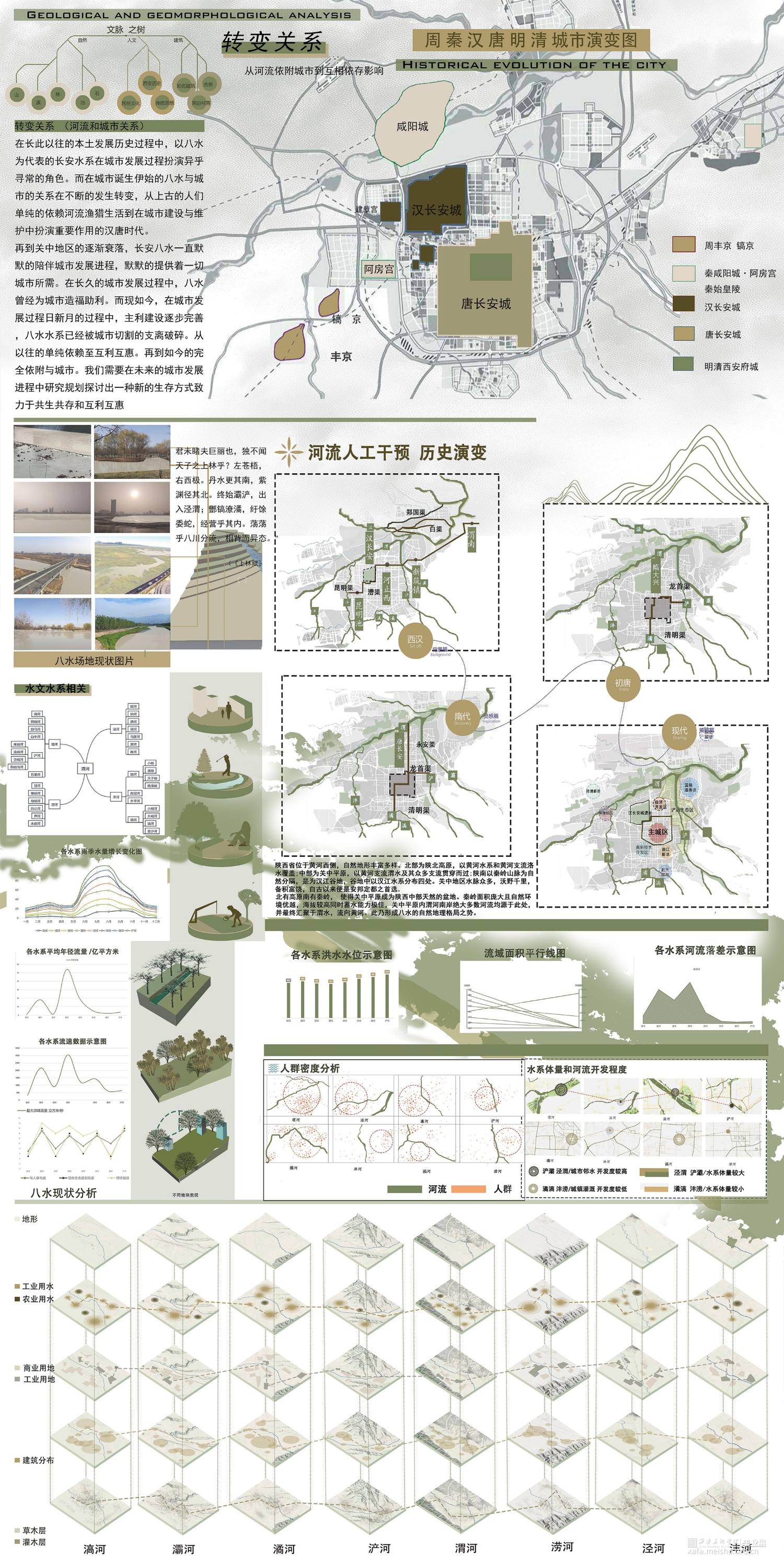 长安,一座拥有几千年文化历史的古都,凡人们到来这座古老的城市,无一不被其悠久的历史文积淀与美丽的城市风景所折服,胜名在外的关心中小吃,雄浑壮丽的大雁佛塔,风光迤逦的曲江清池,晨钟暮鼓,骊山晚照,灞柳诀别,咸阳古渡,无一不彰显着长安之美好。但也无一不提醒着我们,作为十三朝古都,长安,也拥有并依靠着丰富的水系资源,而毫不夸张的讲,长安也是一座依靠水系滋养所崛起的城市,随着被定义为国家新一线城市,新时代的长安也迎来的更新的发展,但回顾来路,不知何时滋润长安的八水,已经各不相同,其状态也无法与往日“汤汤乎八川分流”同日而语。城市的飞速发展与繁荣,却是的我们遗忘了这座城市的供养者,泾渭分明被打颠倒,沣滈不现往日时光,潏涝几乎涓涓细流,城市与河流的冲突似乎愈演愈烈。而本设计即以此为解决目标,定位于上层思考,顶层设计,致力于解决城市体系与河流水系的相互矛盾与纠缠。将水网化为城市发展之得力辅助,御城市建设于水系生态发展。致力于修复与解决,转变二者相互关系,保护与开发水网,规划与引导城市发展,始终着眼于宏大整体,同时每一条河流我们通过多个层面进行解析,量体裁衣,为每一条河流进行了精准定位。八大水系是回馈这座城市的整体性质,缺一不可,每一个发力点的构架都会影响到其他的水系,因此在设想设计过程中要为其他 兄弟水系所考量,最后的作用才会持续长久。 再次是在运用海绵的原理将这种场地由硬性化变为弹性化时,要与洪水为友,将古代中国“以柔克刚”的哲学思想融入整个河流景观节点,并将所有的点连成线,线辐散成面,最后各个面链接成一个半球,使河流的作用发挥极致的同时,也能更好地进行自我净化。最后选取泾渭与潏滈两点极具代表性的地段区域入手,进行具体分析,升华设计,建成完整的城市水网关系规划与设计,即着眼于全局,又发力于细微,大至百年发展,小甚水岸细微。无一不用心论证,全面思考,经过了反复的研究努力与日夜积累,才得以交出这一份满意的答卷呈现于大家。