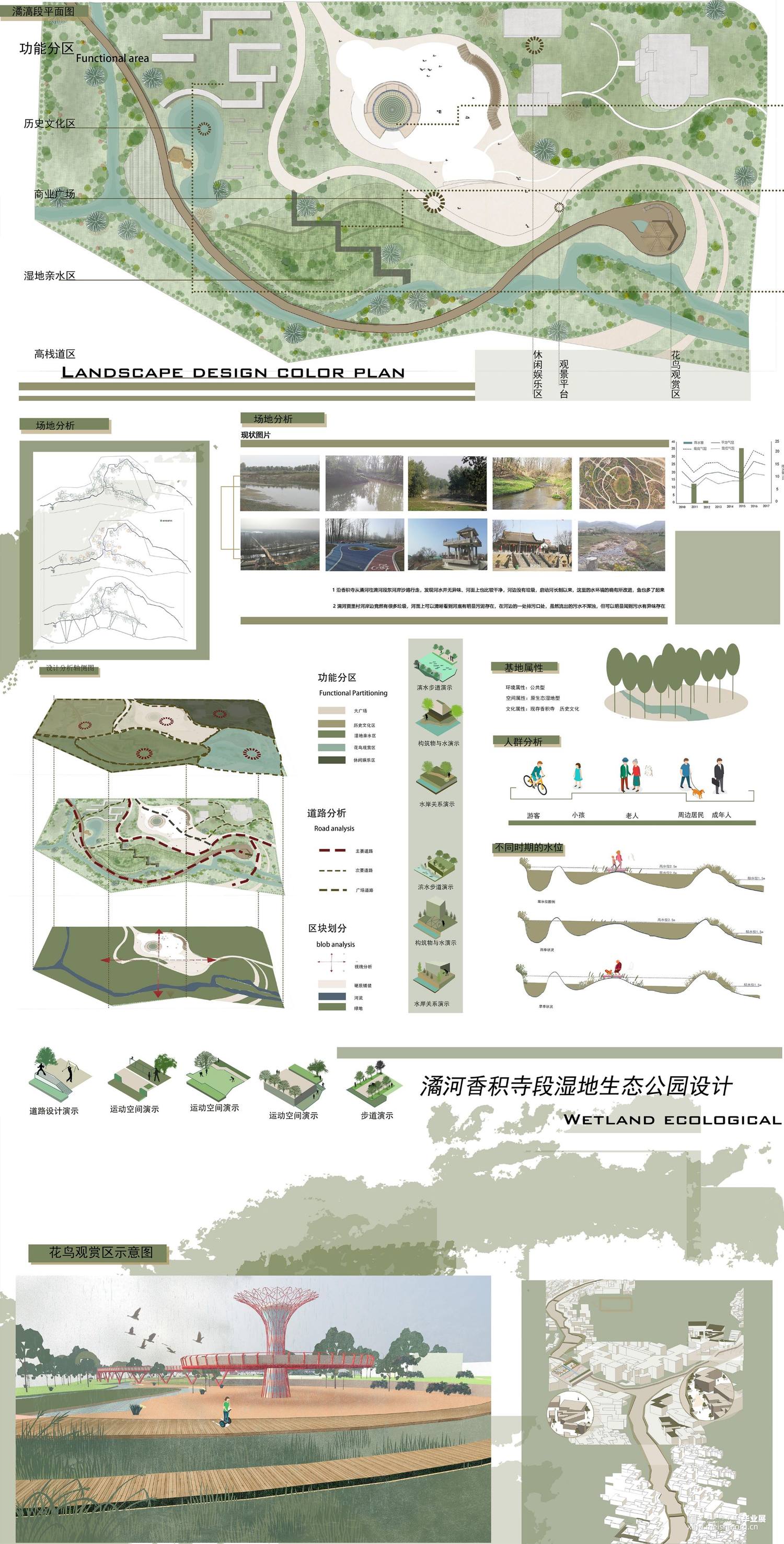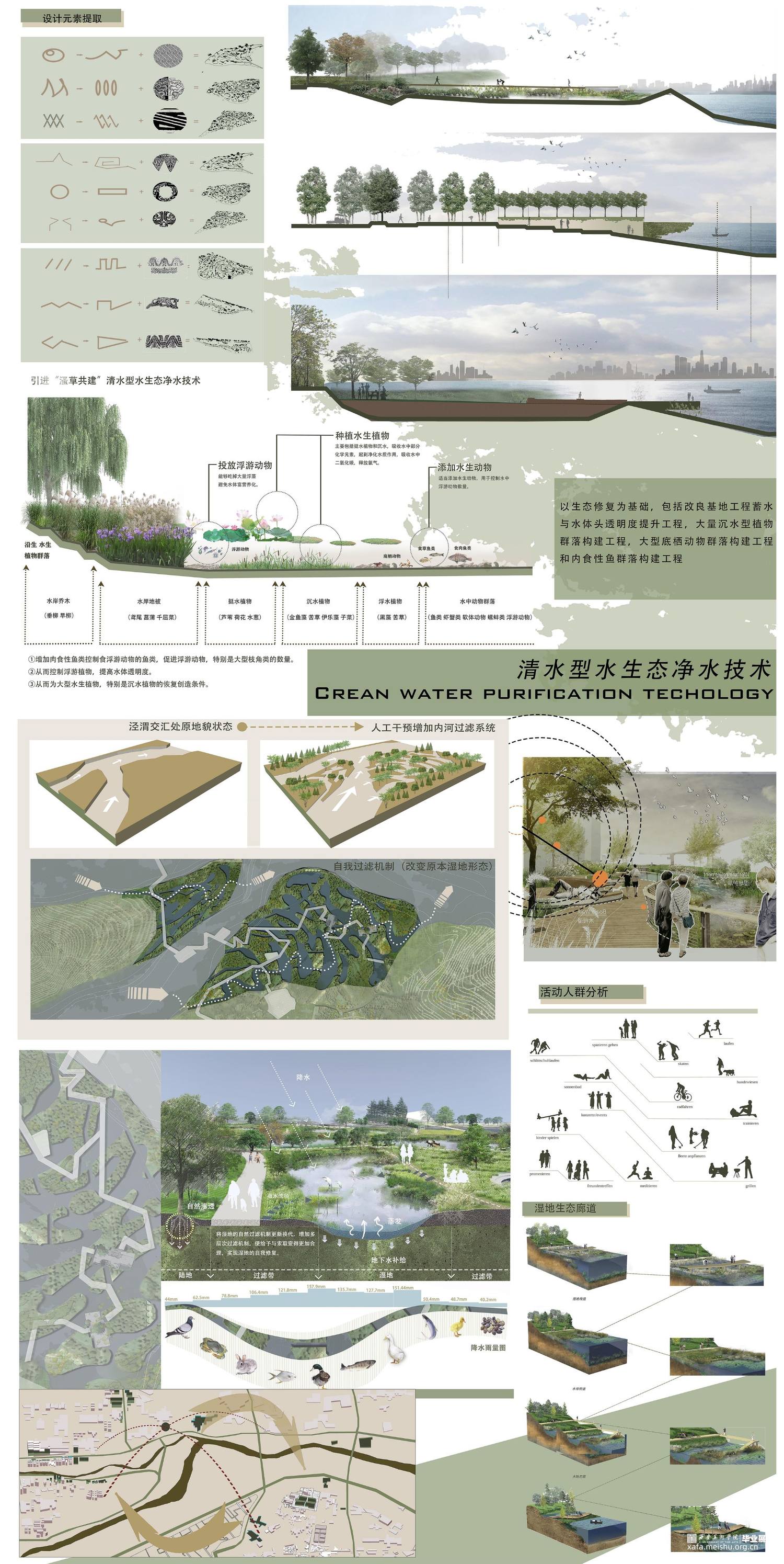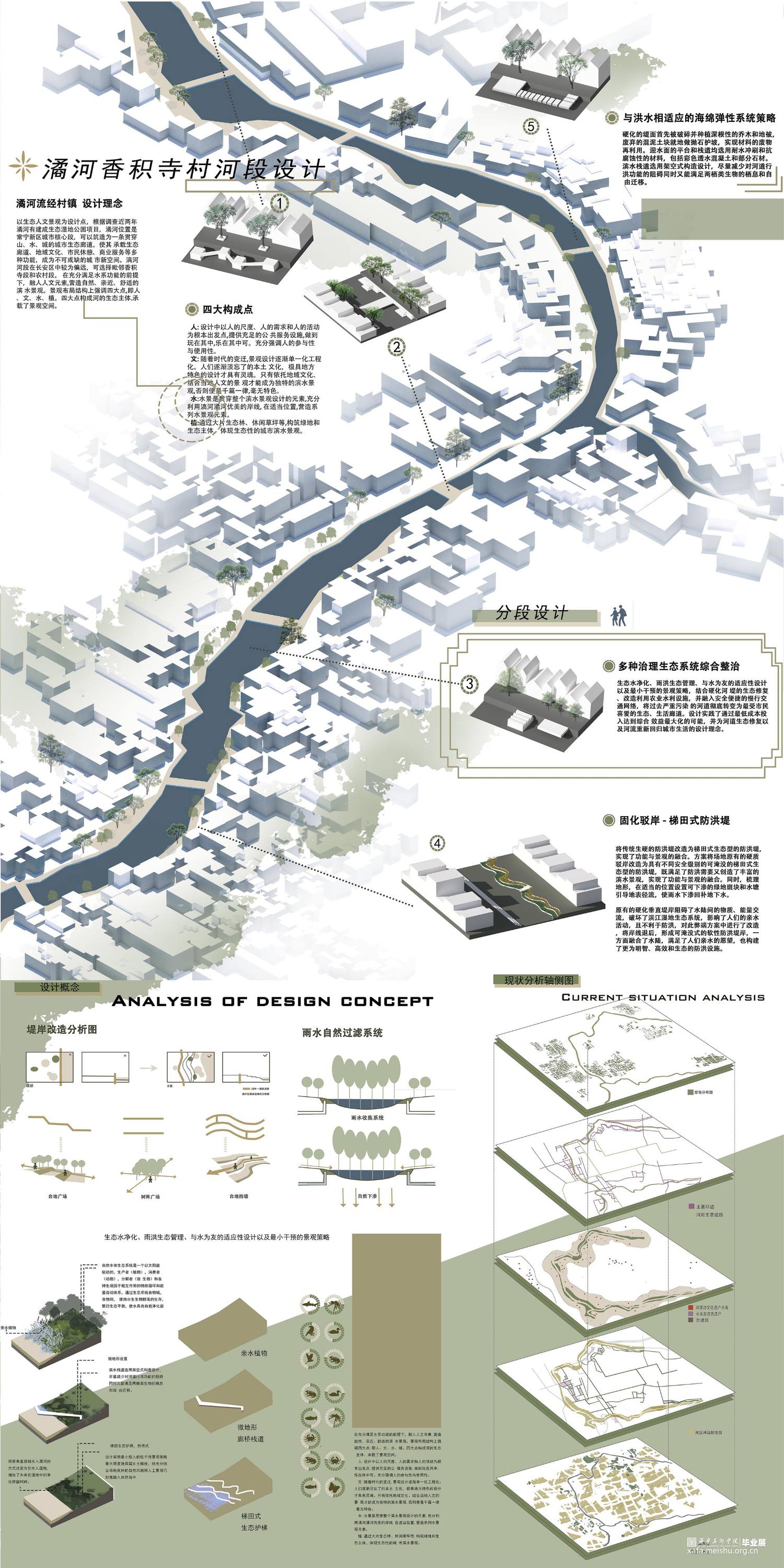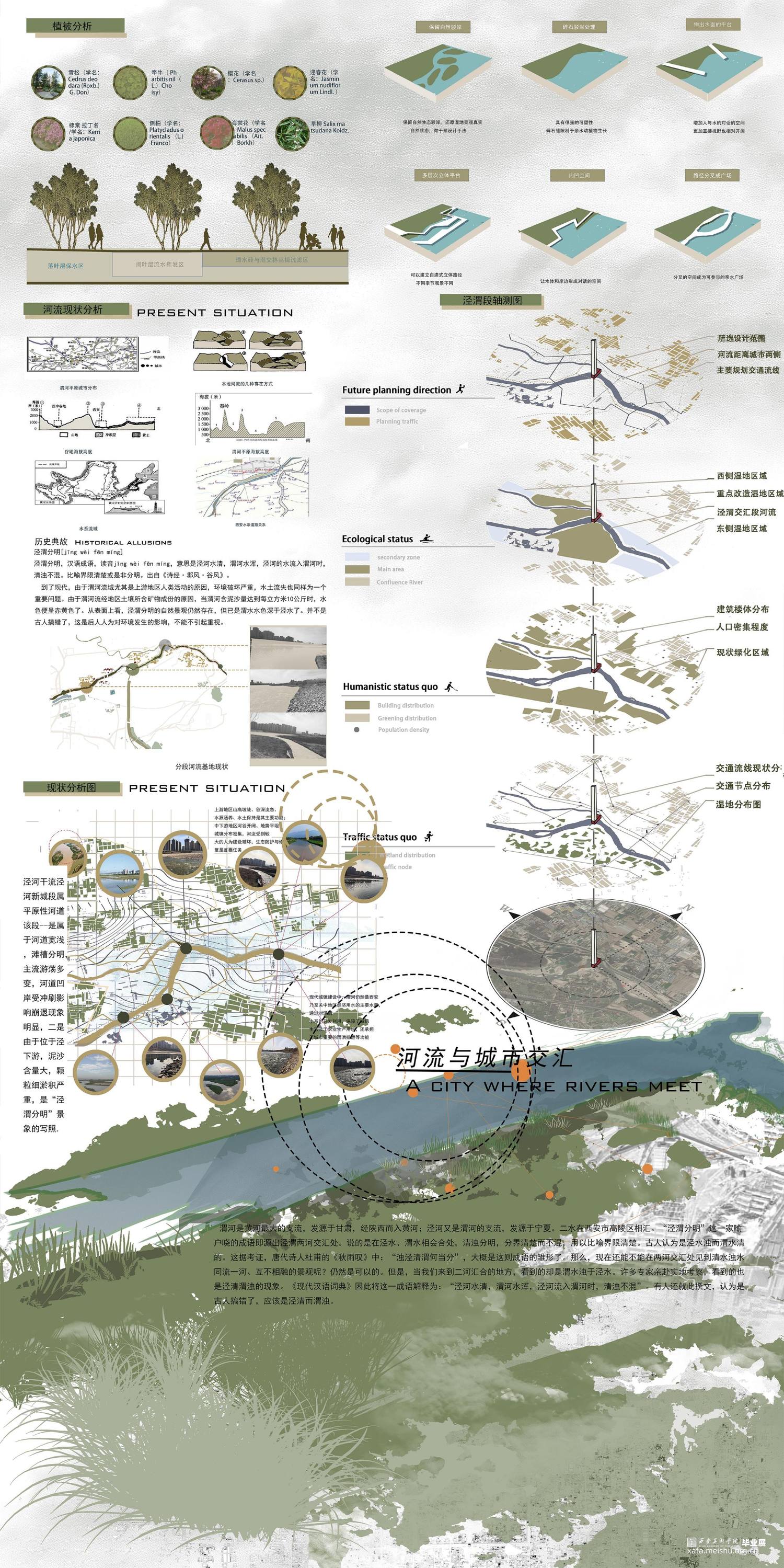 长安,一座拥有几千年文化历史的古都,凡人们到来这座古老的城市,无一不被其悠久的历史文积淀与美丽的城市风景所折服,胜名在外的关心中小吃,雄浑壮丽的大雁佛塔,风光迤逦的曲江清池,晨钟暮鼓,骊山晚照,灞柳诀别,咸阳古渡,无一不彰显着长安之美好。但也无一不提醒着我们,作为十三朝古都,长安,也拥有并依靠着丰富的水系资源,而毫不夸张的讲,长安也是一座依靠水系滋养所崛起的城市,随着被定义为国家新一线城市,新时代的长安也迎来的更新的发展,但回顾来路,不知何时滋润长安的八水,已经各不相同,其状态也无法与往日“汤汤乎八川分流”同日而语。城市的飞速发展与繁荣,却是的我们遗忘了这座城市的供养者,泾渭分明被打颠倒,沣滈不现往日时光,潏涝几乎涓涓细流,城市与河流的冲突似乎愈演愈烈。而本设计即以此为解决目标,定位于上层思考,顶层设计,致力于解决城市体系与河流水系的相互矛盾与纠缠。将水网化为城市发展之得力辅助,御城市建设于水系生态发展。致力于修复与解决,转变二者相互关系,保护与开发水网,规划与引导城市发展,始终着眼于宏大整体,同时每一条河流我们通过多个层面进行解析,量体裁衣,为每一条河流进行了精准定位。八大水系是回馈这座城市的整体性质,缺一不可,每一个发力点的构架都会影响到其他的水系,因此在设想设计过程中要为其他 兄弟水系所考量,最后的作用才会持续长久。 再次是在运用海绵的原理将这种场地由硬性化变为弹性化时,要与洪水为友,将古代中国“以柔克刚”的哲学思想融入整个河流景观节点,并将所有的点连成线,线辐散成面,最后各个面链接成一个半球,使河流的作用发挥极致的同时,也能更好地进行自我净化。最后选取泾渭与潏滈两点极具代表性的地段区域入手,进行具体分析,升华设计,建成完整的城市水网关系规划与设计,即着眼于全局,又发力于细微,大至百年发展,小甚水岸细微。无一不用心论证,全面思考,经过了反复的研究努力与日夜积累,才得以交出这一份满意的答卷呈现于大家。