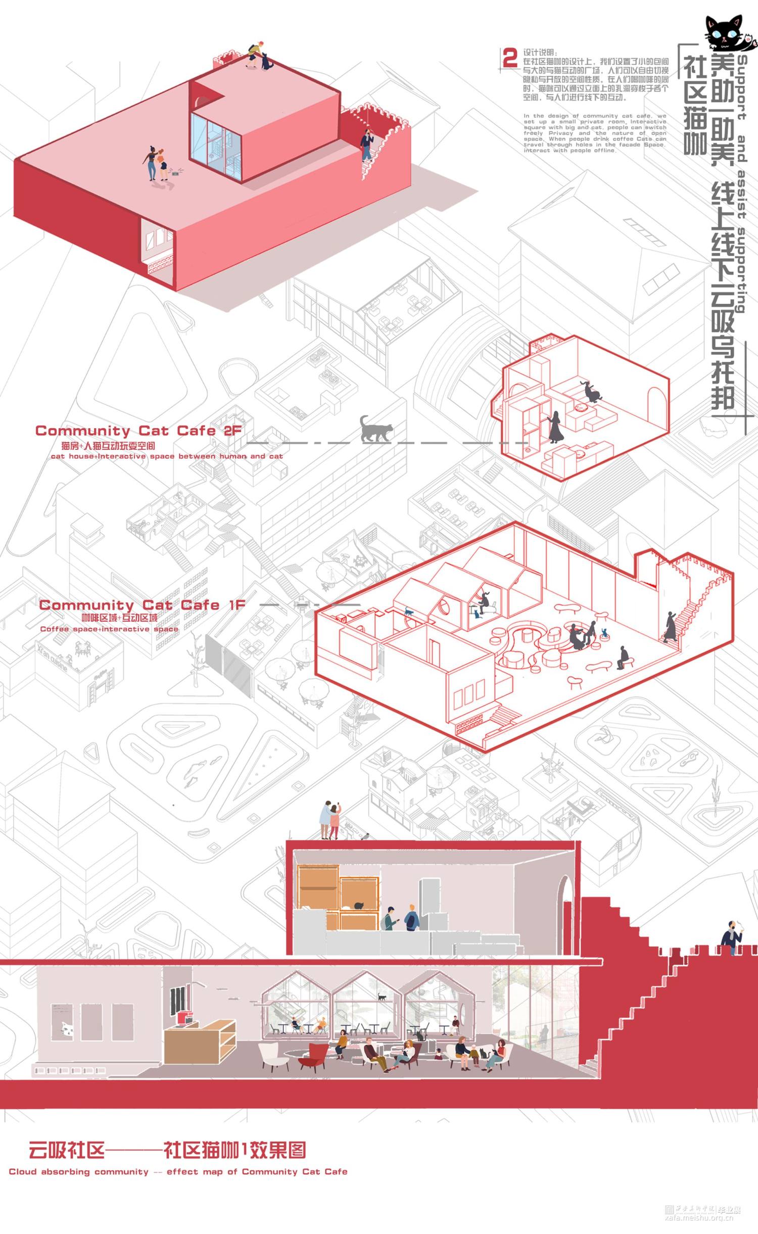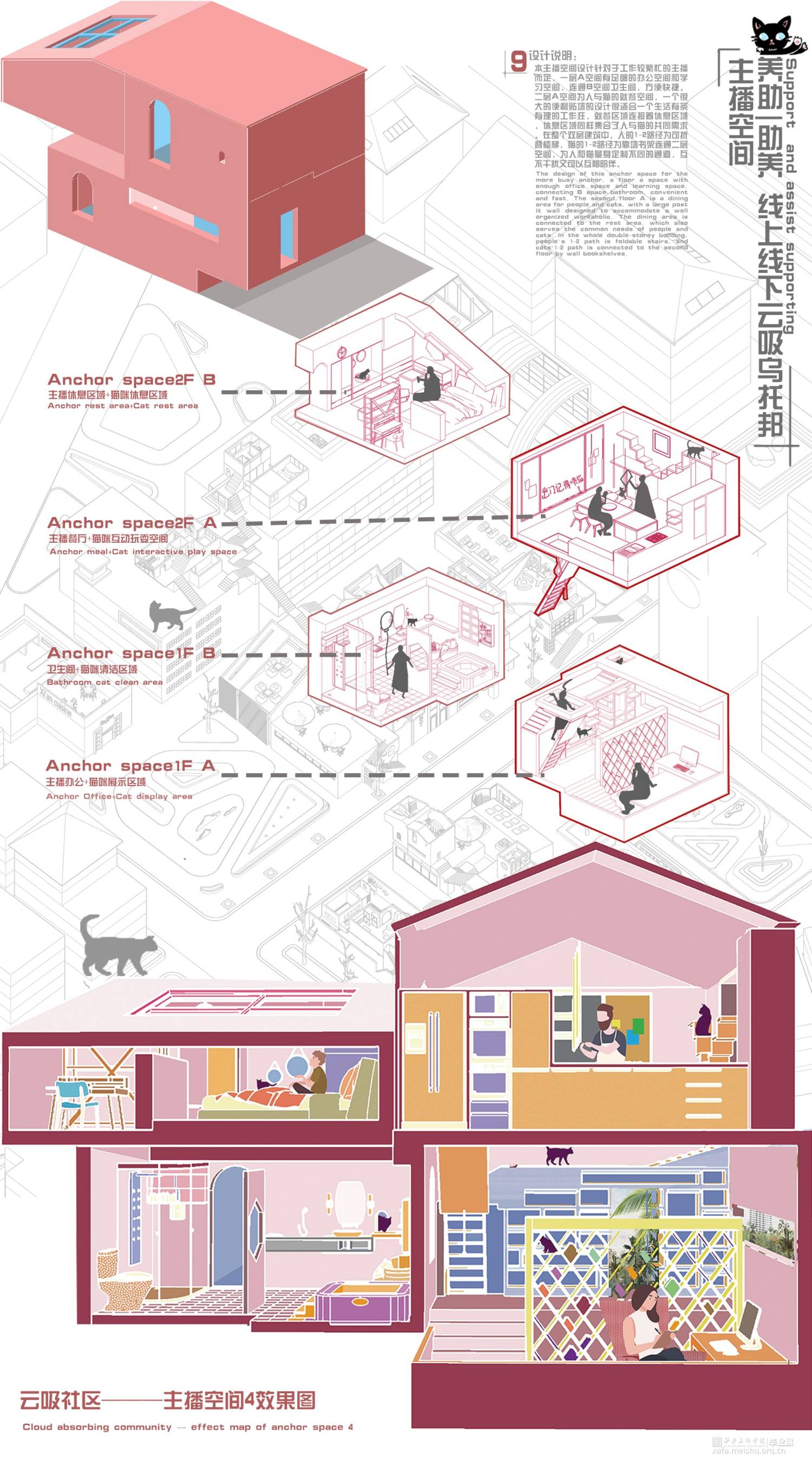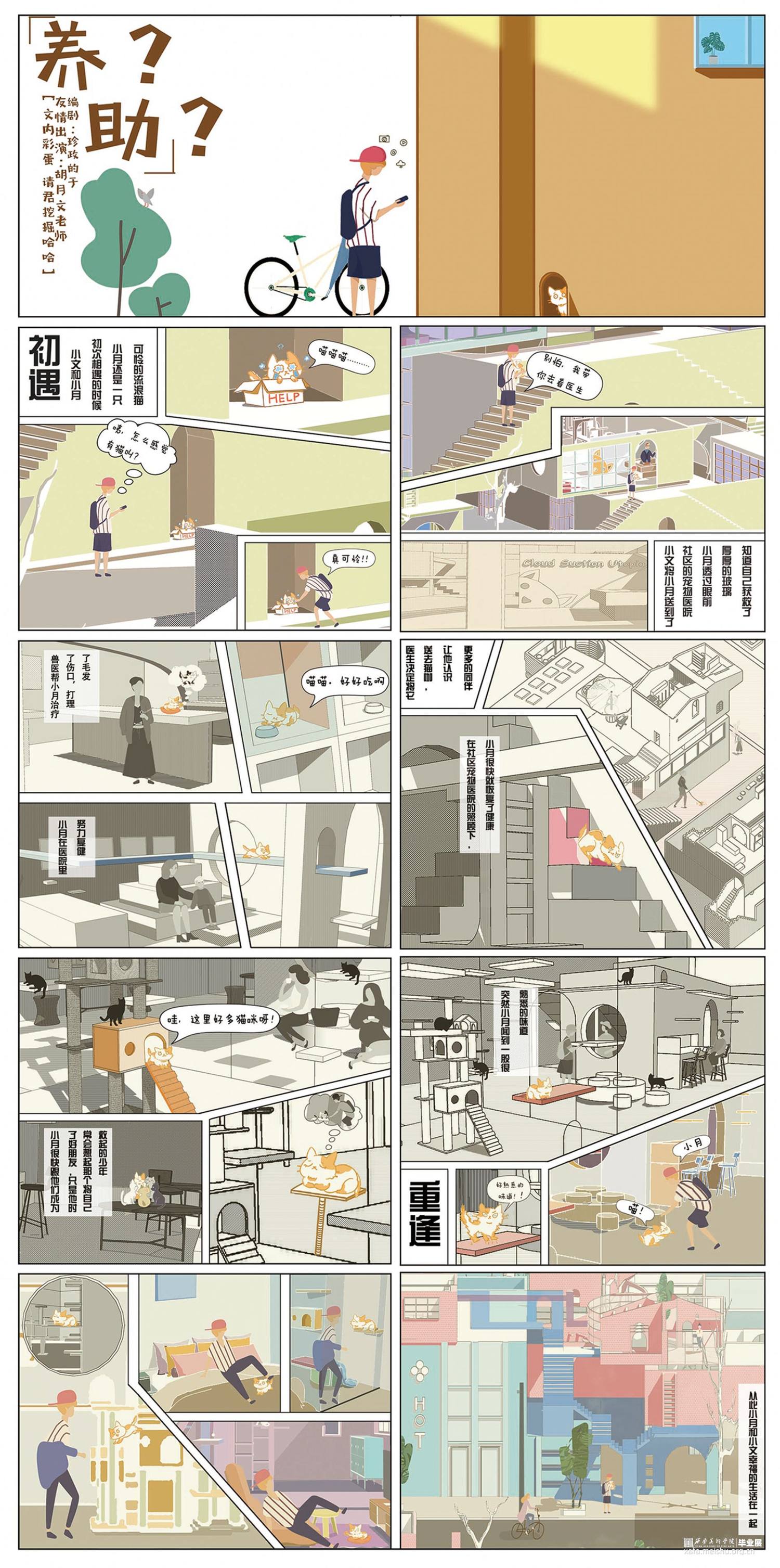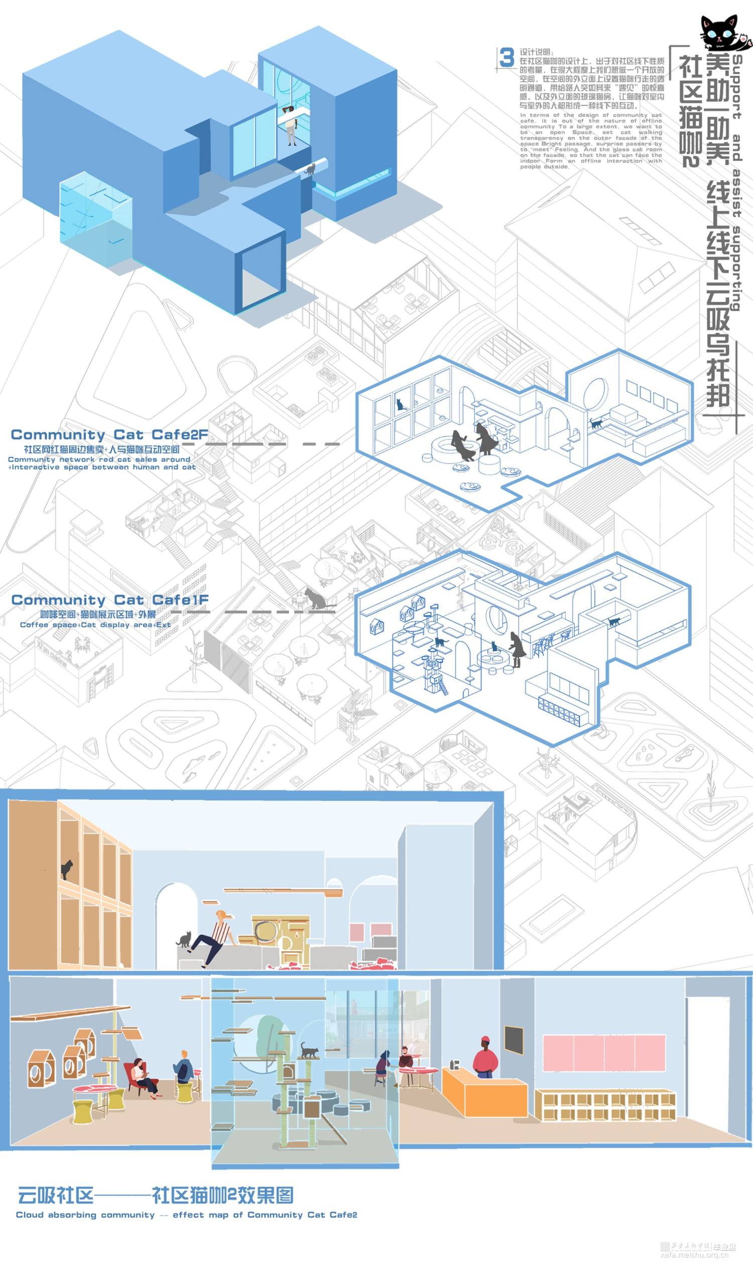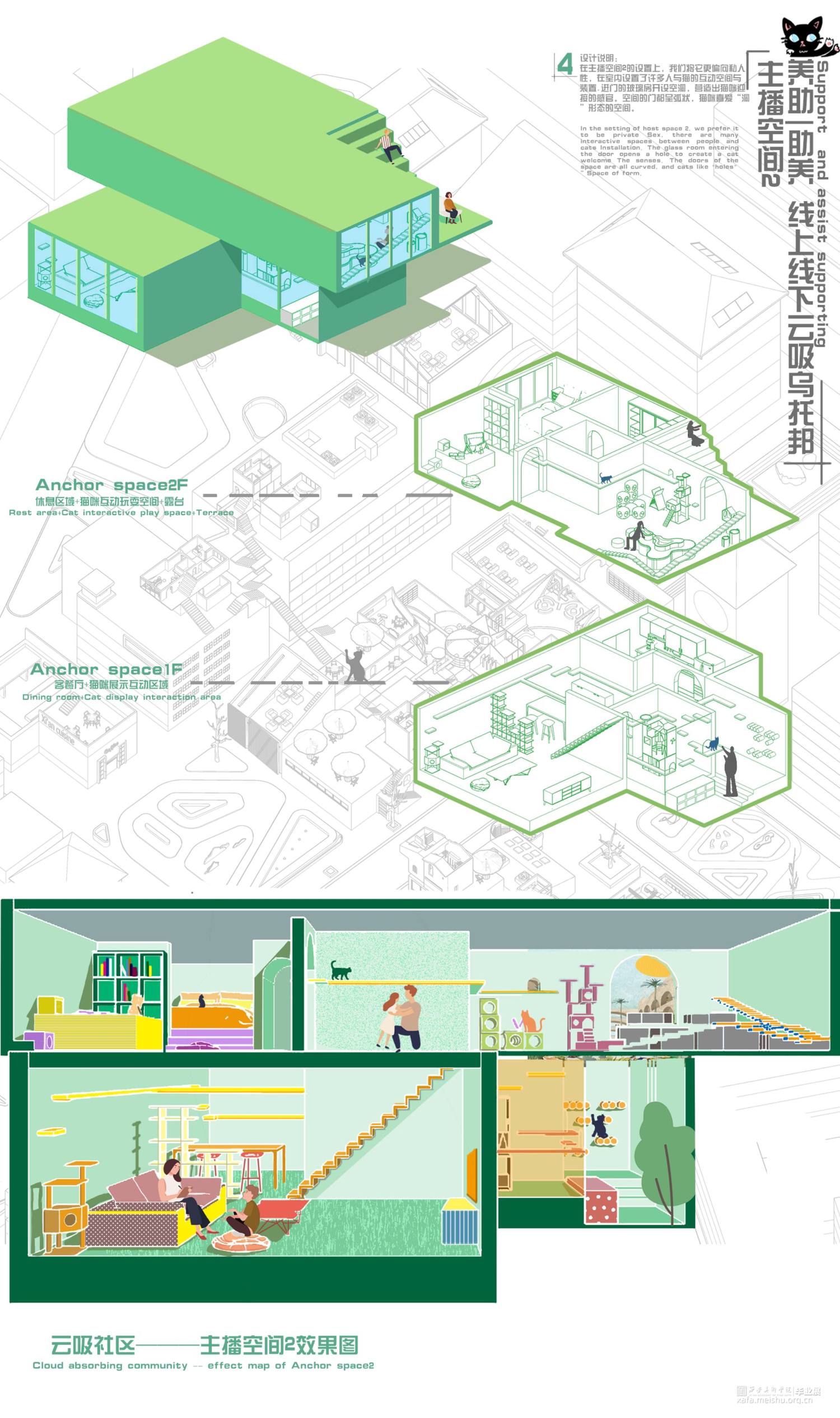 从网络线上“云吸”这一概念入手,思考人宠相处空间模式的再定义,通过镜头叙事语言来探索新型人宠关系中空间的组合模式。分析国内流浪动物的线下问题,通过设计来干预人们对宠物的弃养心理,通过线上线下的互动方式,构建人们对于宠物的共情与共存渴望,并且以宠物为纽带,促进人与人之间的近距离沟通方式。研究猫咪与人的共存行为模式,在总结猫咪空间特性的基础上,以其属性和性质为生发的的人猫共存空间,从而形成完整的社区综合空间,构架出一个人宠和谐的“云吸”社区形态,以达到乌托邦理想国的人宠共存居住形态。人宠共存空间设计的最终目