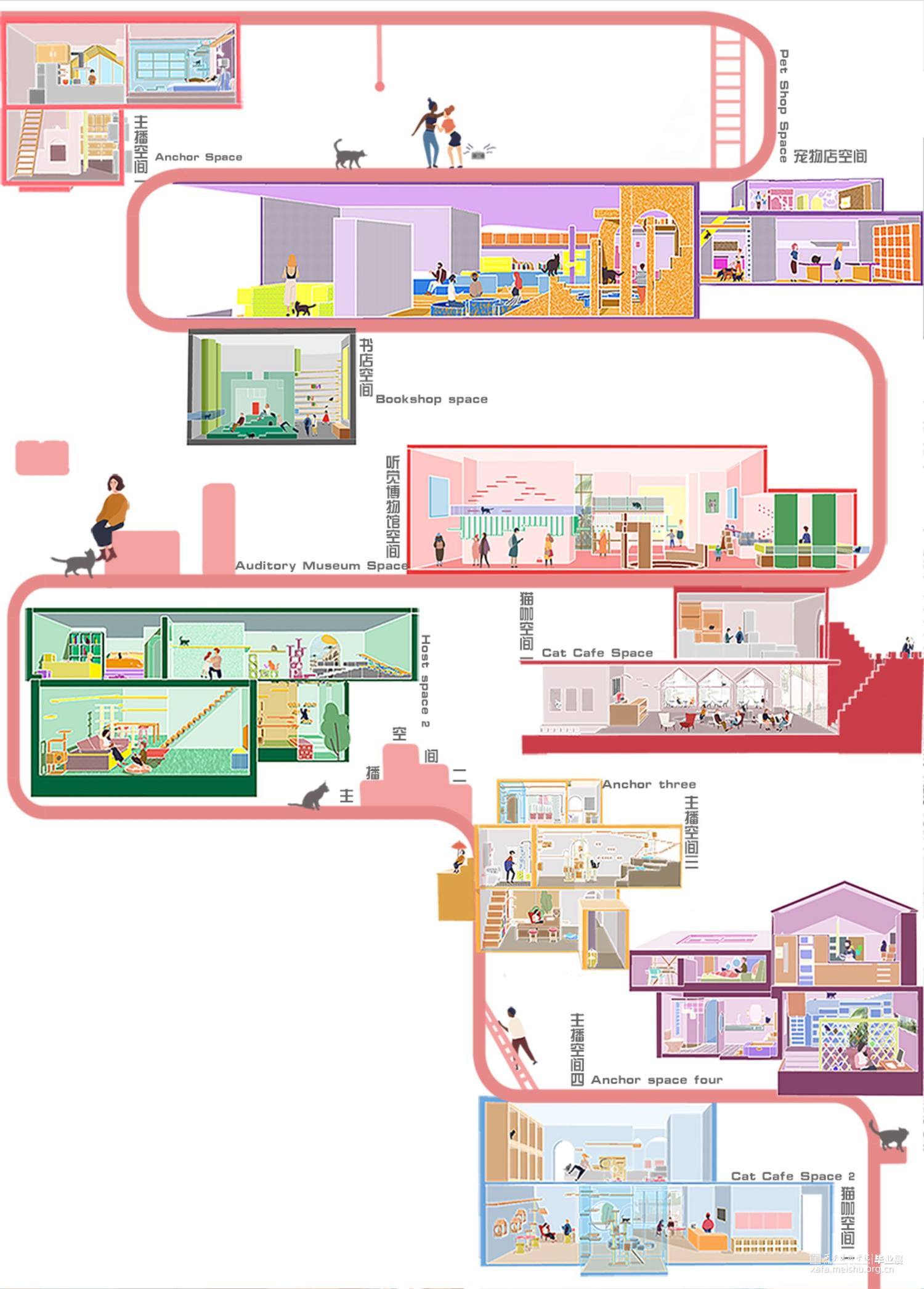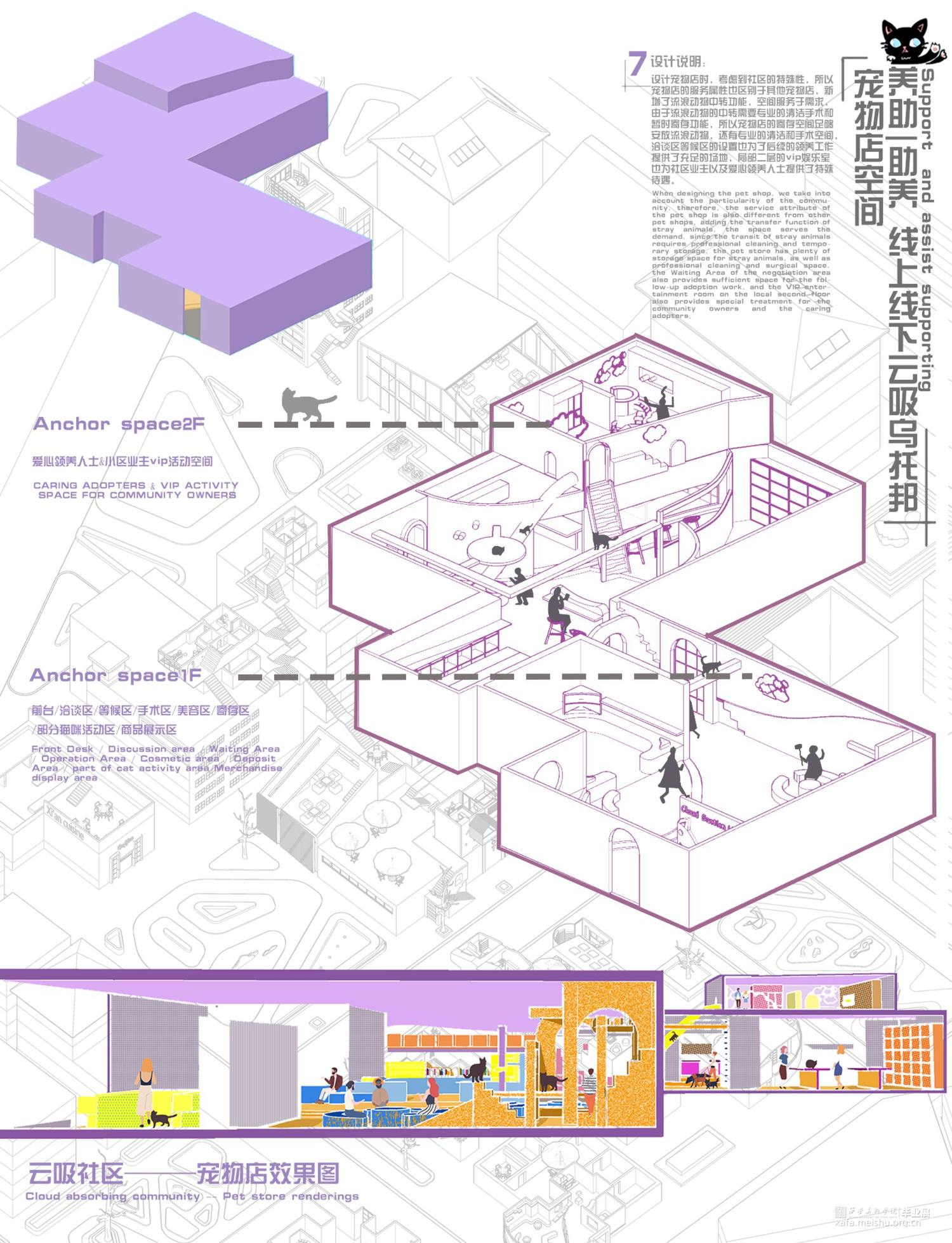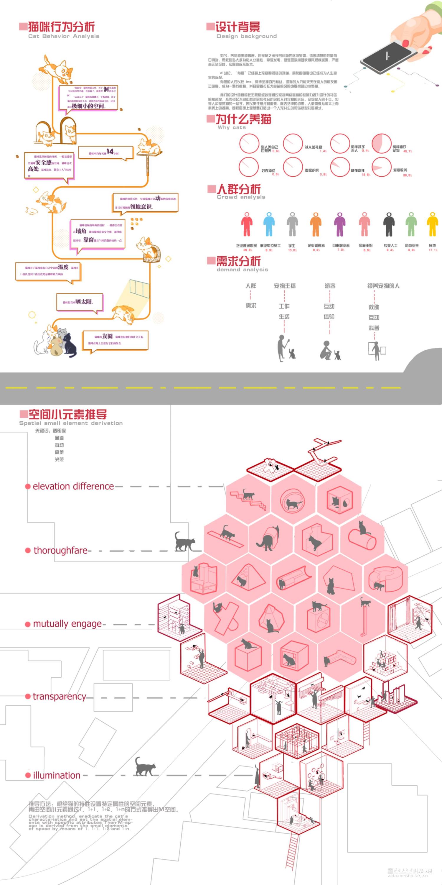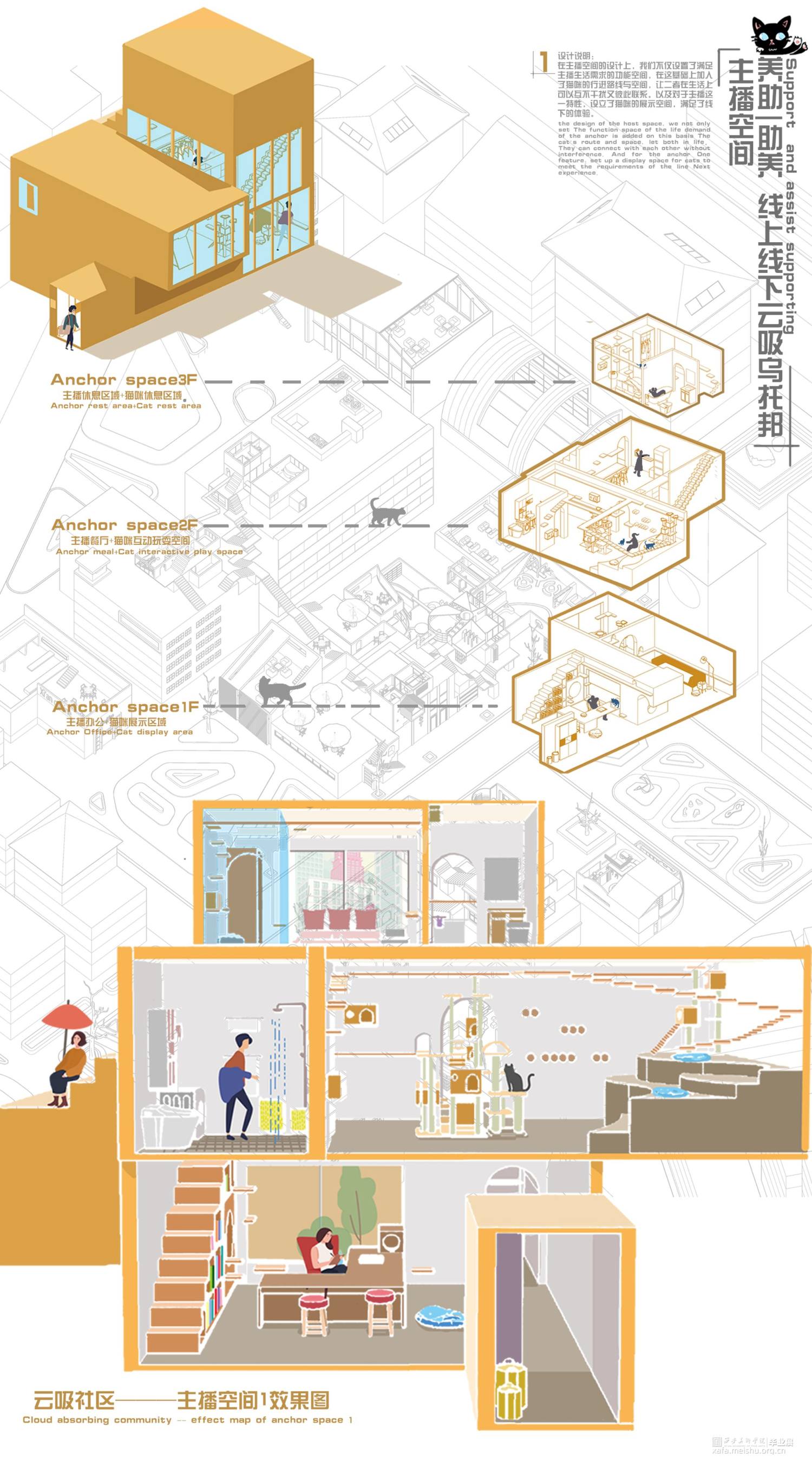 从网络线上“云吸”这一概念入手,思考人宠相处空间模式的再定义,通过镜头叙事语言来探索新型人宠关系中空间的组合模式。分析国内流浪动物的线下问题,通过设计来干预人们对宠物的弃养心理,通过线上线下的互动方式,构建人们对于宠物的共情与共存渴望,并且以宠物为纽带,促进人与人之间的近距离沟通方式。研究猫咪与人的共存行为模式,在总结猫咪空间特性的基础上,以其属性和性质为生发的的人猫共存空间,从而形成完整的社区综合空间,构架出一个人宠和谐的“云吸”社区形态,以达到乌托邦理想国的人宠共存居住形态。人宠共存空间设计的最终目