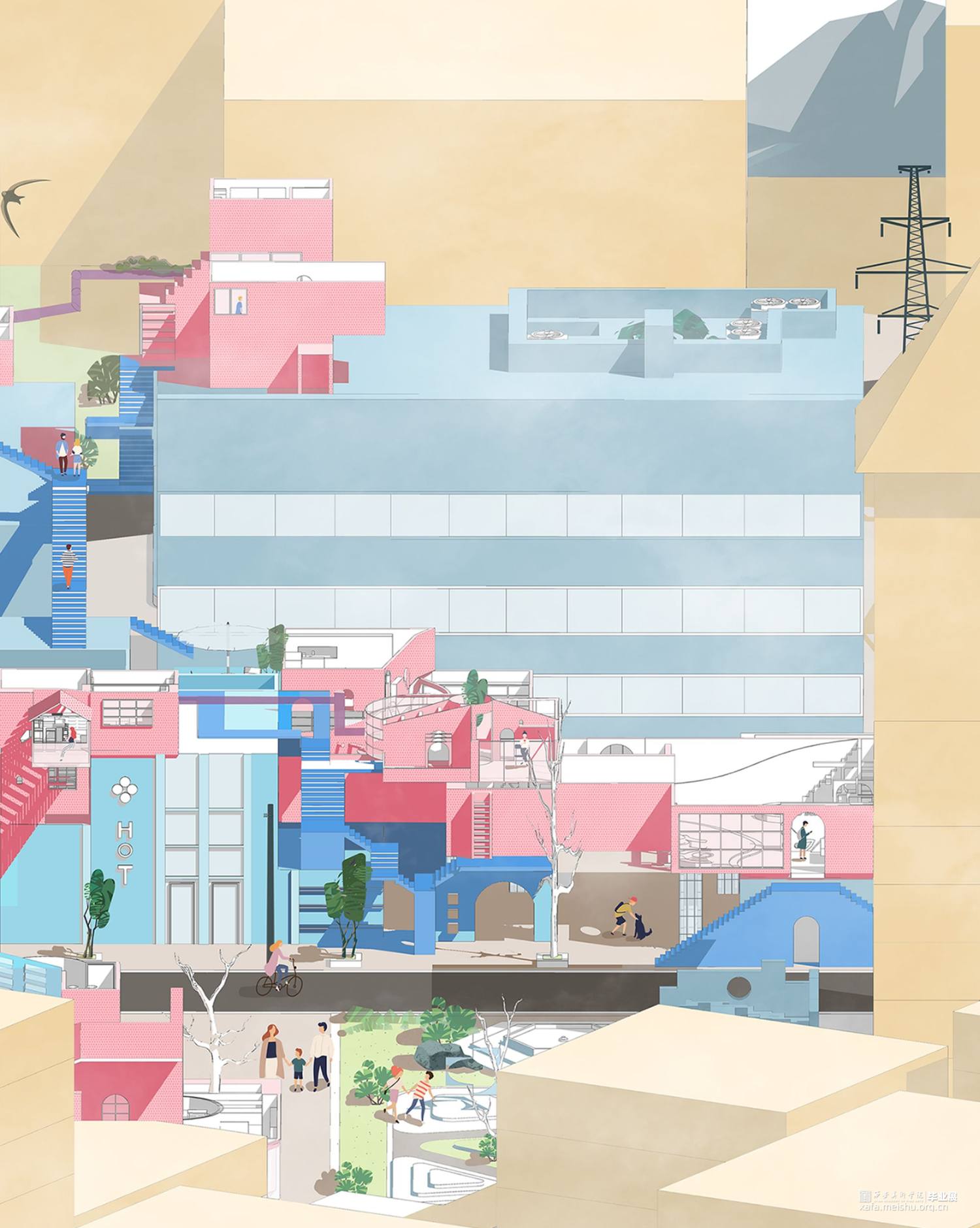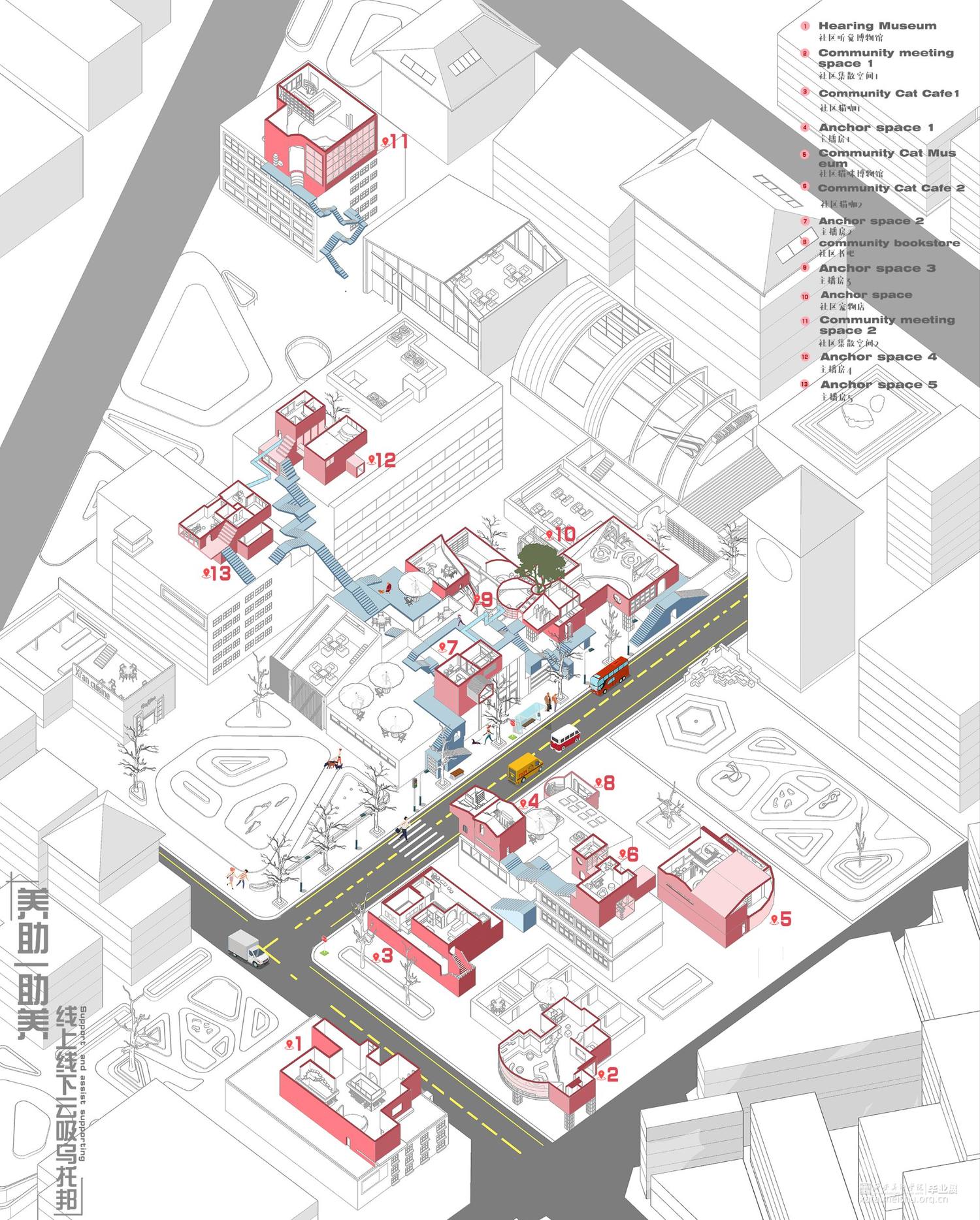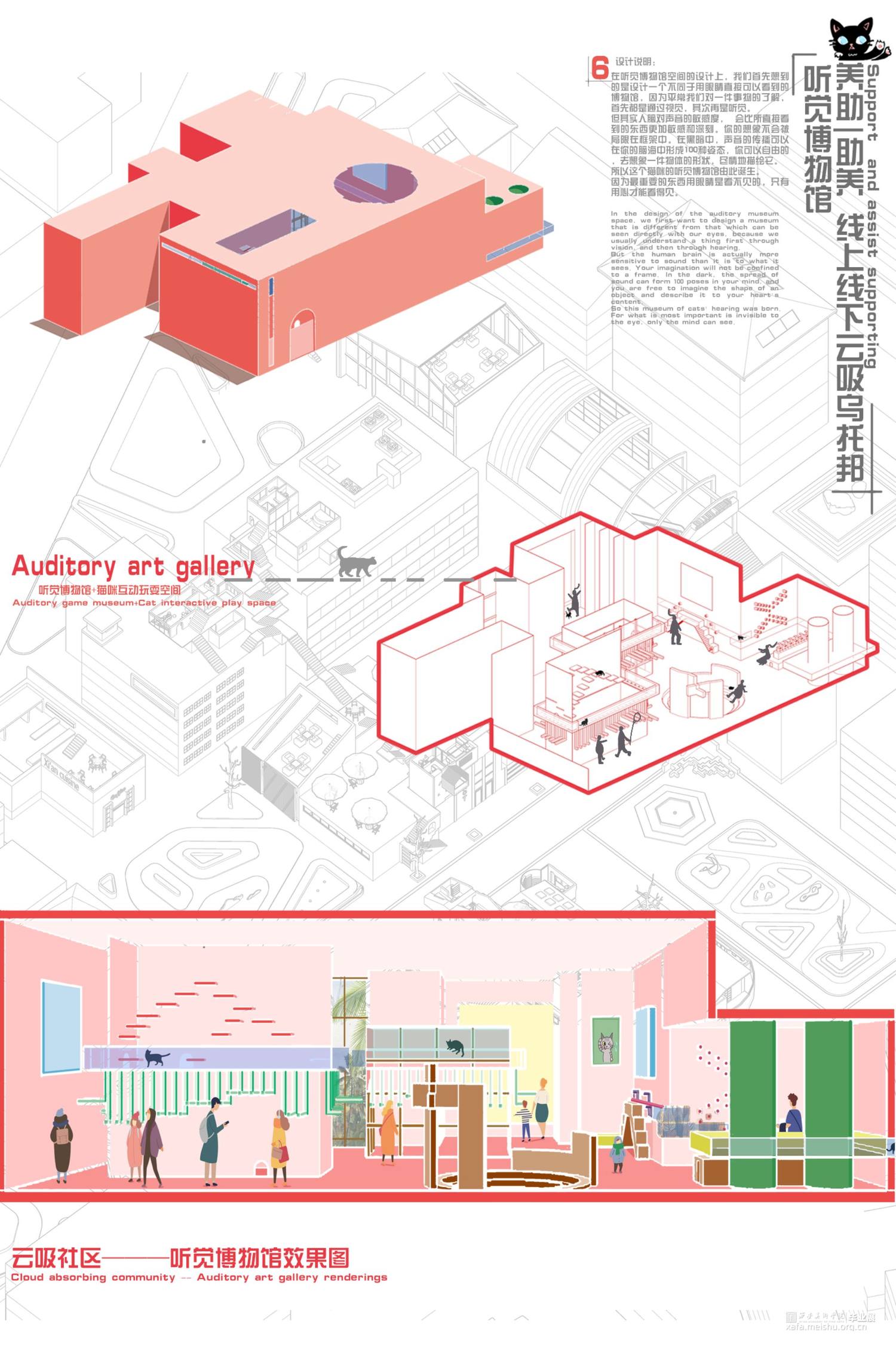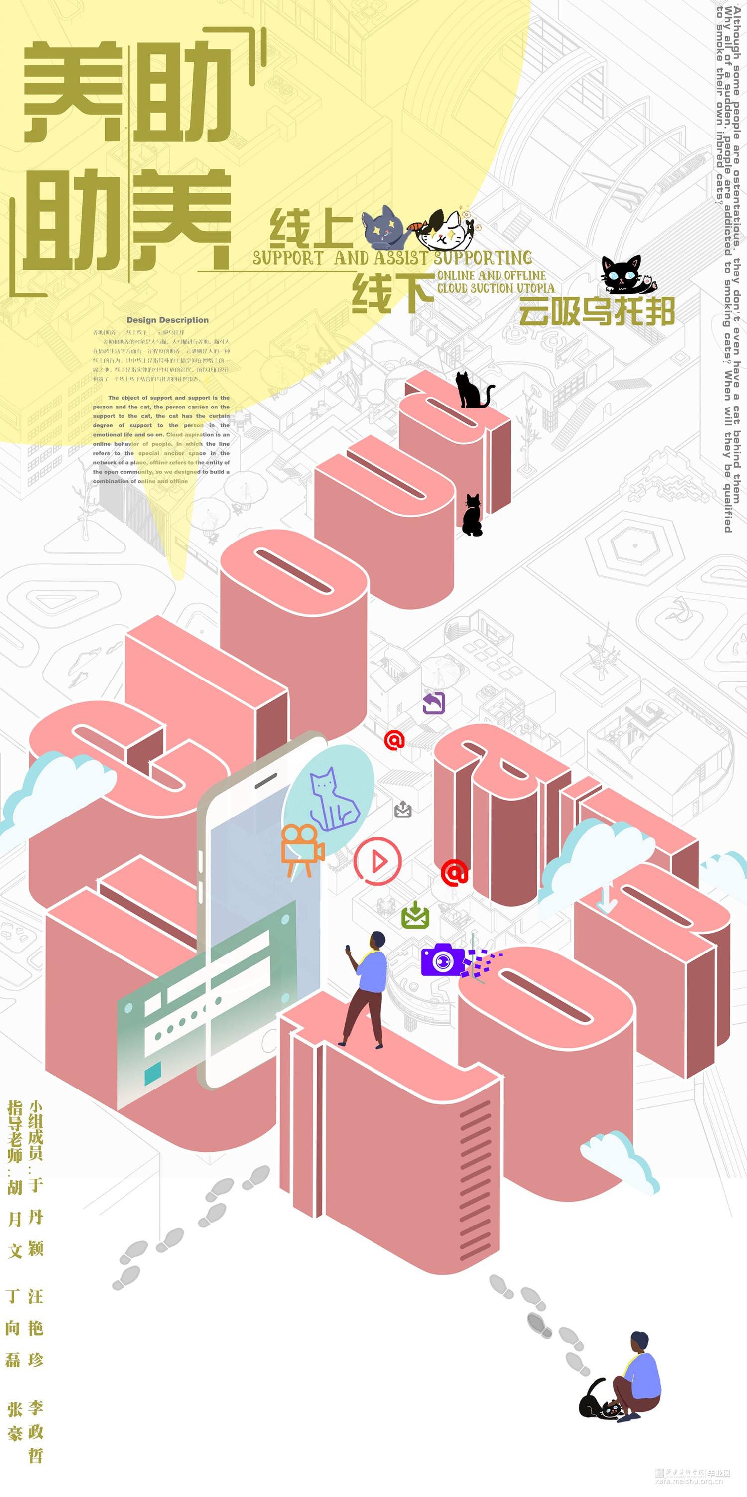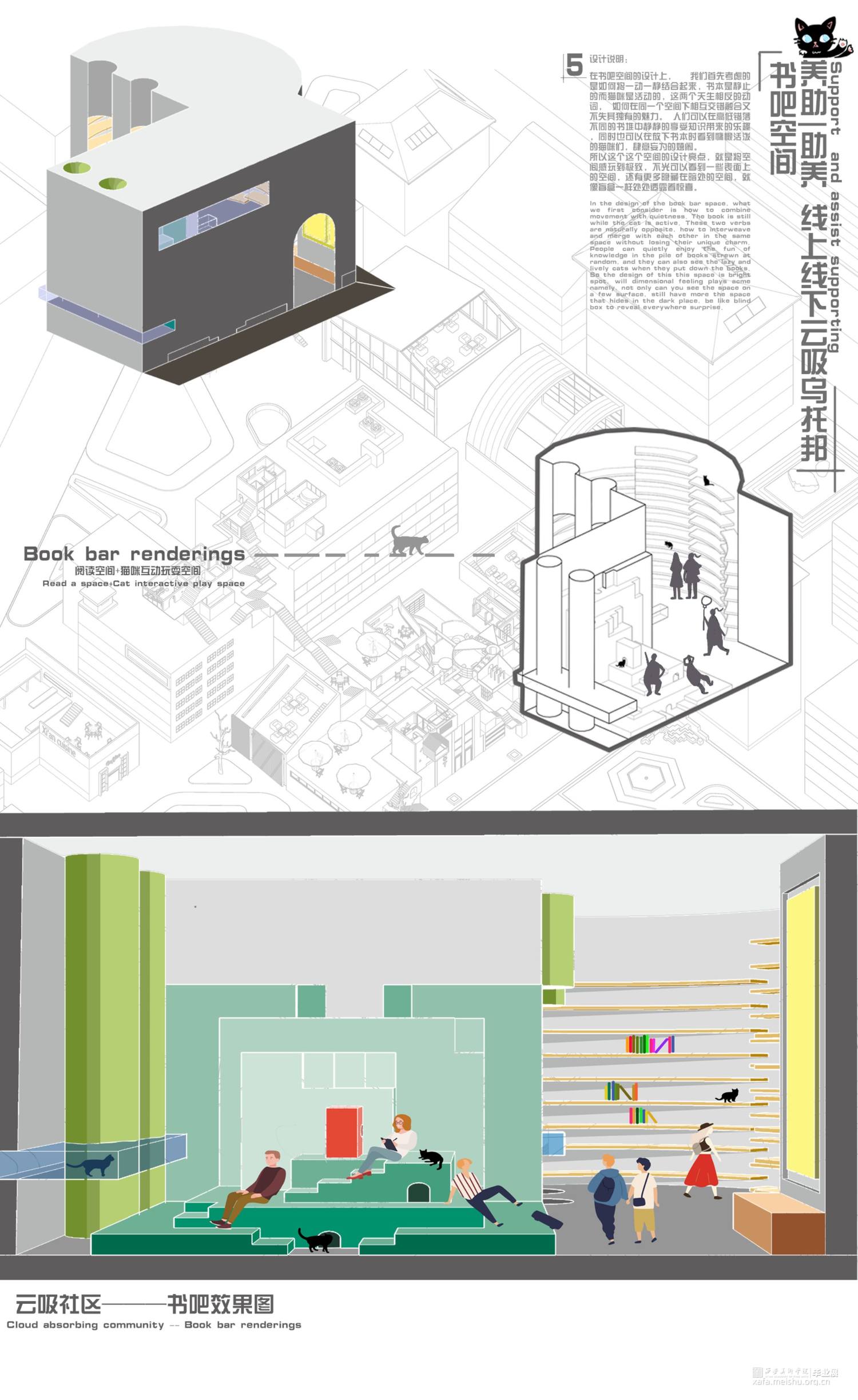 从网络线上“云吸”这一概念入手,思考人宠相处空间模式的再定义,通过镜头叙事语言来探索新型人宠关系中空间的组合模式。分析国内流浪动物的线下问题,通过设计来干预人们对宠物的弃养心理,通过线上线下的互动方式,构建人们对于宠物的共情与共存渴望,并且以宠物为纽带,促进人与人之间的近距离沟通方式。研究猫咪与人的共存行为模式,在总结猫咪空间特性的基础上,以其属性和性质为生发的的人猫共存空间,从而形成完整的社区综合空间,构架出一个人宠和谐的“云吸”社区形态,以达到乌托邦理想国的人宠共存居住形态。人宠共存空间设计的最终目