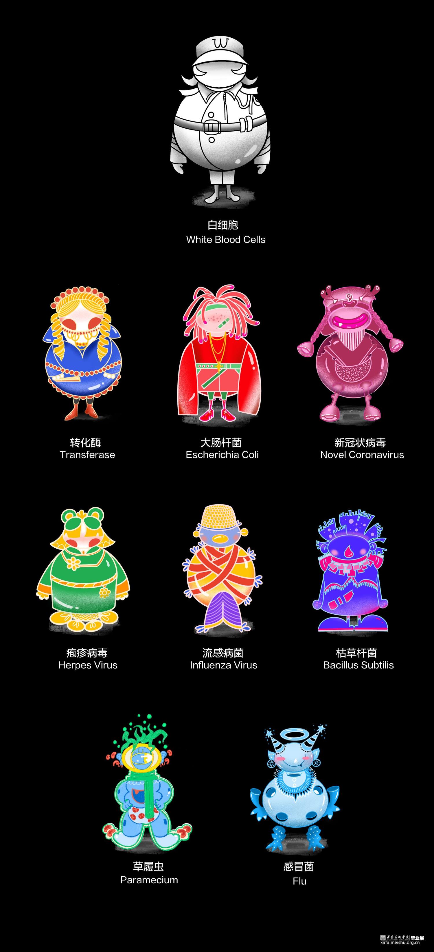 新冠疫情的来袭,影响了生活各个方面,可以感受到了细菌对人类社会的巨大影响,希望能够通过此次毕业创作,不仅仅是对人们的一次微生物知识普及,更重要的是能够警示和提醒人们对于微生物的重视。