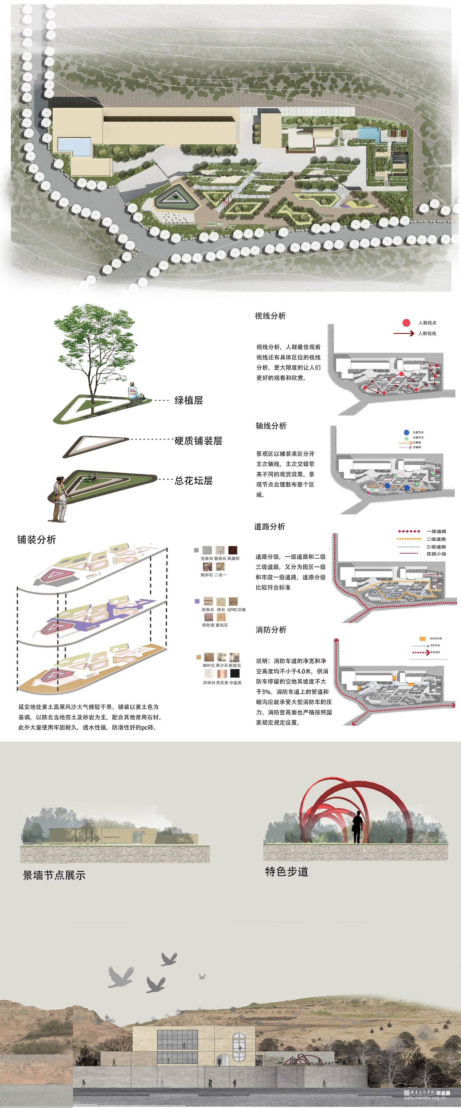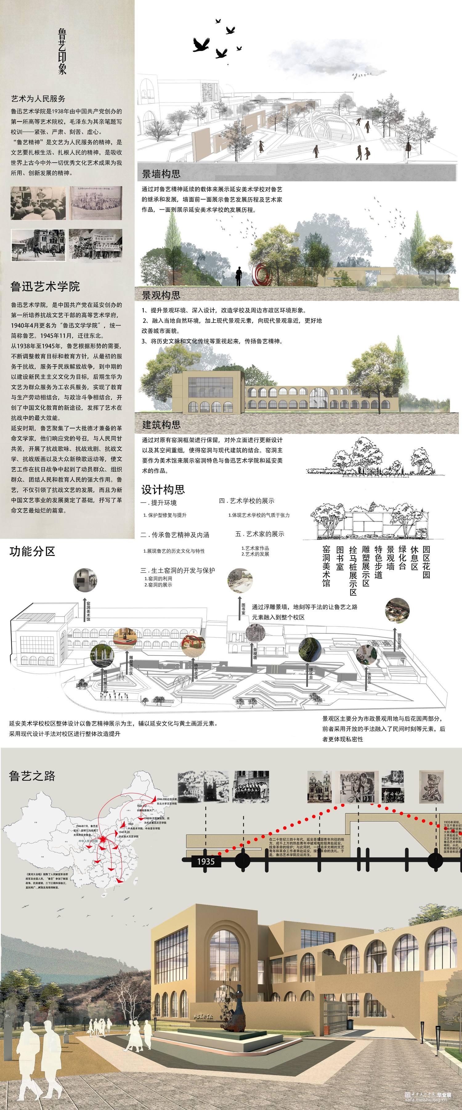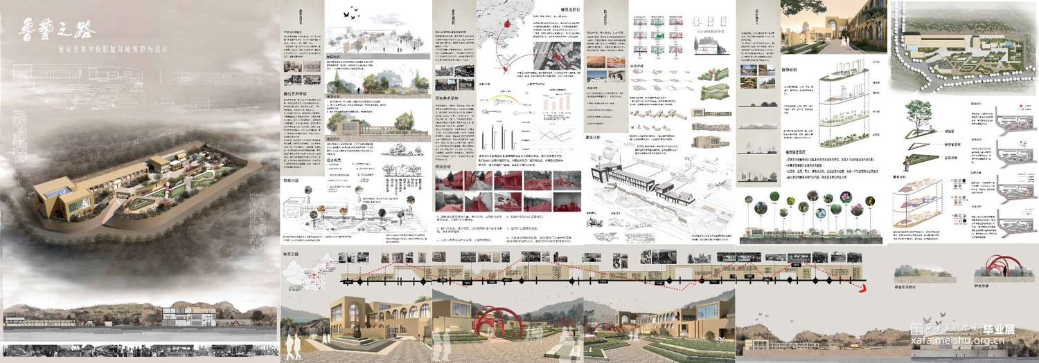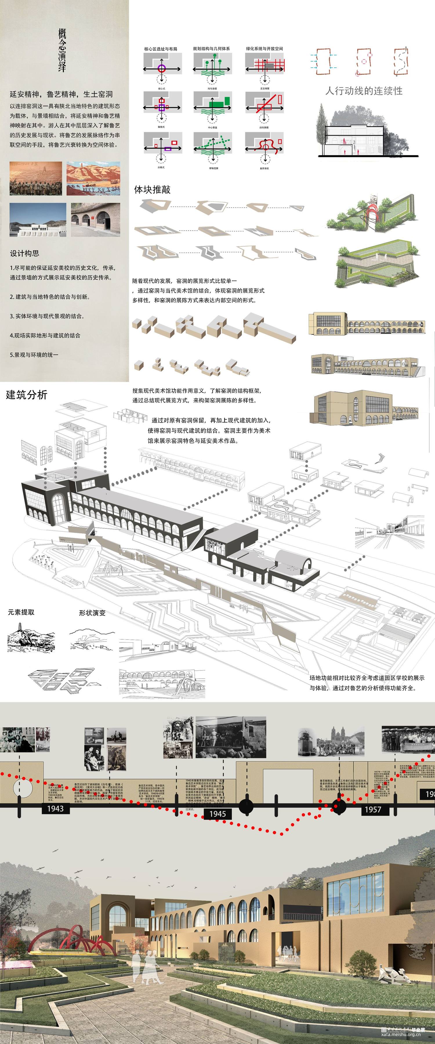 设计说明:设计目标是“保护型修复和提升”,将旧校址规划成学校遗址型环境,规划有博物馆,创作室,会客室及室外景观区等区域,属于文化型景观范畴。深度挖掘延安美校从建校到目前的发展经历,从传承鲁艺精神的内涵出发,拔高文化高度。既有文化型景观手法又有遗址性的文脉传承。集中体现在其功能与形式上,功能满足当下美术创作展览,收藏等属性的活动,精神上有艺术学校的气质与张力。