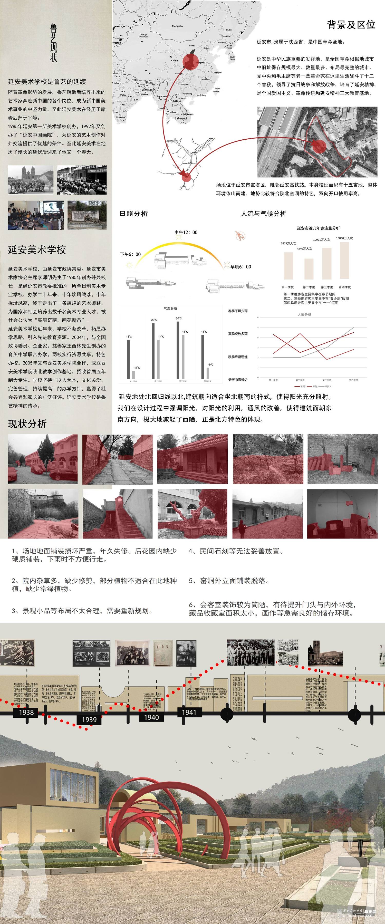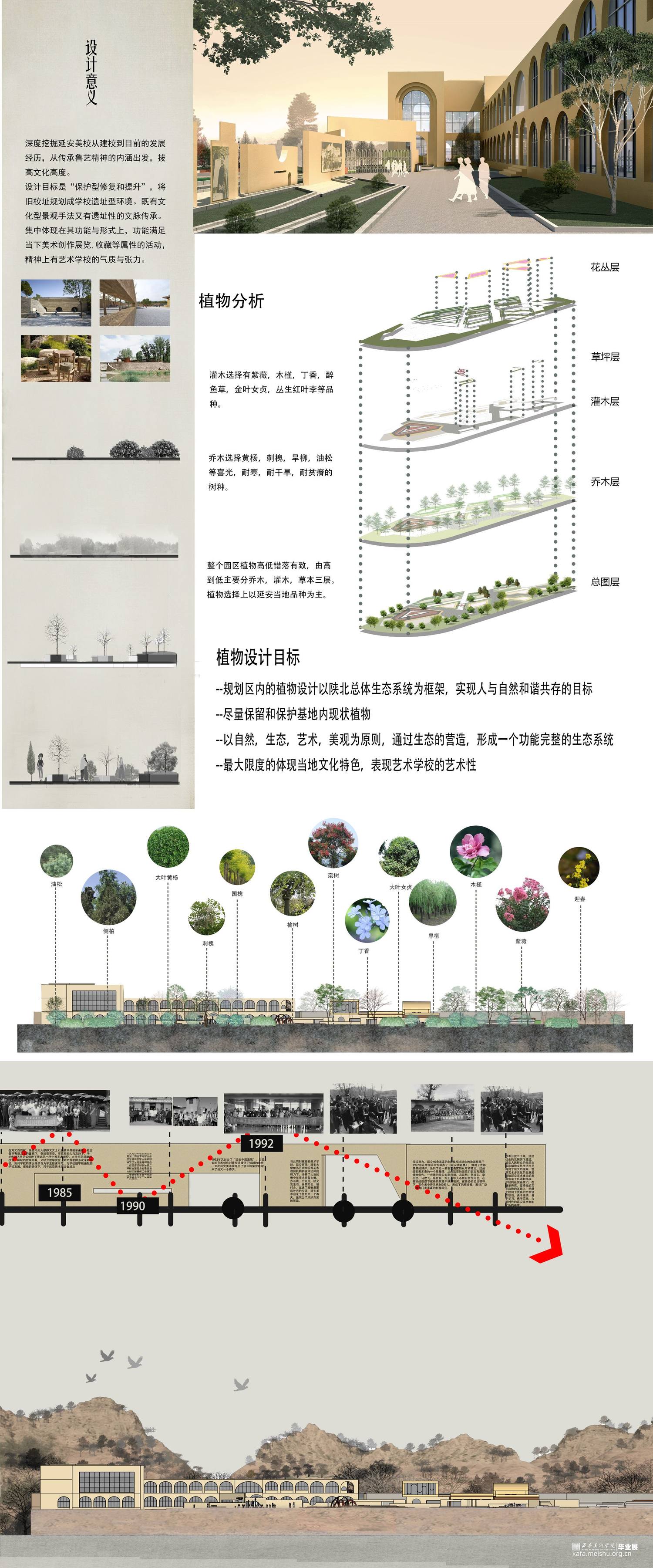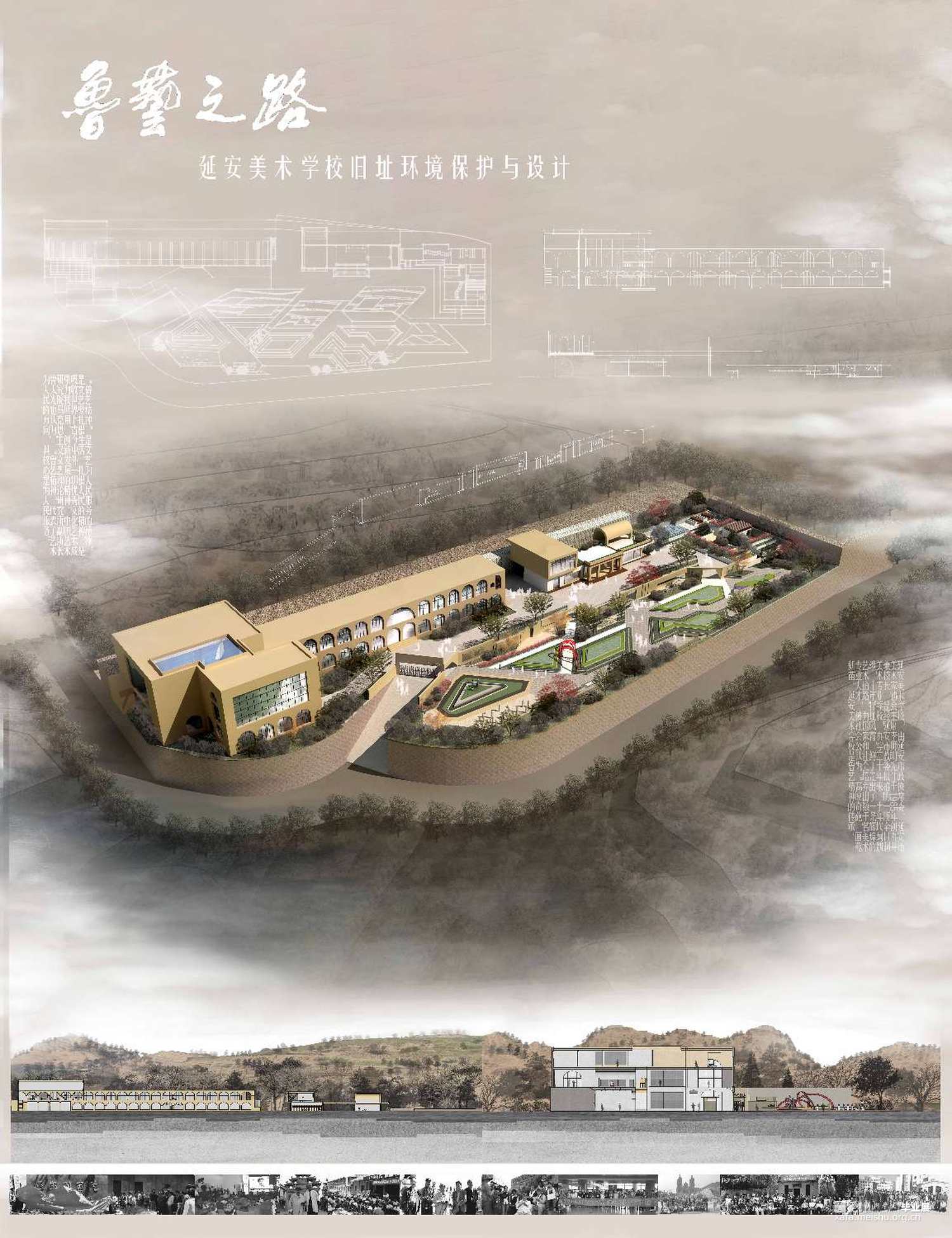 设计说明:设计目标是“保护型修复和提升”,将旧校址规划成学校遗址型环境,规划有博物馆,创作室,会客室及室外景观区等区域,属于文化型景观范畴。深度挖掘延安美校从建校到目前的发展经历,从传承鲁艺精神的内涵出发,拔高文化高度。既有文化型景观手法又有遗址性的文脉传承。集中体现在其功能与形式上,功能满足当下美术创作展览,收藏等属性的活动,精神上有艺术学校的气质与张力。