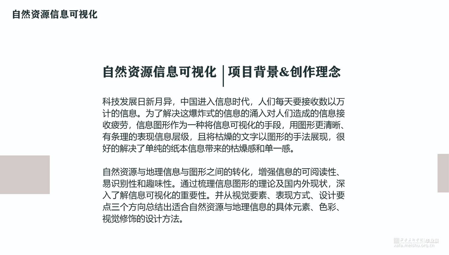 自然资源与地理信息与图形之间的转化,增强信息的可阅读性、易识别性和趣味性。通过梳理信息图形的理论及国内外现状,深入了解信息可视化的重要性。并从视觉要素、表现方式、设计要点三个方向,做出适合自然资源与地理信息的具体元素、色彩、视觉修饰的