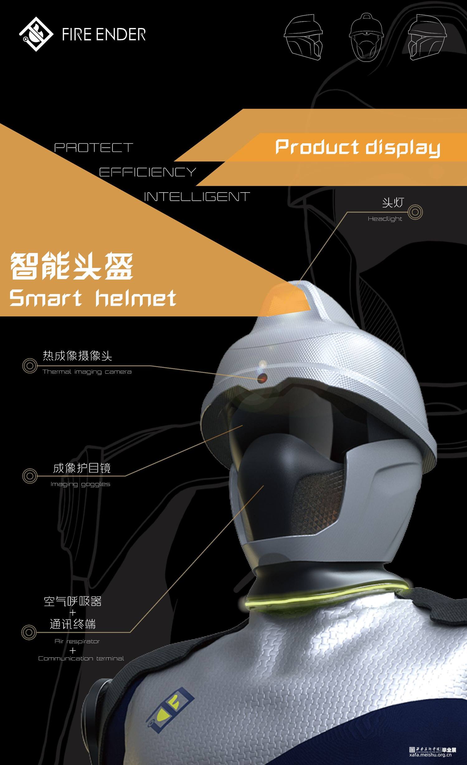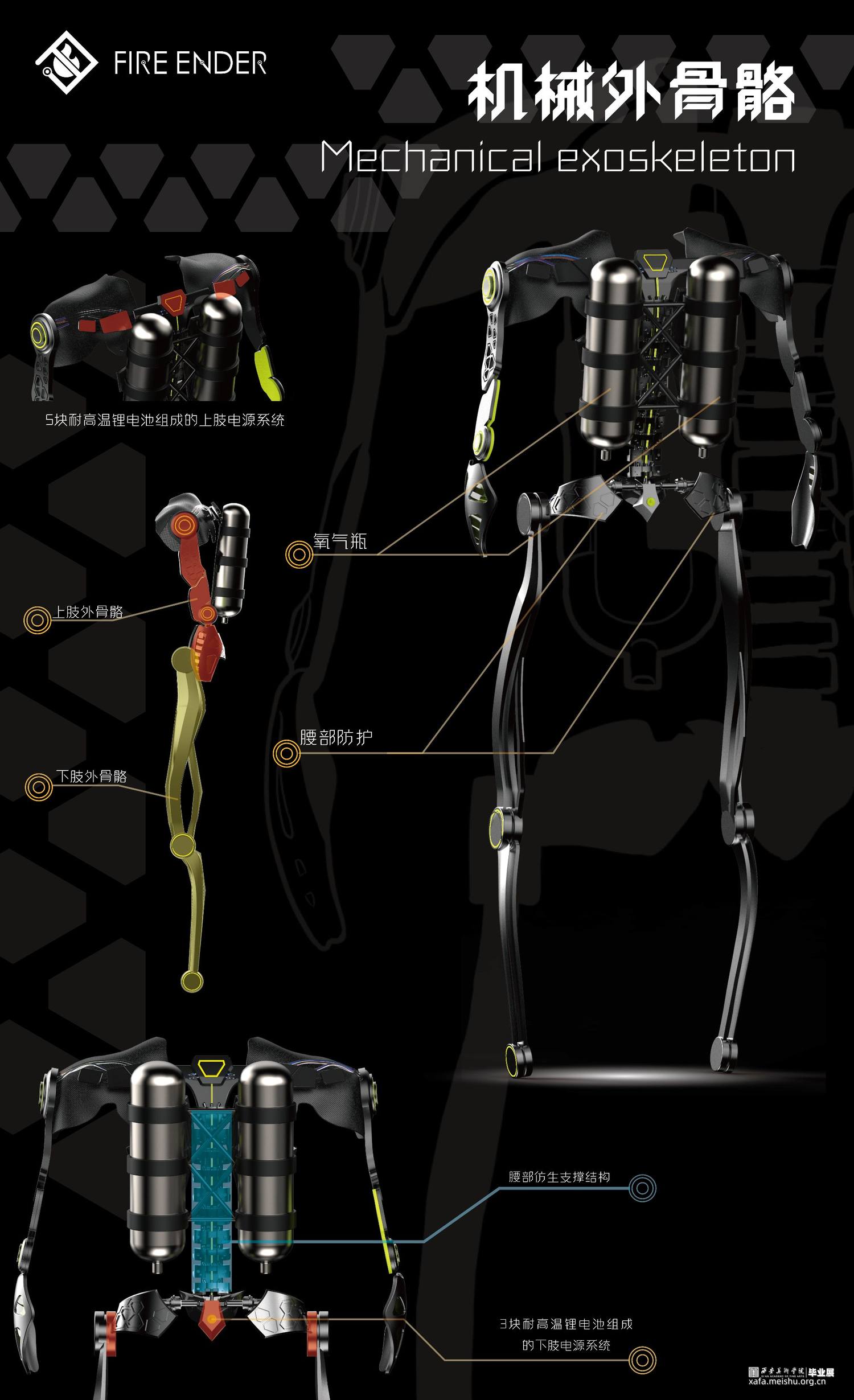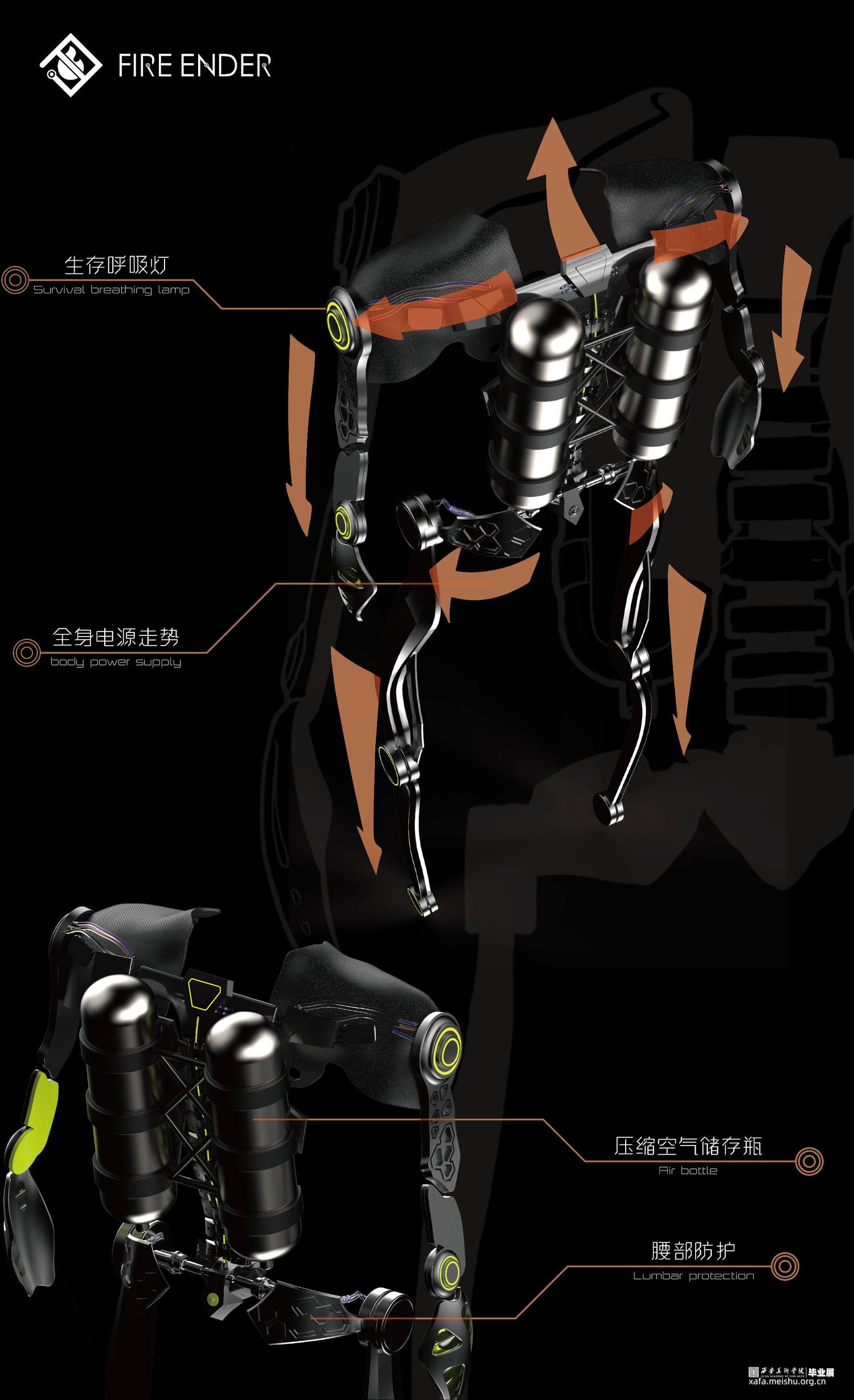 我们作为青年设计师,我们选择从消防装备的改进这个角度来解决目前的问题。因此,我们设计了概念化未来可实现趋势的智能消防可穿戴装备,这个装备主要分为三个部分:智能头盔,机械外骨骼和消防战衣。
