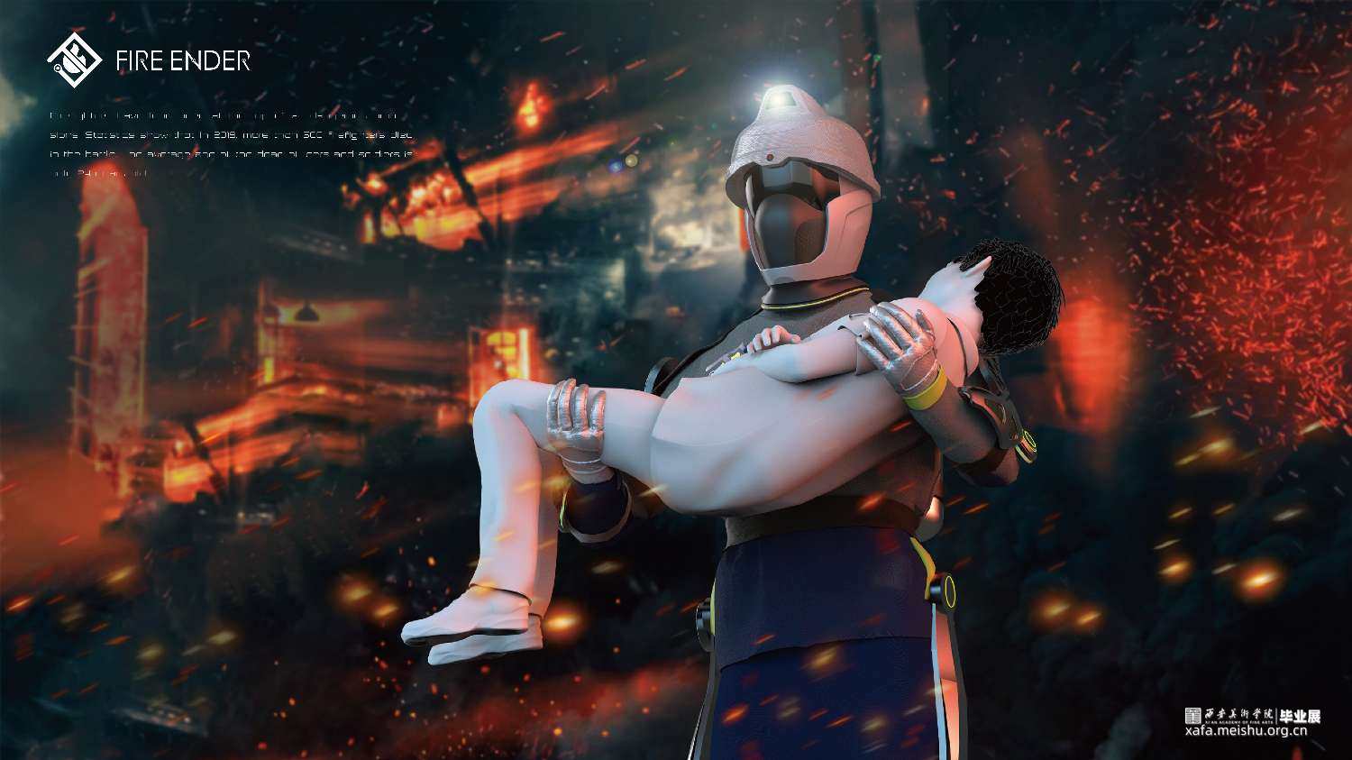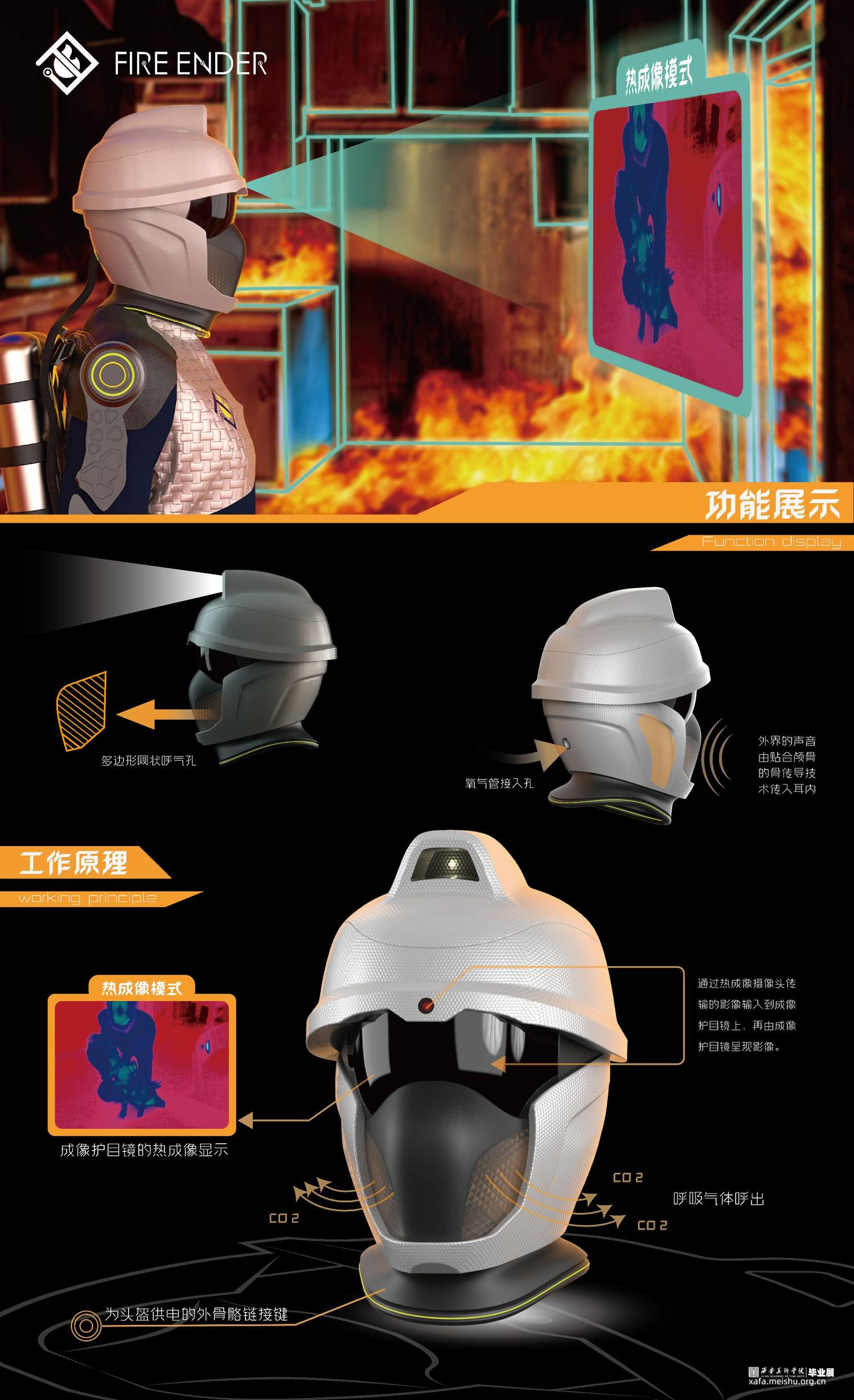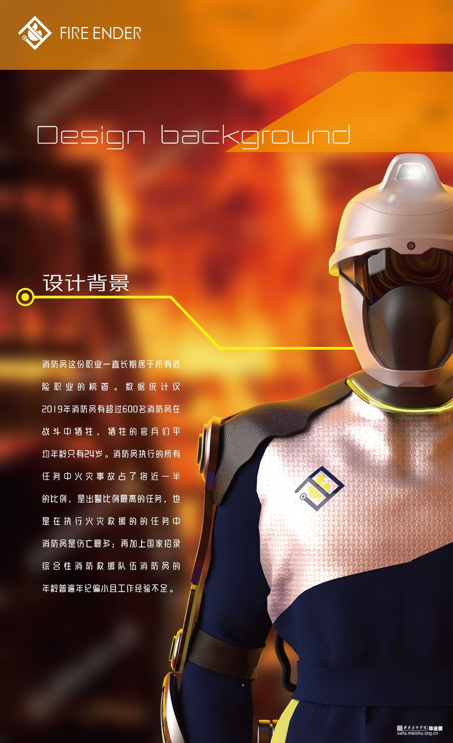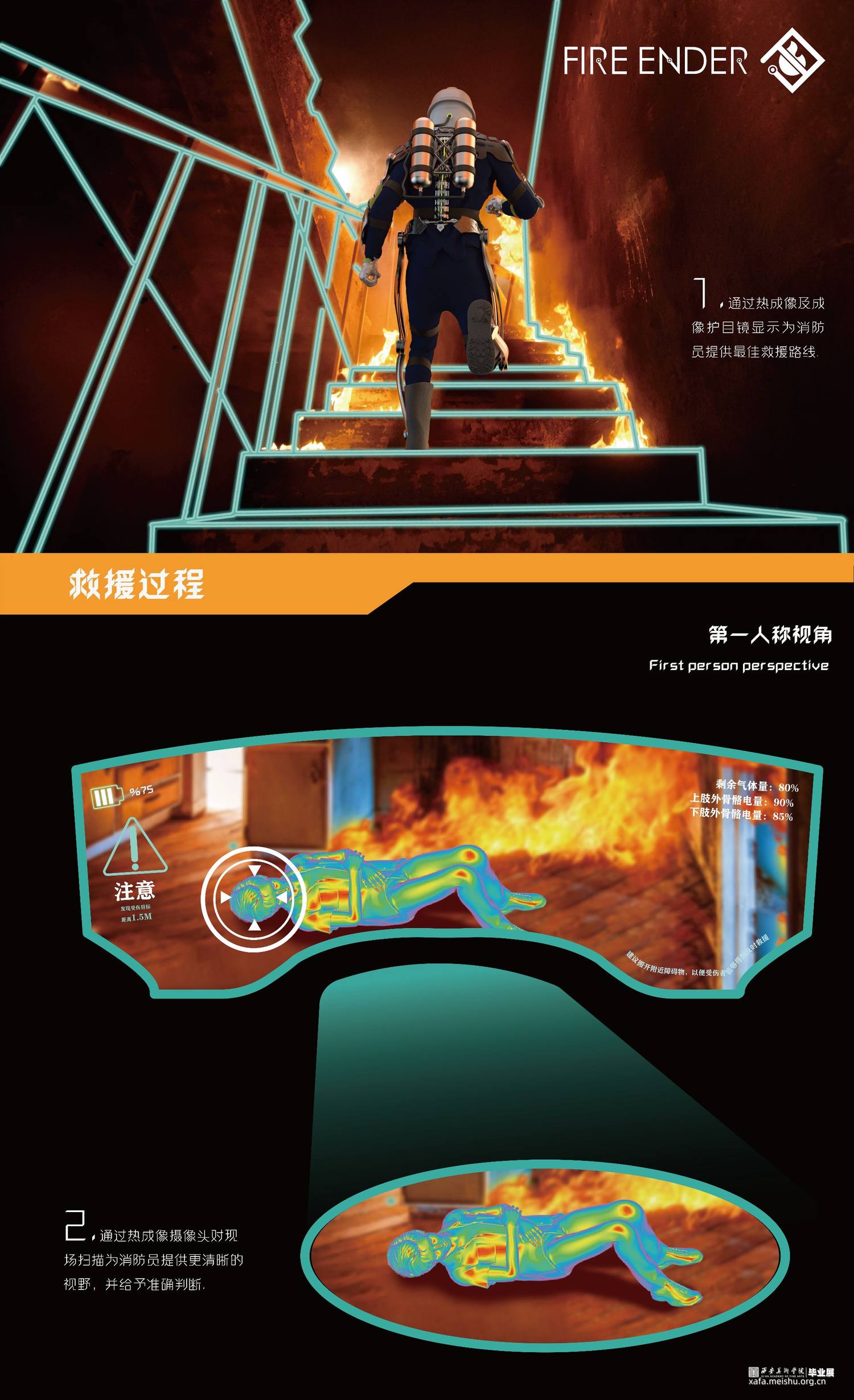 我们作为青年设计师,我们选择从消防装备的改进这个角度来解决目前的问题。因此,我们设计了概念化未来可实现趋势的智能消防可穿戴装备,这个装备主要分为三个部分:智能头盔,机械外骨骼和消防战衣。