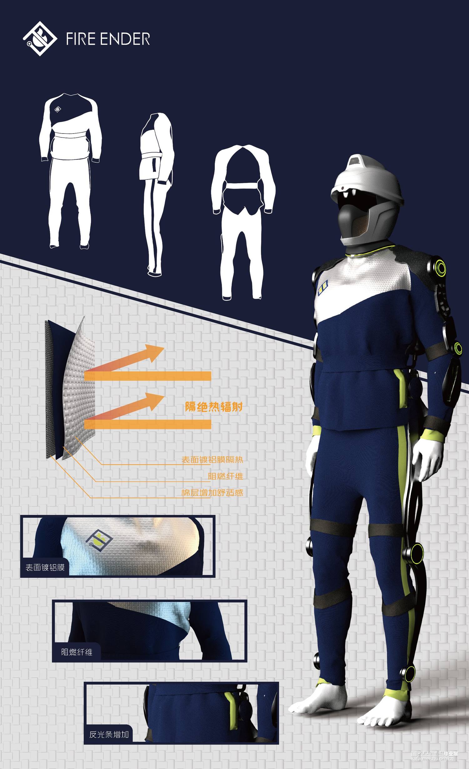 2.通过镀铝膜,阻燃纤维和棉层这三层的设计,能够有效地防护隔开热辐射,避免消防战士作战时受到伤害