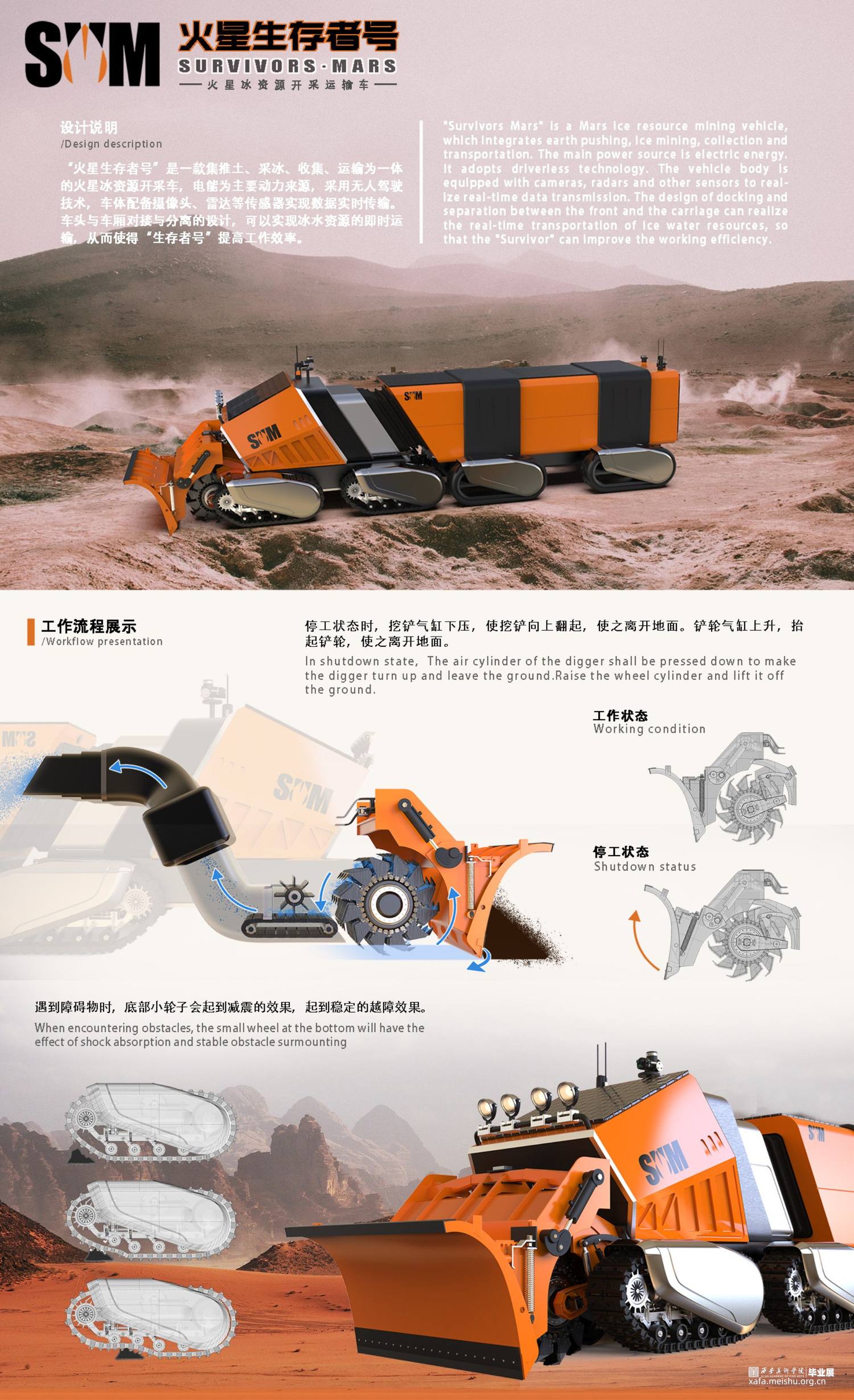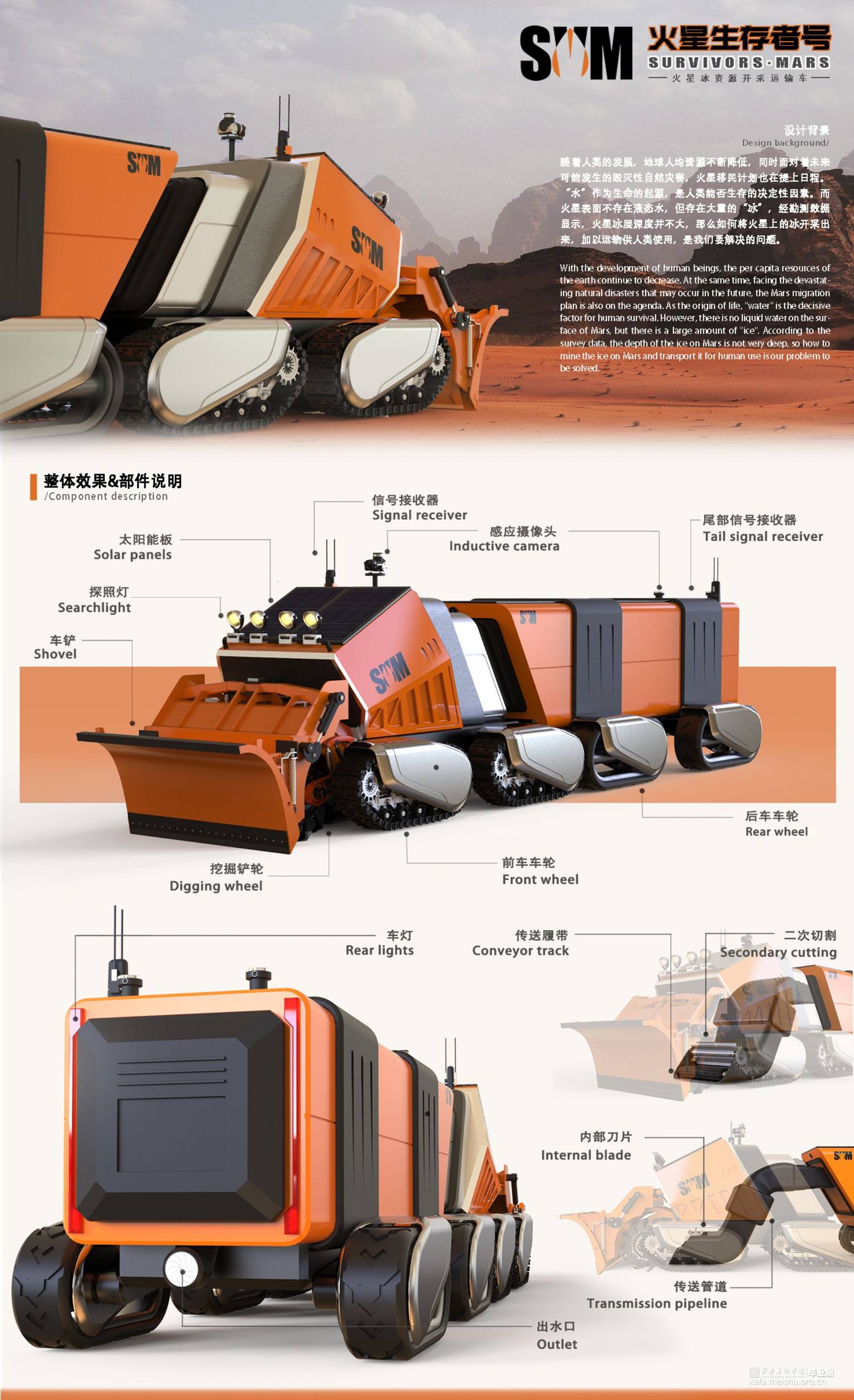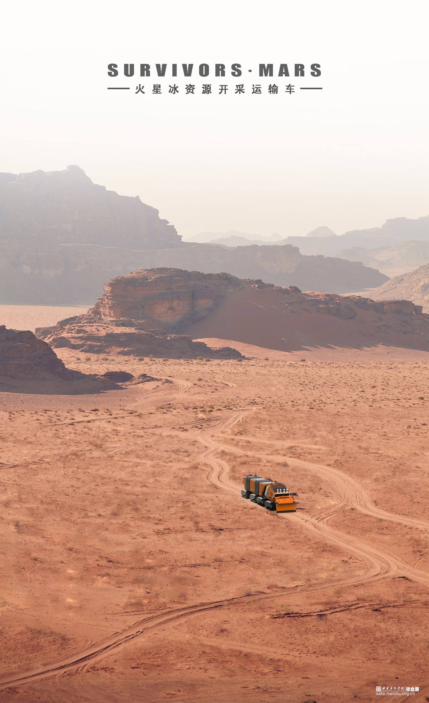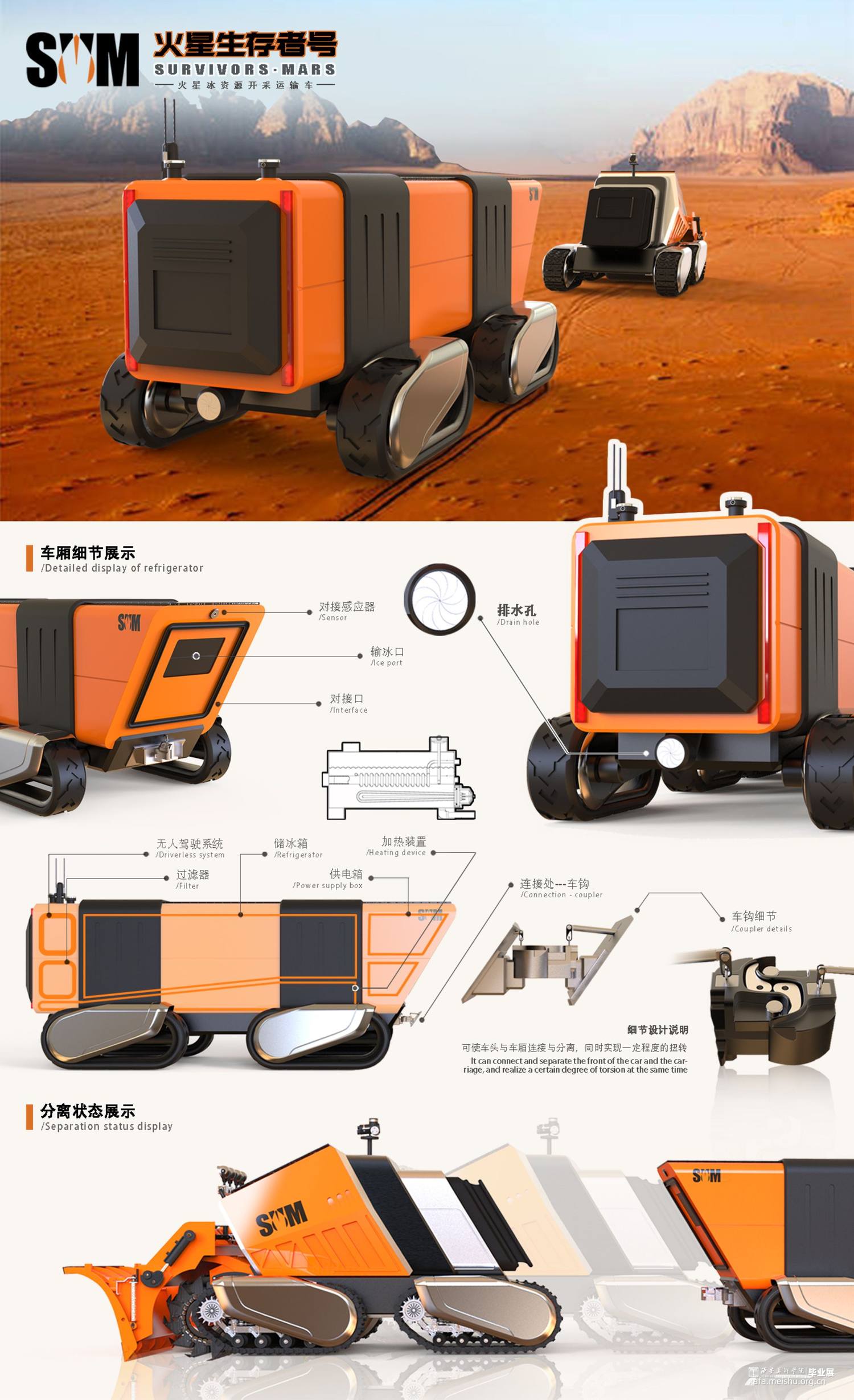 随着人类的发展,地球人均资源不断降低,同时面对着未来可能发生的毁灭性自然灾害,火星移民计划也在提上日程。“水”作为生命的起源,是人类能否生存的决定性因素。而火星表面不存在液态水,但存在大量的“冰”,经勘测数据显示,火星冰层深度并不大,那么如何将火星上的冰开采出来,加以运输供人类使用,是我们要解决的问题。“火星生存者号”是一款集推土、采冰、收集、运输为一体的火星冰资源开采车,电能为主要动力来源,采用无人驾驶技术,车体配备摄像头、雷达等传感器实现数据实时传输。车头与车厢对接与分离的设计,可以实现冰水资源的即时