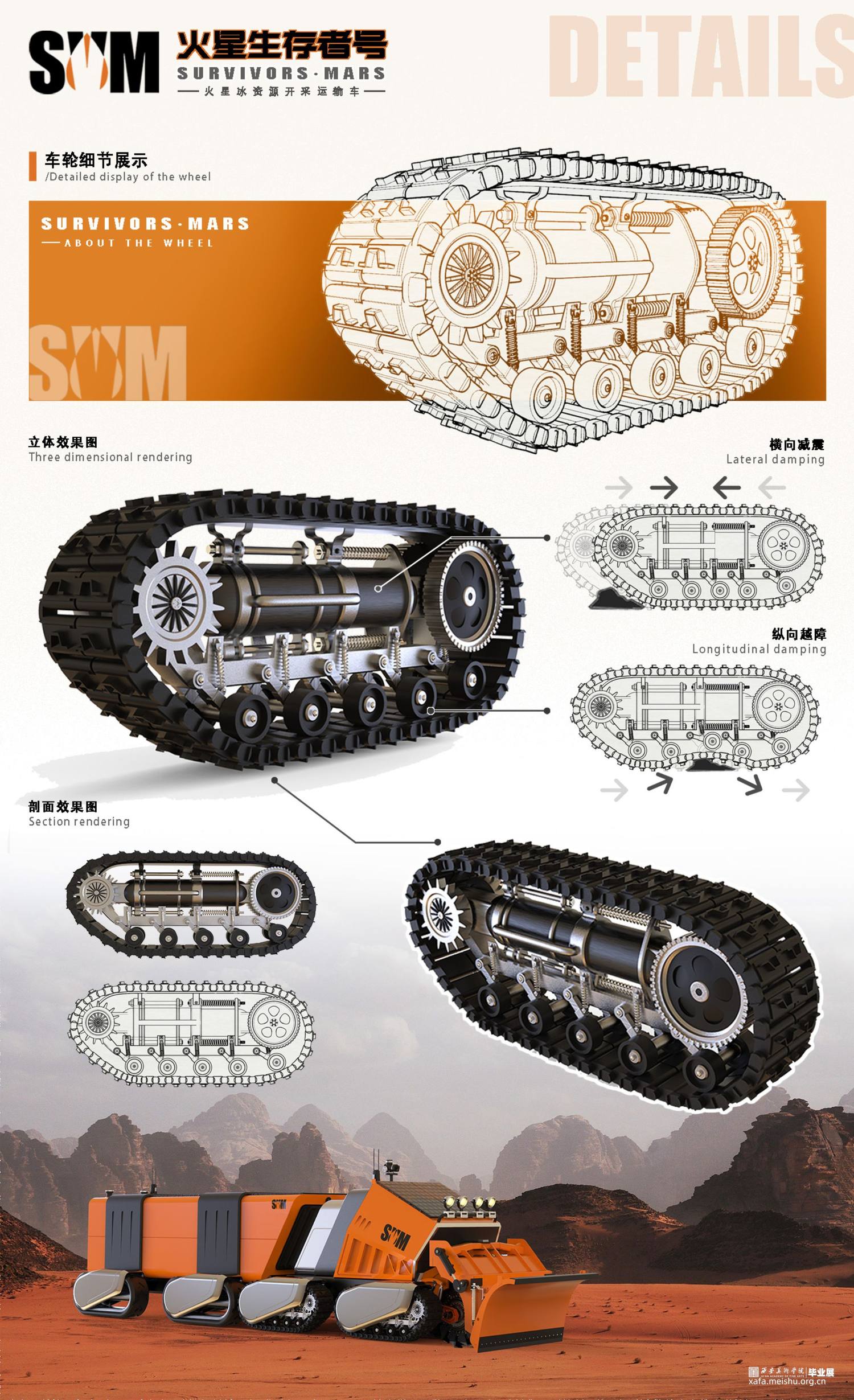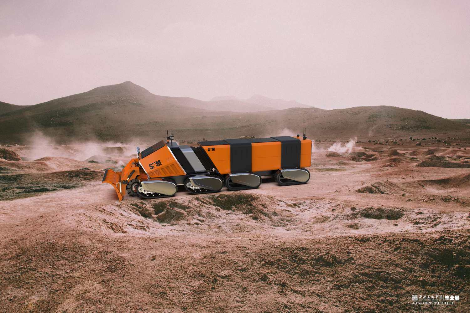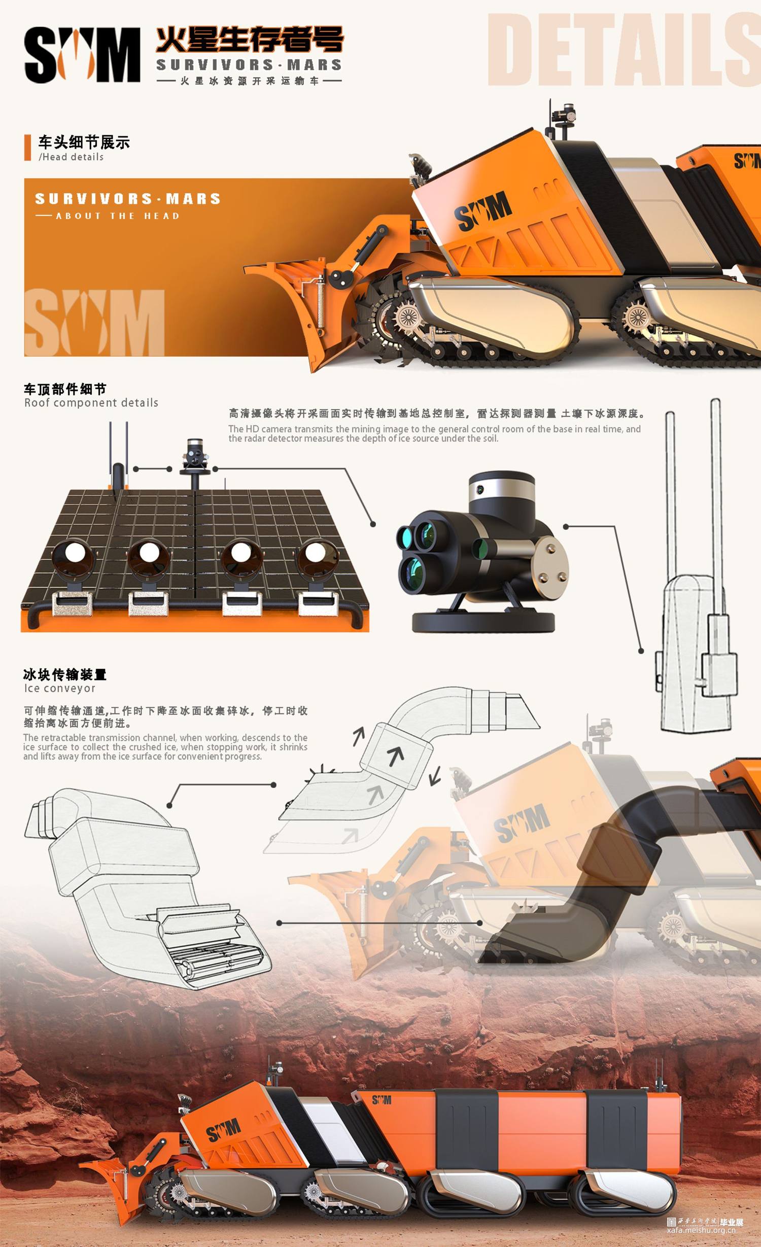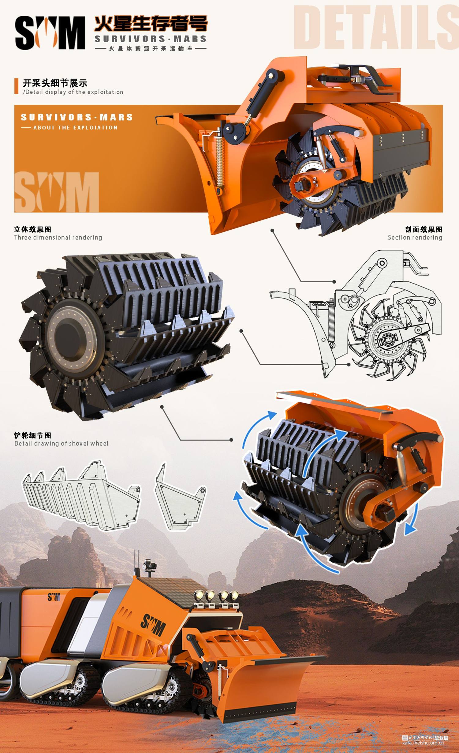 随着人类的发展,地球人均资源不断降低,同时面对着未来可能发生的毁灭性自然灾害,火星移民计划也在提上日程。“水”作为生命的起源,是人类能否生存的决定性因素。而火星表面不存在液态水,但存在大量的“冰”,经勘测数据显示,火星冰层深度并不大,那么如何将火星上的冰开采出来,加以运输供人类使用,是我们要解决的问题。“火星生存者号”是一款集推土、采冰、收集、运输为一体的火星冰资源开采车,电能为主要动力来源,采用无人驾驶技术,车体配备摄像头、雷达等传感器实现数据实时传输。车头与车厢对接与分离的设计,可以实现冰水资源的即时