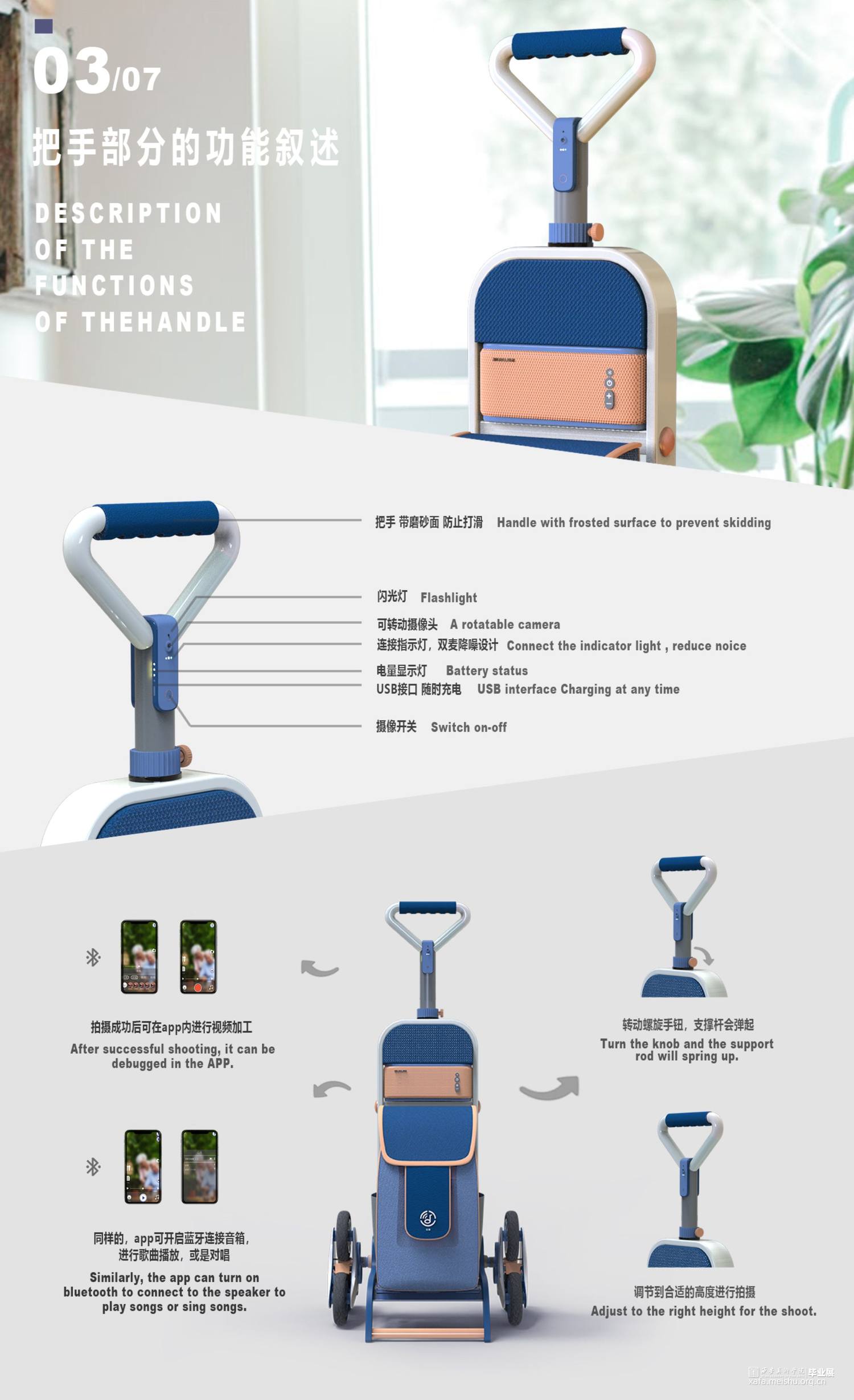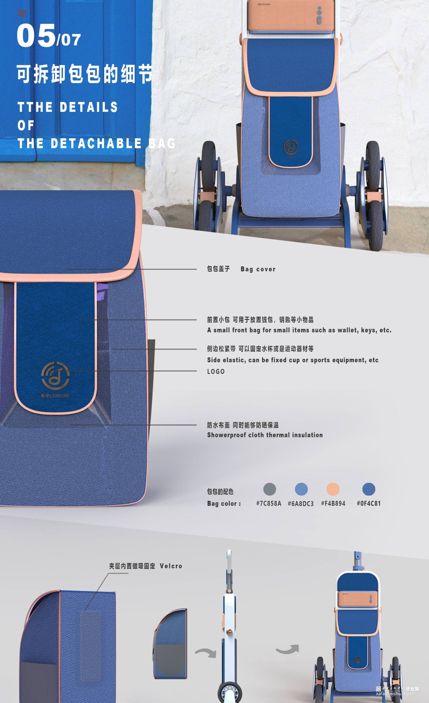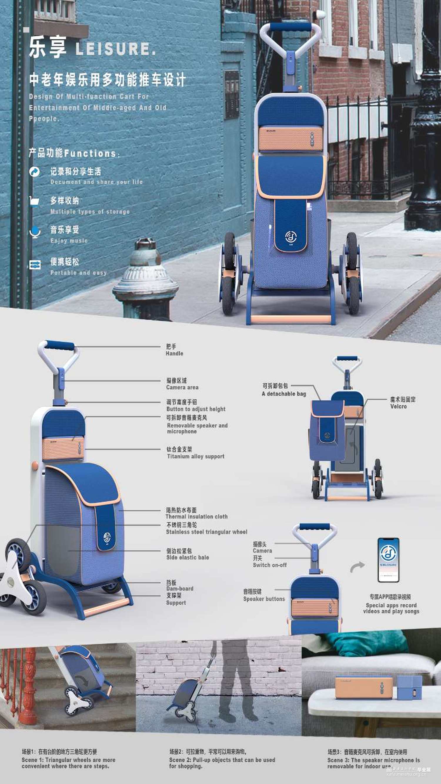 实体产品“乐享LEISURE娱乐多用途手推车”整车分为把手摄像组、可拆卸音响麦克风组、出行包组、车身支架几部分构成