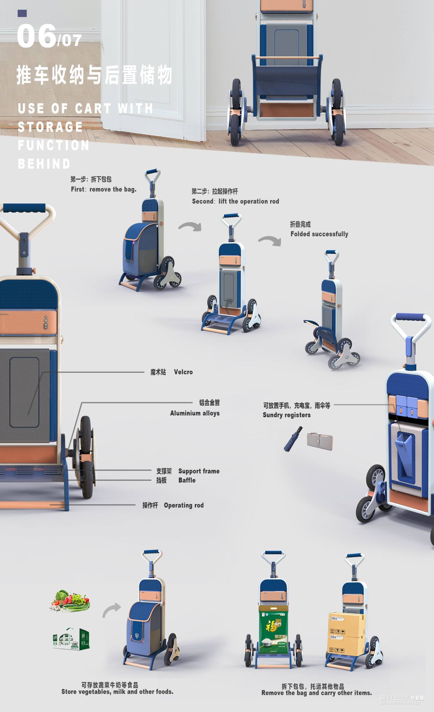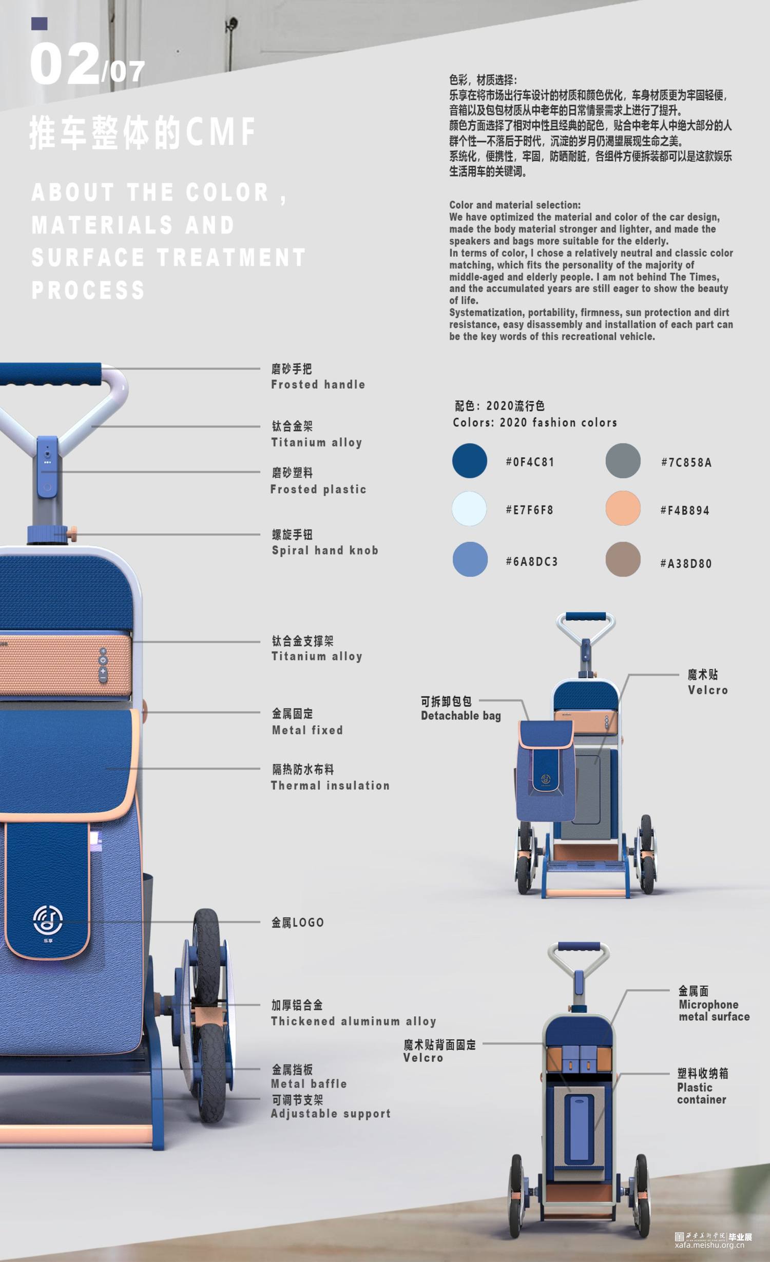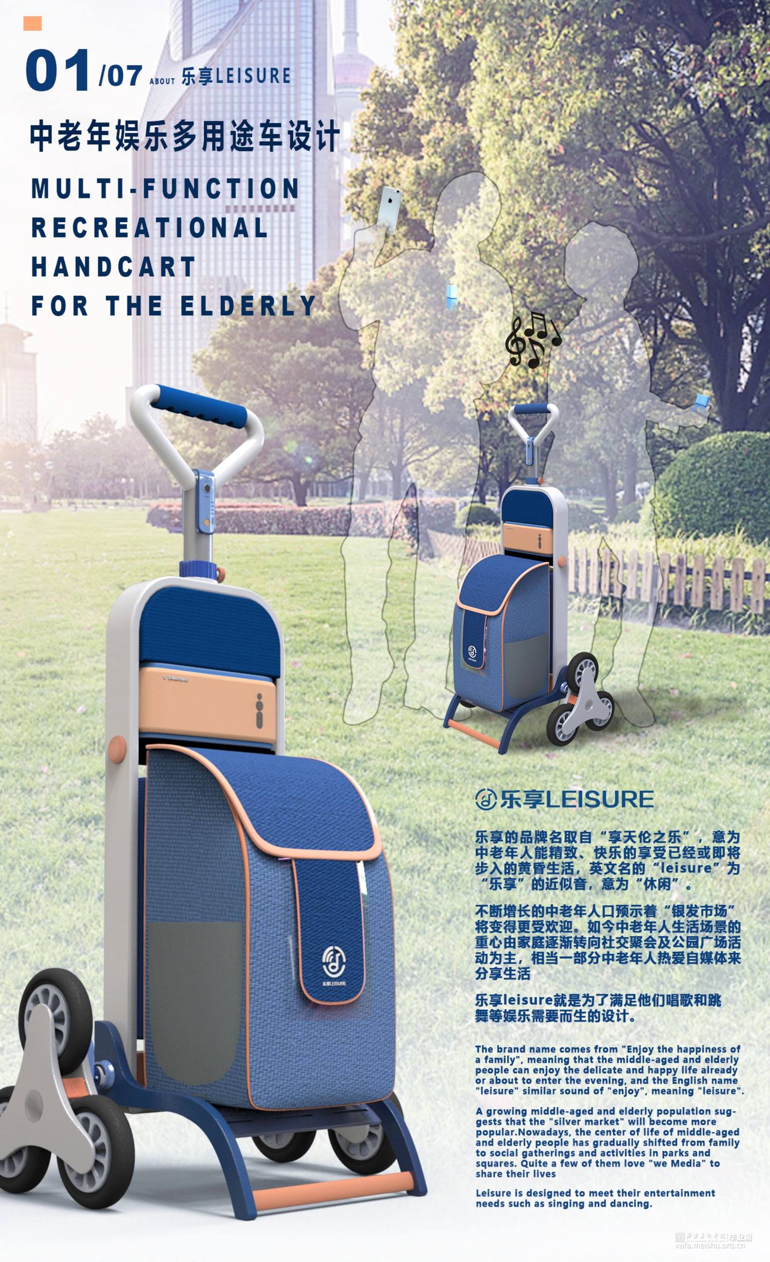 实体产品“乐享LEISURE娱乐多用途手推车”整车分为把手摄像组、可拆卸音响麦克风组、出行包组、车身支架几部分构成