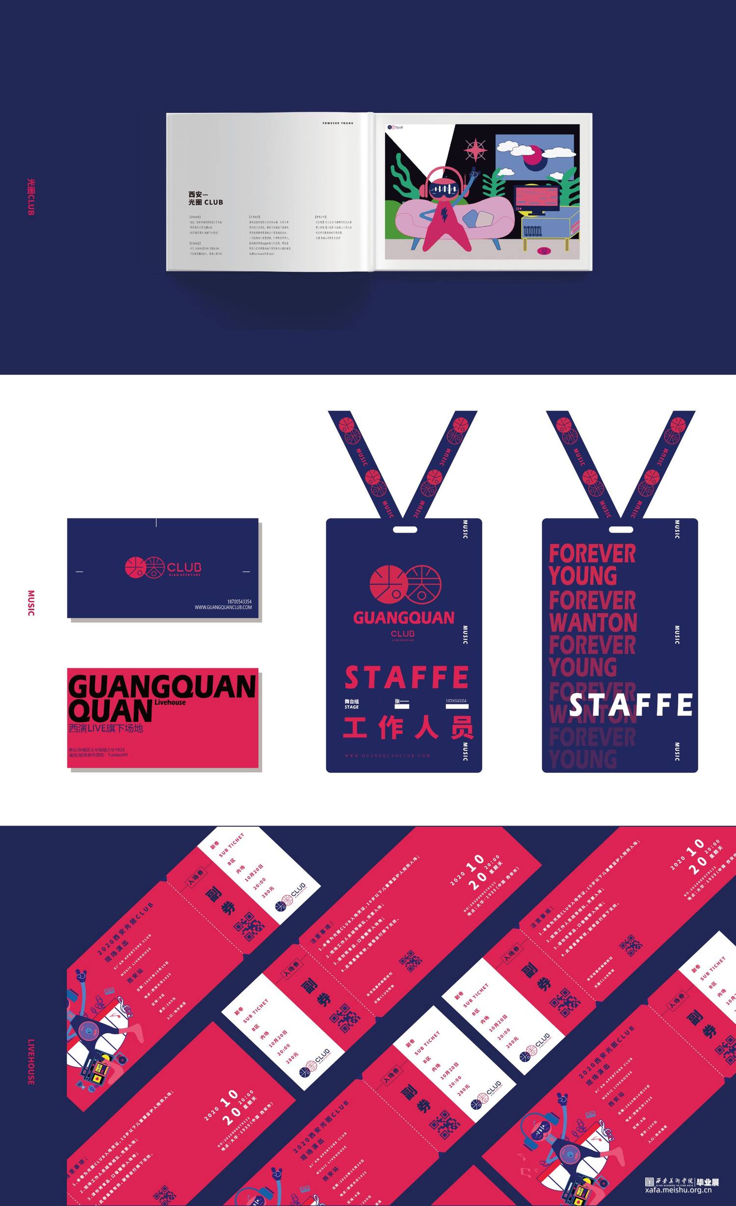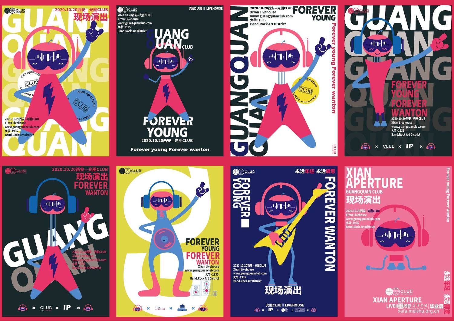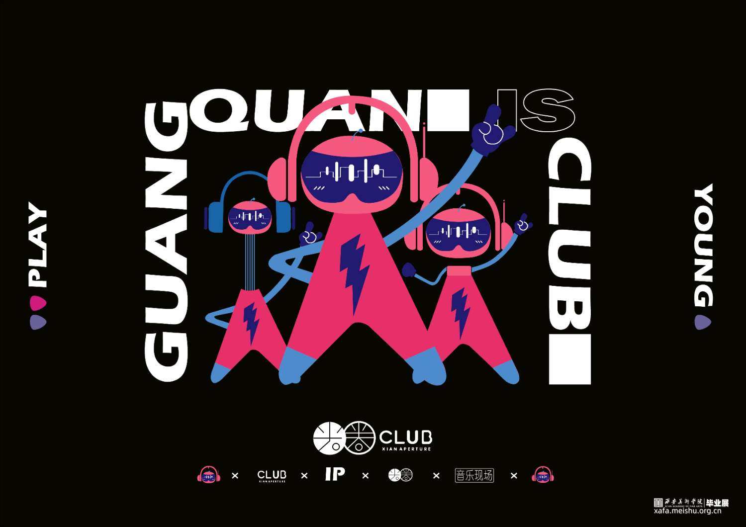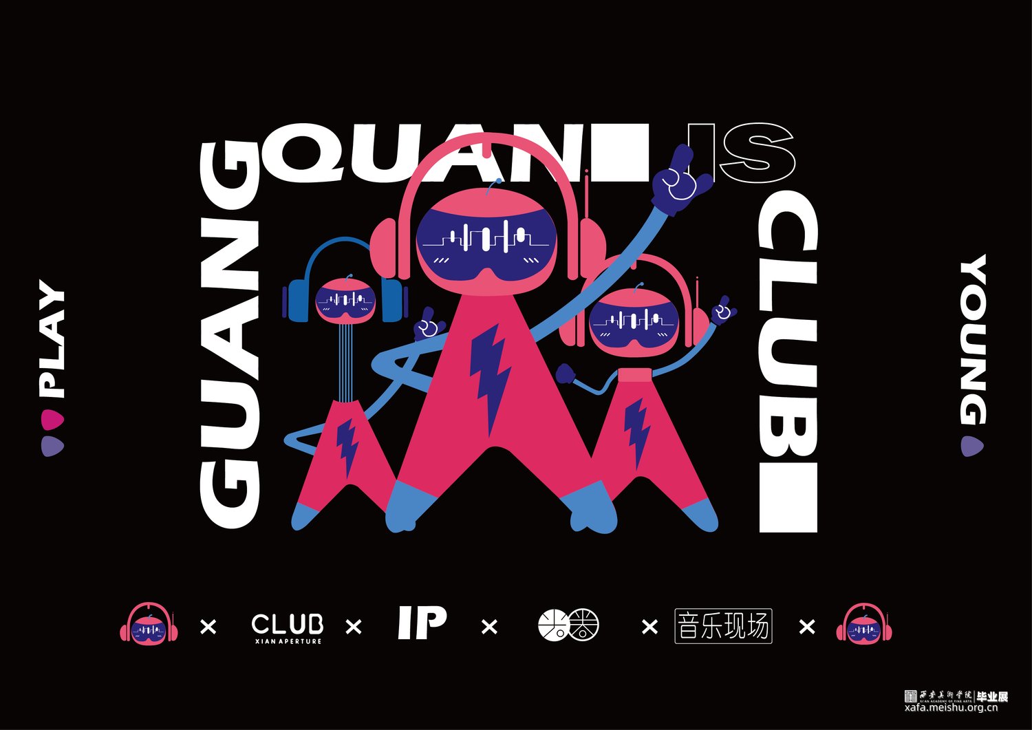 此次毕业设计的题目为“光圈club”,光圈club是一个现场演出的品牌。我们将品牌特色相关的元素以插画的形式加以表现,并结合一些地域文化元素,完成了品牌logo、IP、海报、动态视频等设计。尝试表达品牌的年轻与活力,为光圈club品牌赋予新的视觉感受。