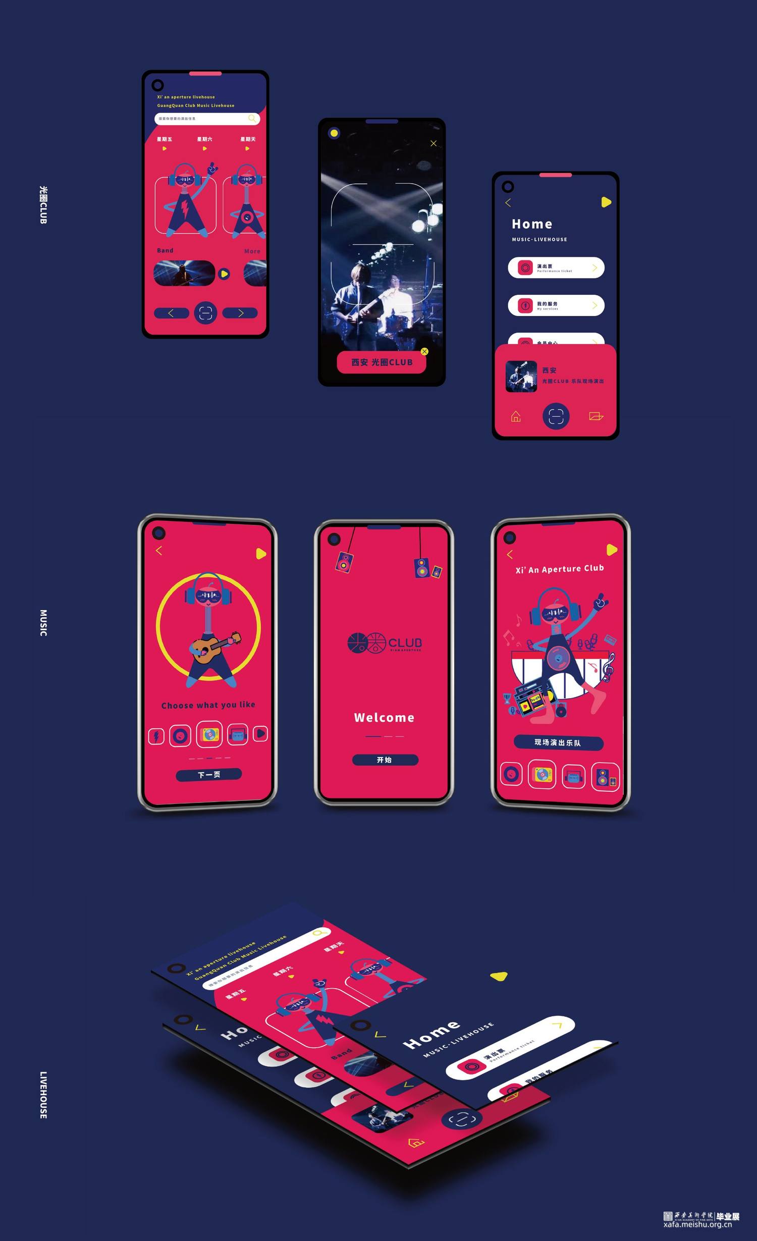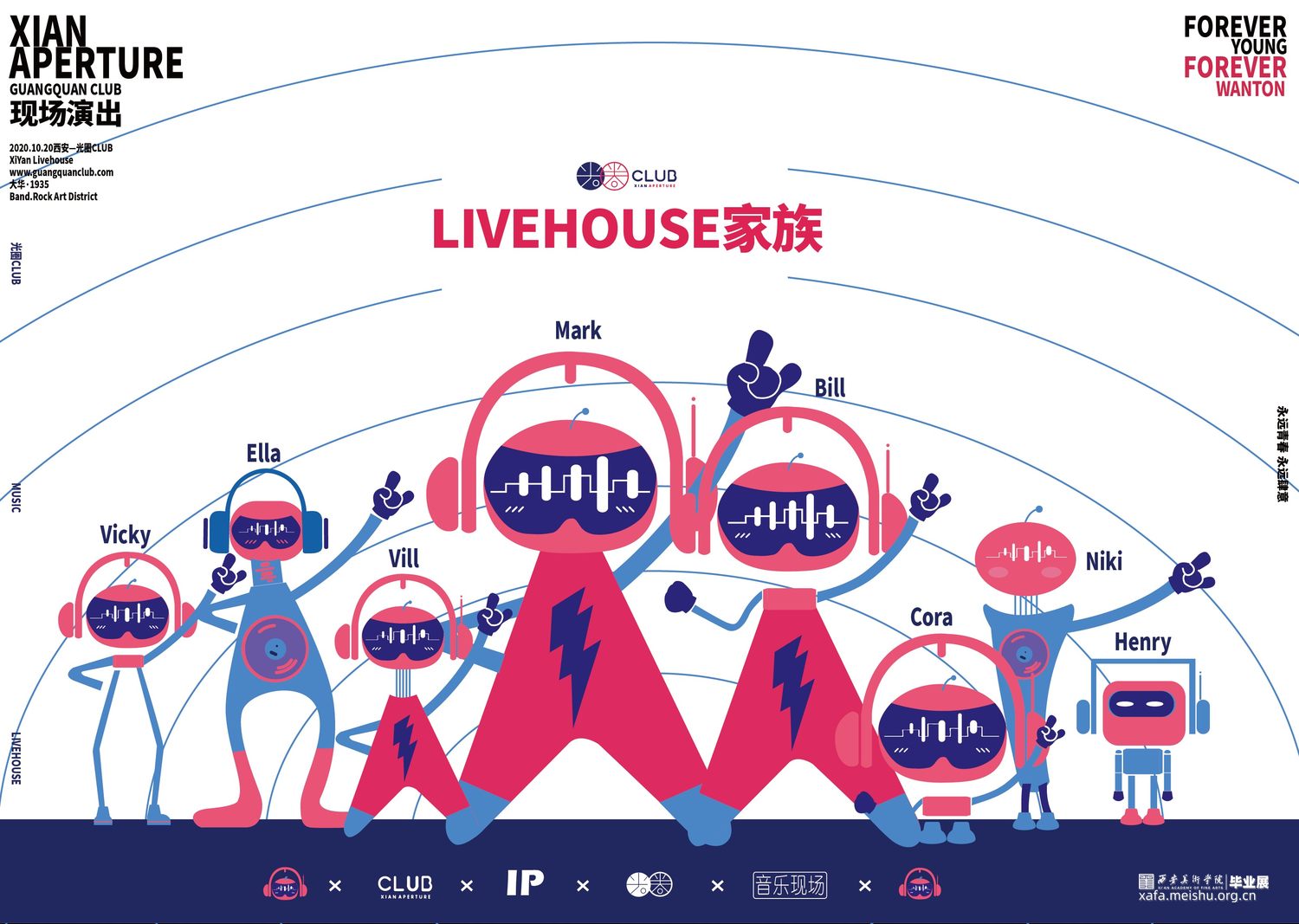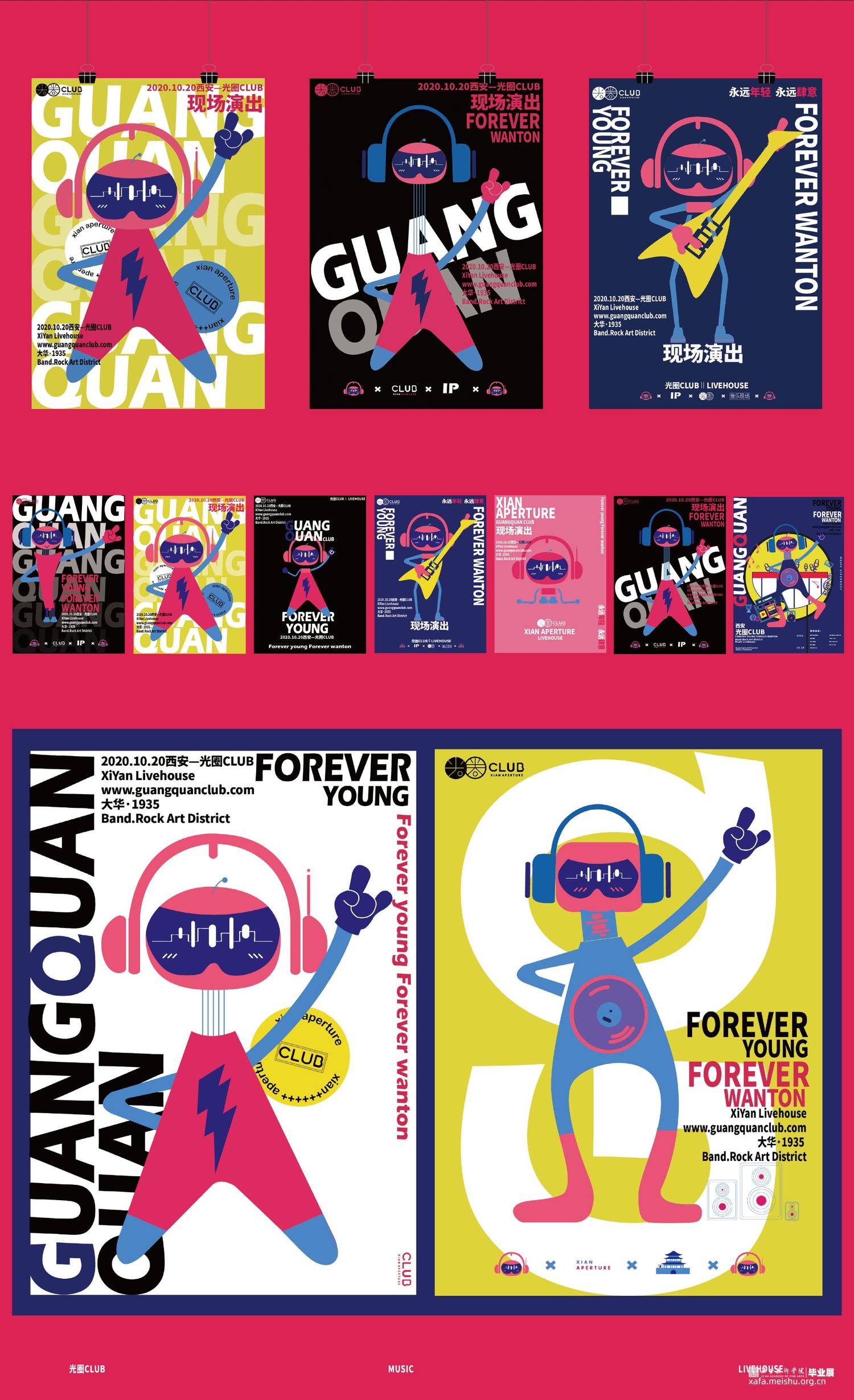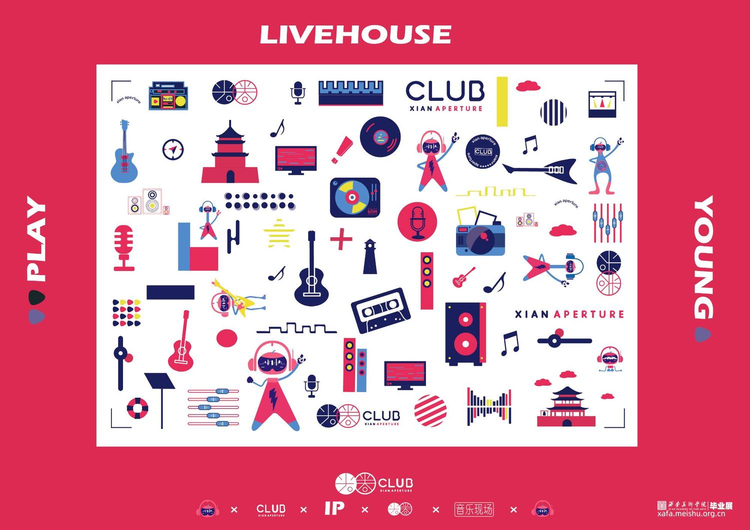 此次毕业设计的题目为“光圈club”,光圈club是一个现场演出的品牌。我们将品牌特色相关的元素以插画的形式加以表现,并结合一些地域文化元素,完成了品牌logo、IP、海报、动态视频等设计。尝试表达品牌的年轻与活力,为光圈club品牌赋予新的视觉感受。