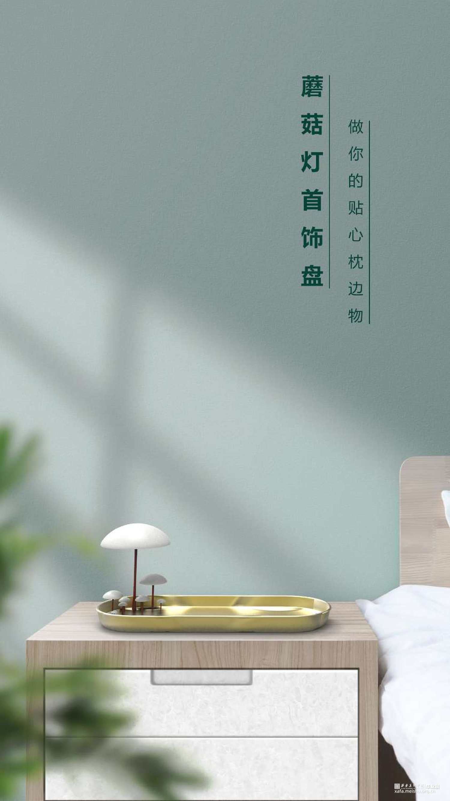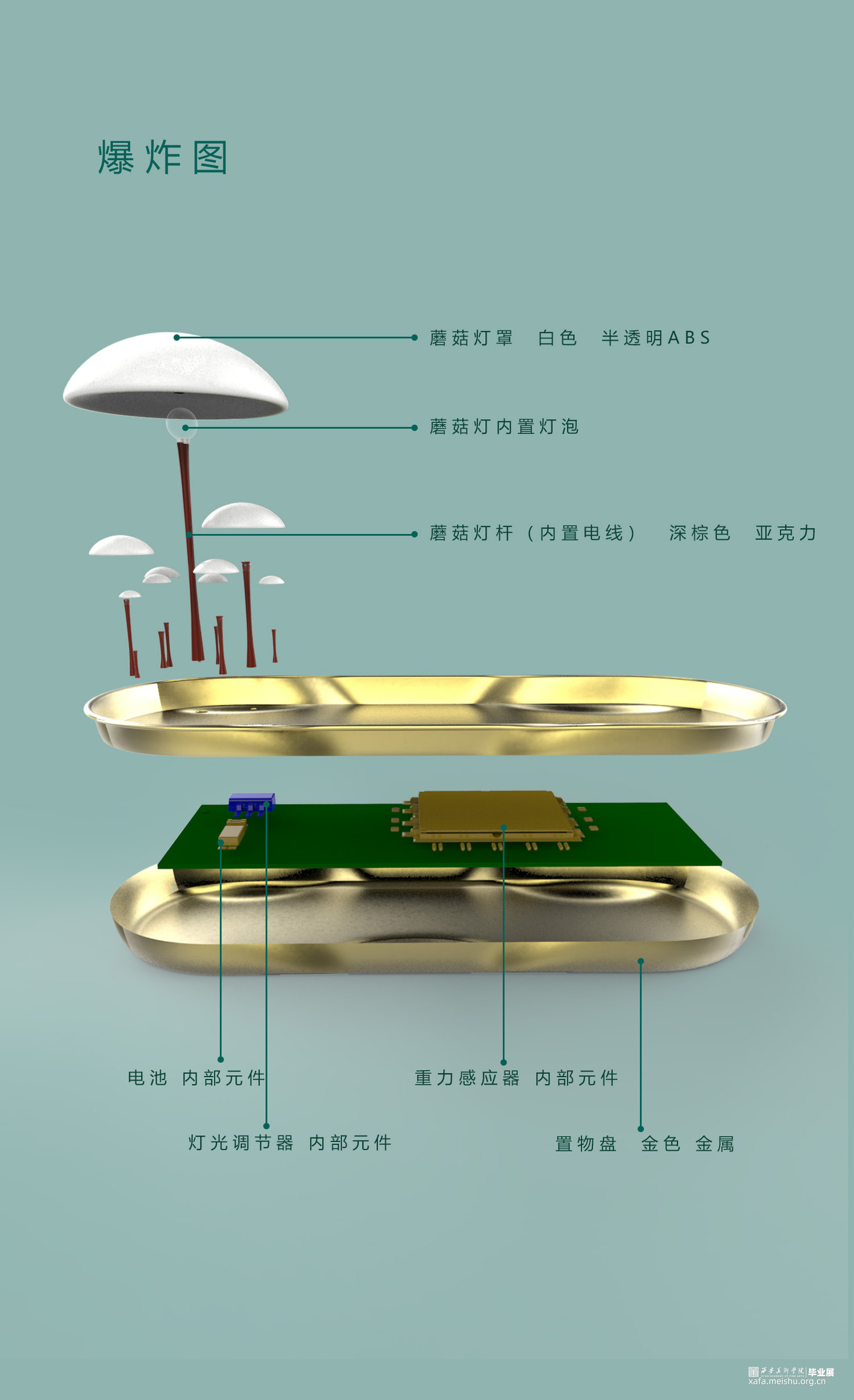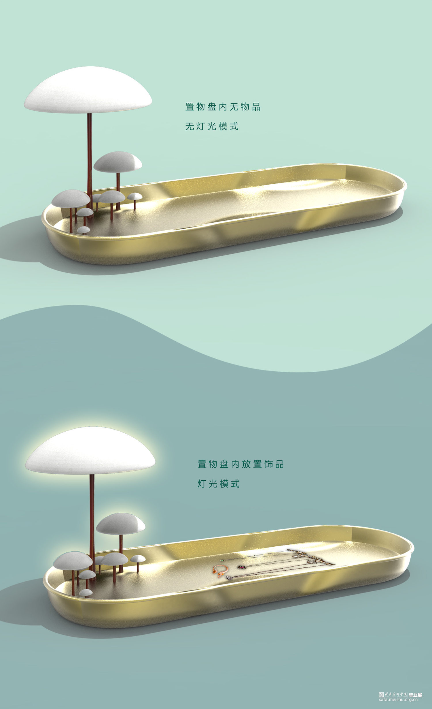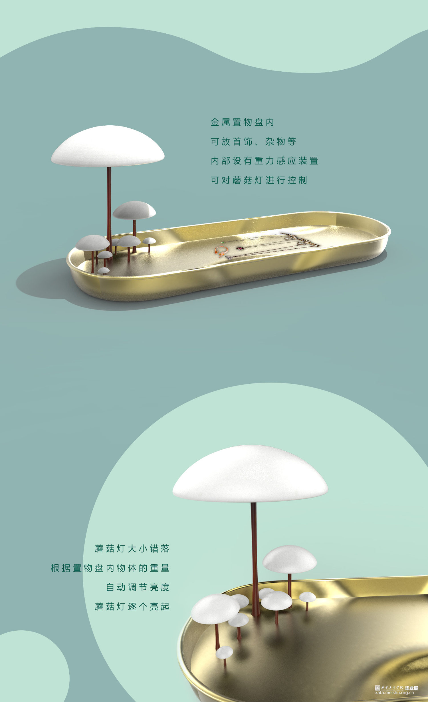 2)蘑菇首饰盘:蘑菇为发光单元,盘子表面可放置首饰,内部置有重力感应原件,随着放在盘子上的饰品增多、重量增加,蘑菇越来越亮(或发光的蘑菇越来越多)。