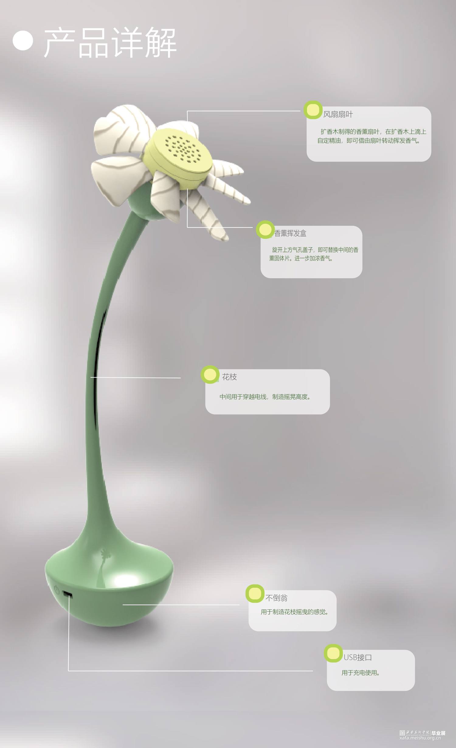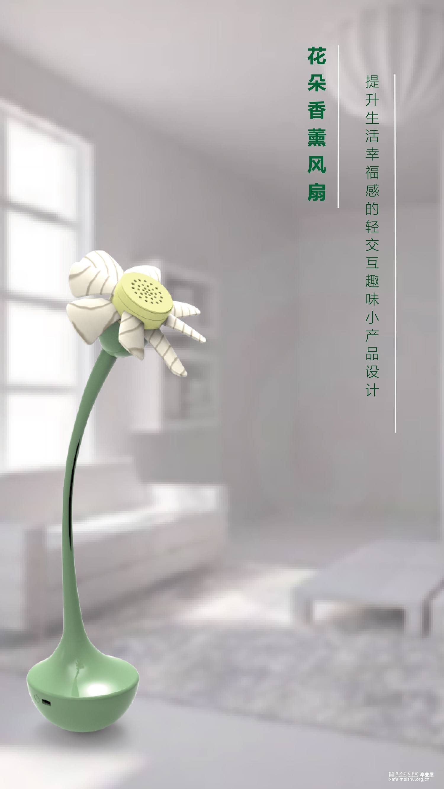 3)花朵香氛风扇:内置距离感应器,人一接近就自动转动开始工作,同时左右摆动(模拟真实自然环境中花枝摇曳的状态)。扇叶为括香木材质,将香水滴在扇叶上,就可以扇出具有香味的风。