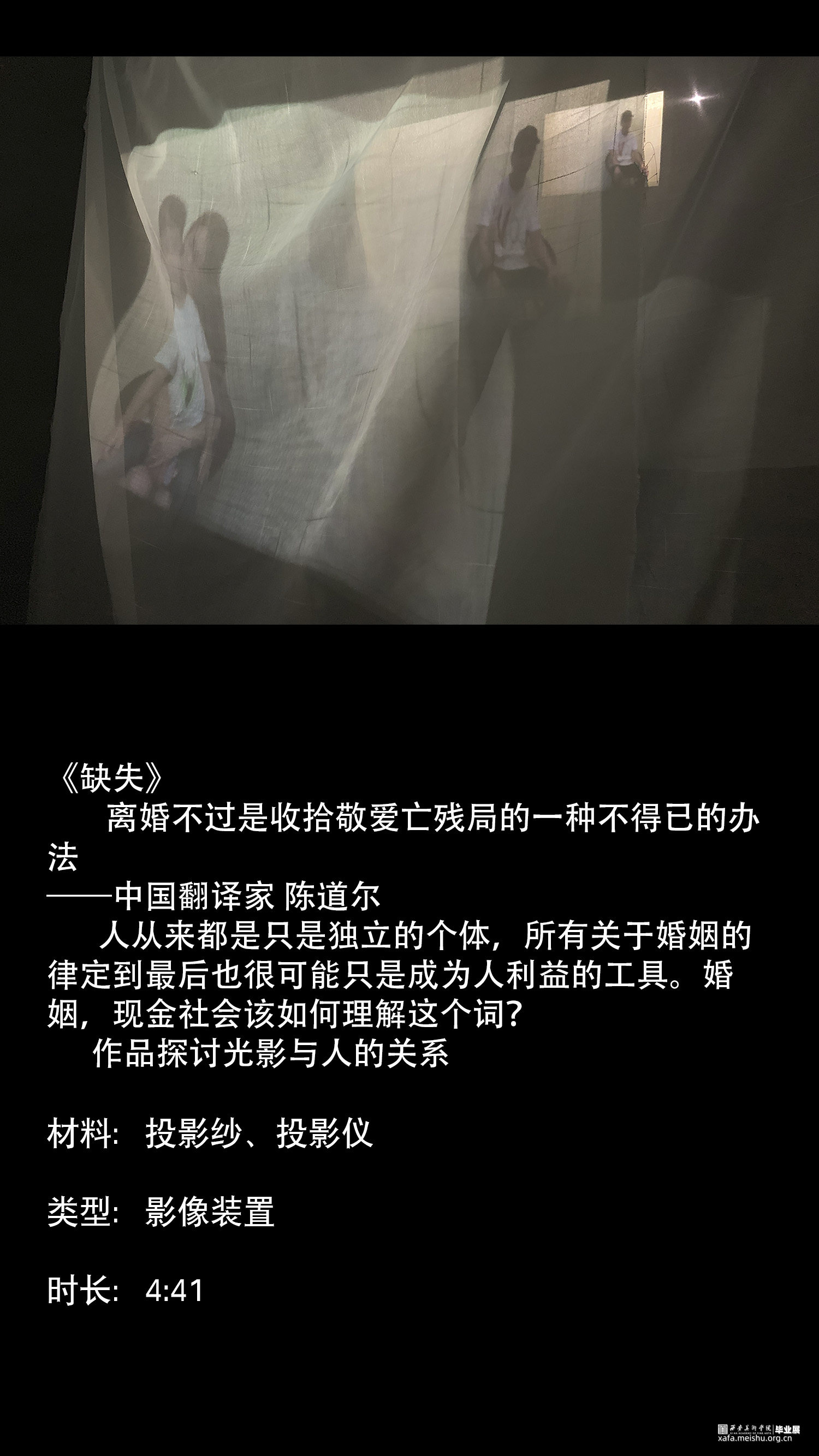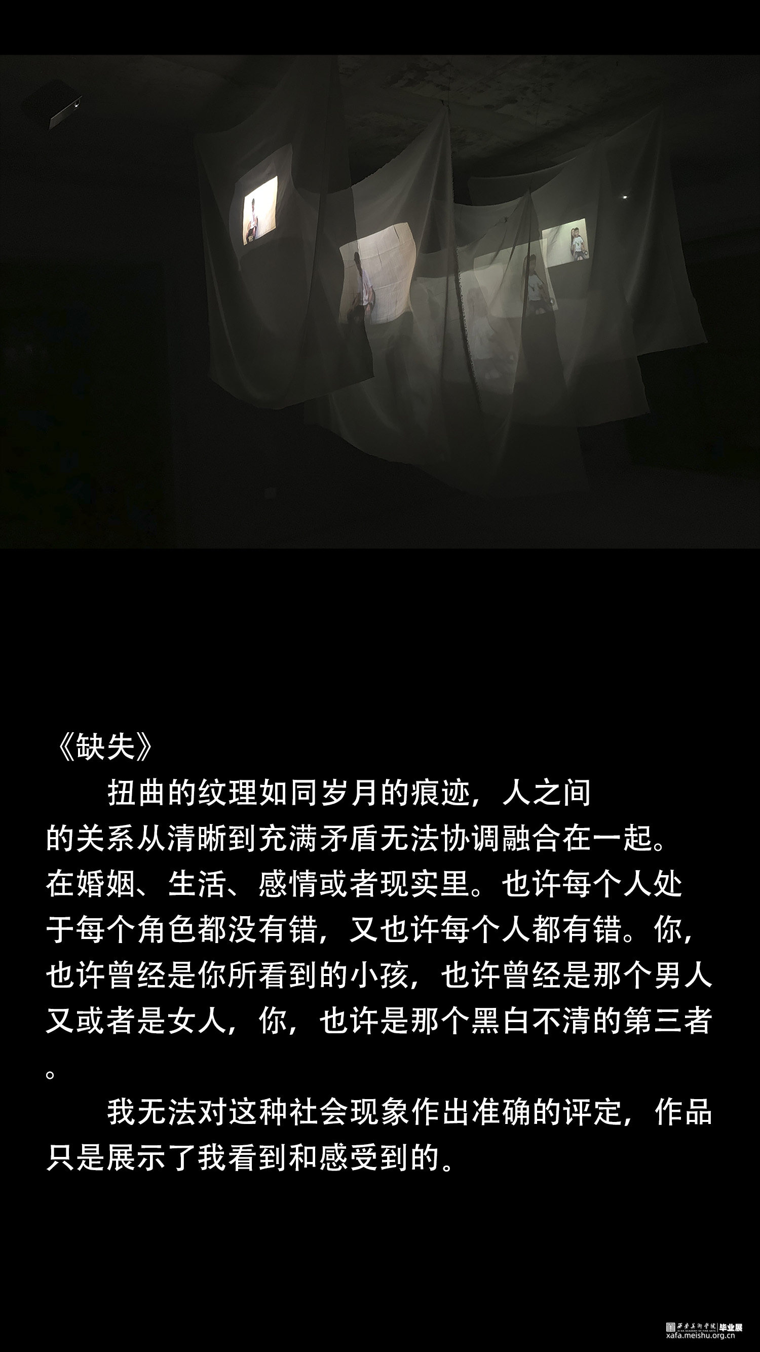 第一部分是刘俊而的影像装置,使用的投影纱与投影仪;作品两端都设置了一个投影仪,两边的影像都不相同,投影纱是多层的,然后投影随着投影纱层层减弱,在中间的时候,两边的图像重叠在一起并且影像比较不清晰。