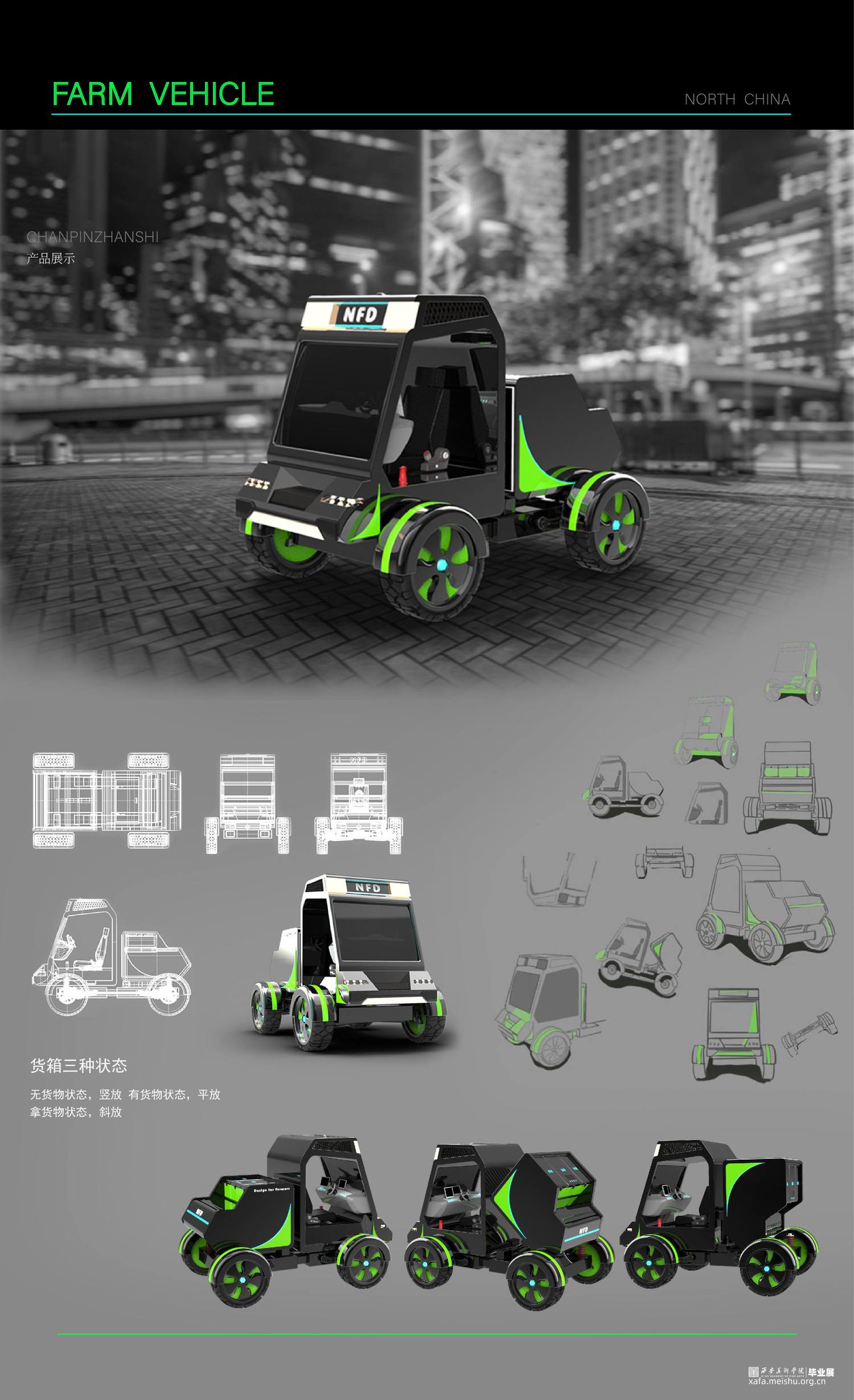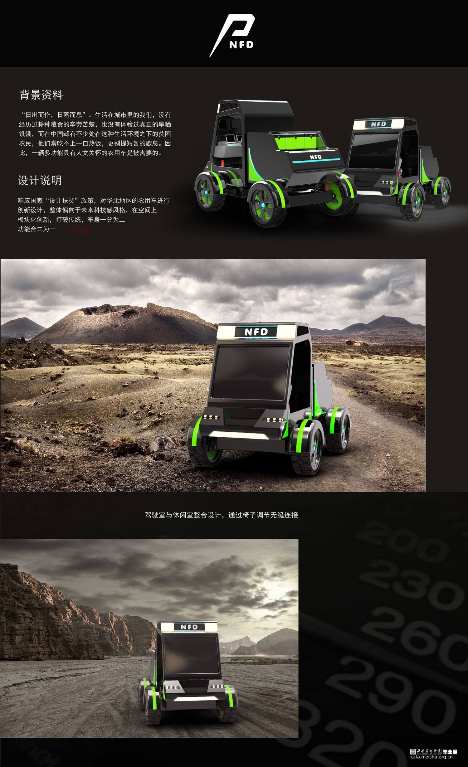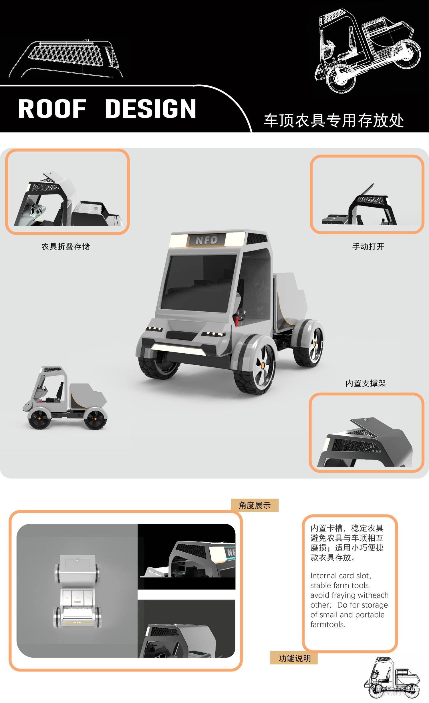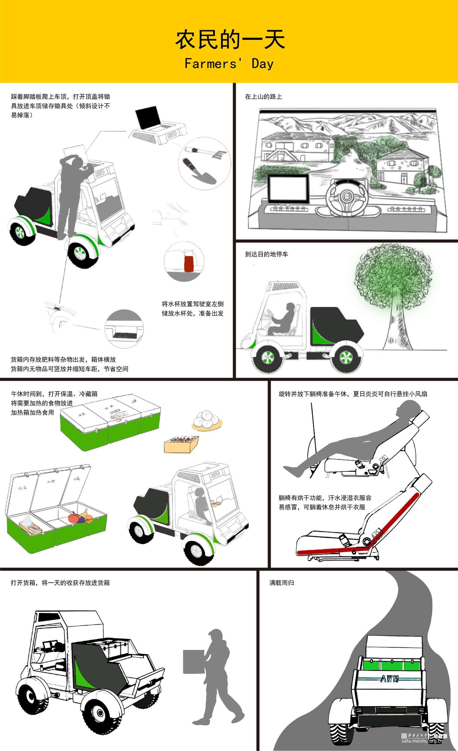 “日出而作,日落而息”。生活在城市里的我们,没有经历过耕种粮食的辛劳苦楚,也没有体验过真正的旱晒饥饿,而在中国却有不少处在这种生活环境之下的贫困农民,他们常吃不上一口热饭,更别提短暂的歇息。因此,一辆专为解决贫困地区农民外出干农活吃不上热饭且无法拥有良好环境进行休息的问题而设计的一款多功能、适用于山地路况的四轮农用车是被需要的。